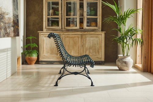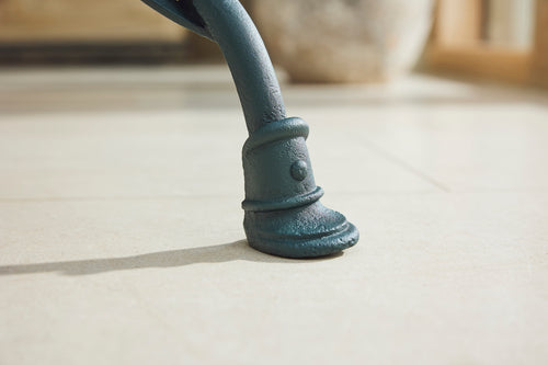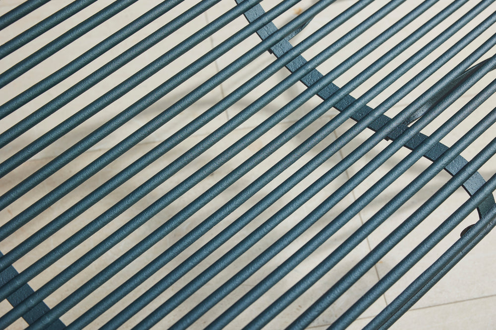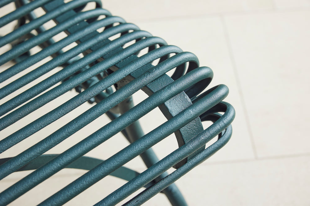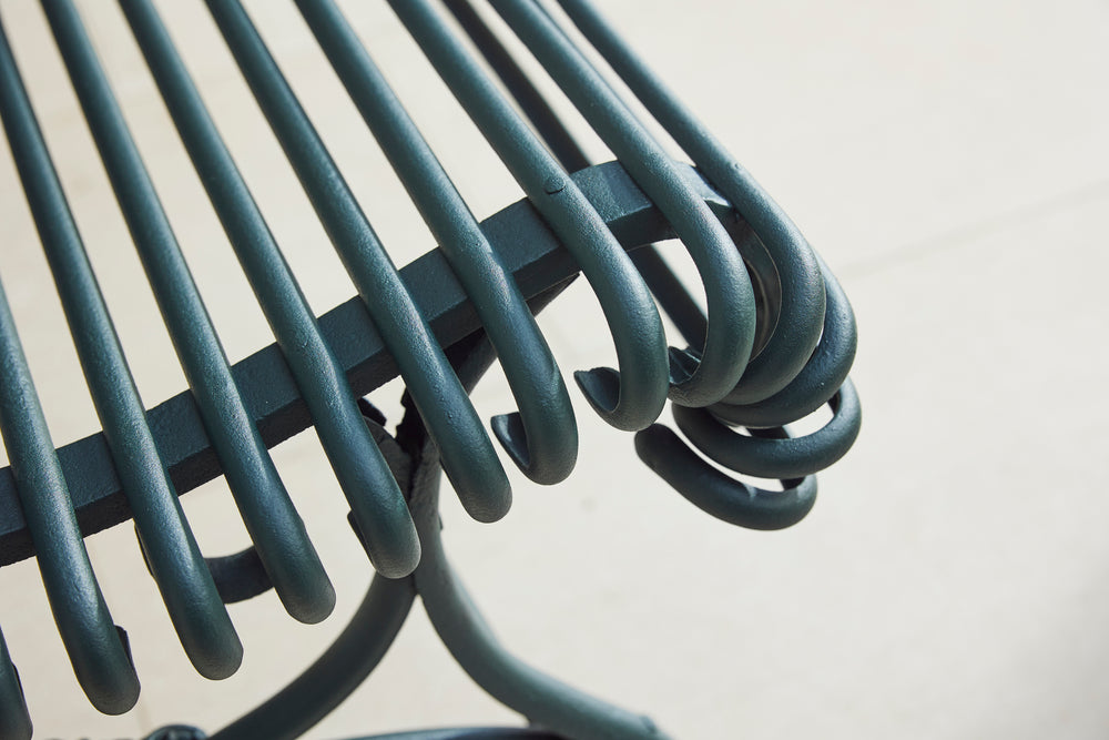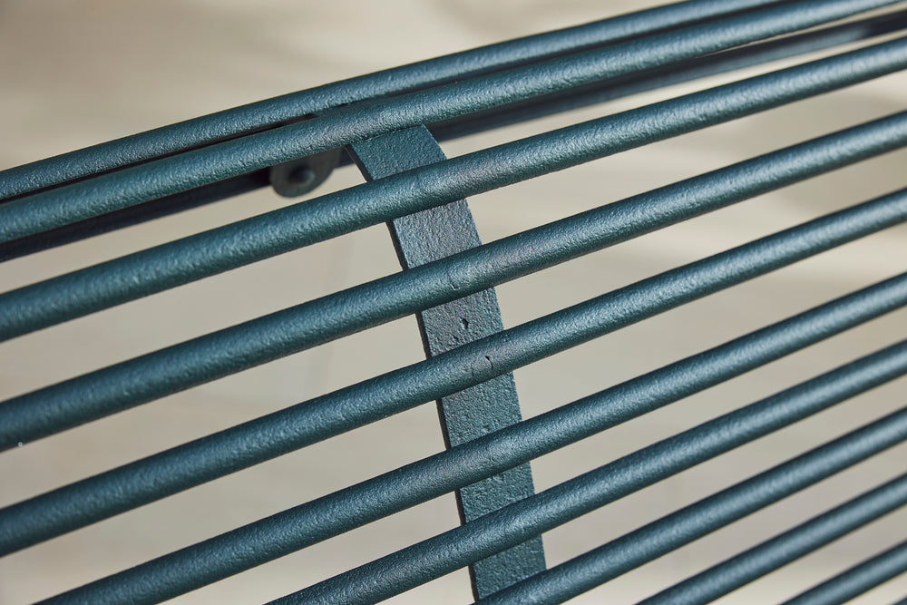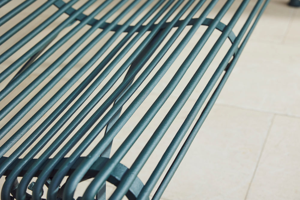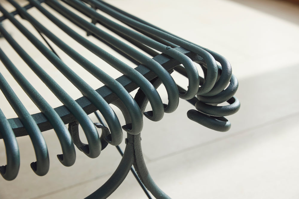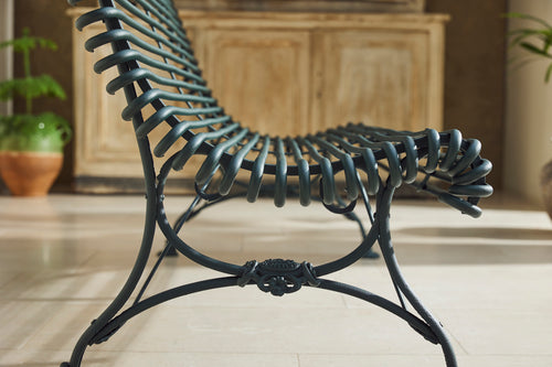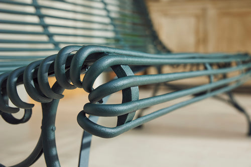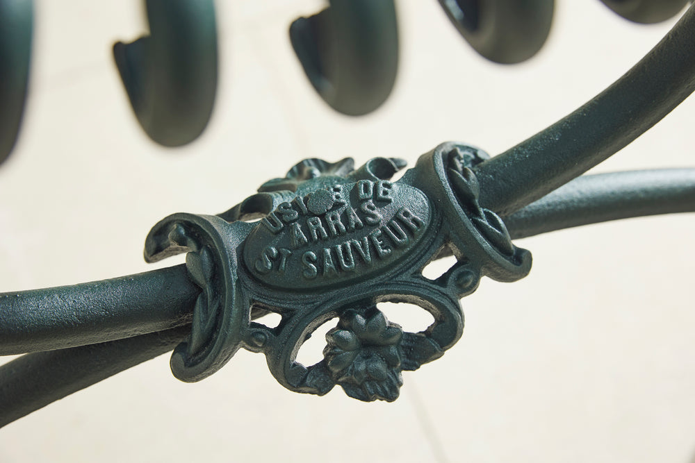 An attractive three-seater Arras bench. This original bench was manufactured Grassin Baledans in the early 20th century. The hoof feet are typical of Arras furniture of this period as is the attractive emblem at each end of the frame This bench which is in very good condition is made from the patented half-round hollow wrought iron that characterises this collectable make which would look great in either a contemporary or traditional garden.