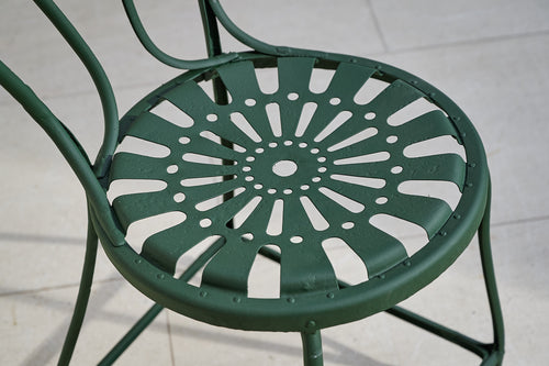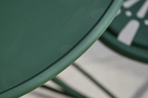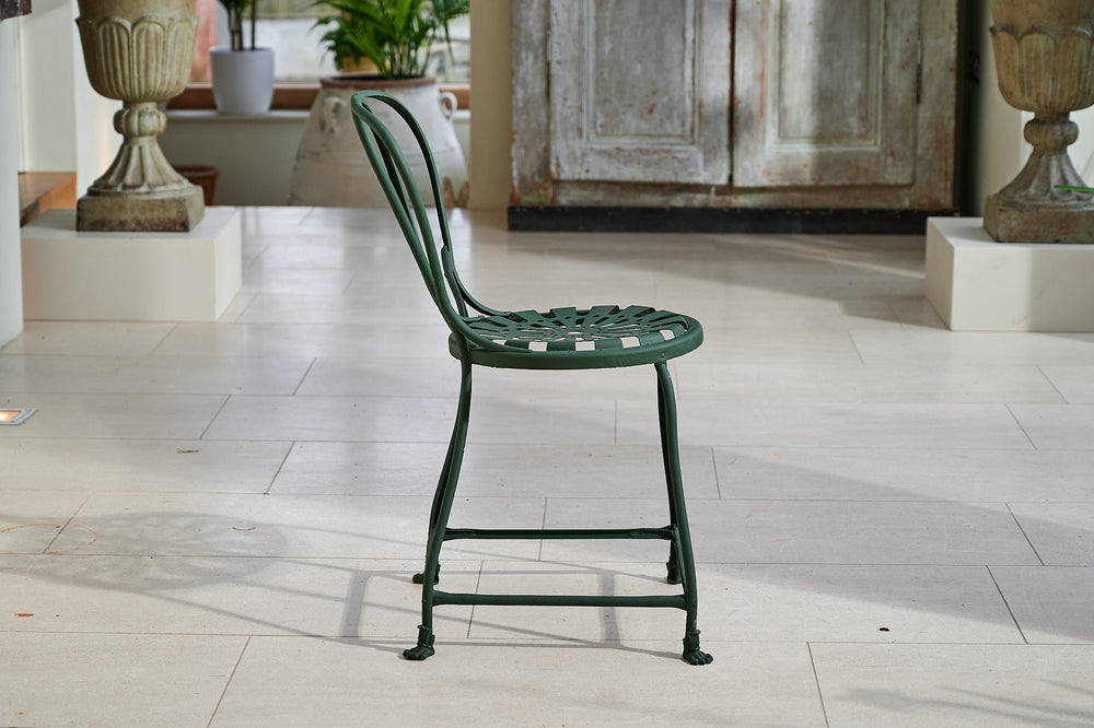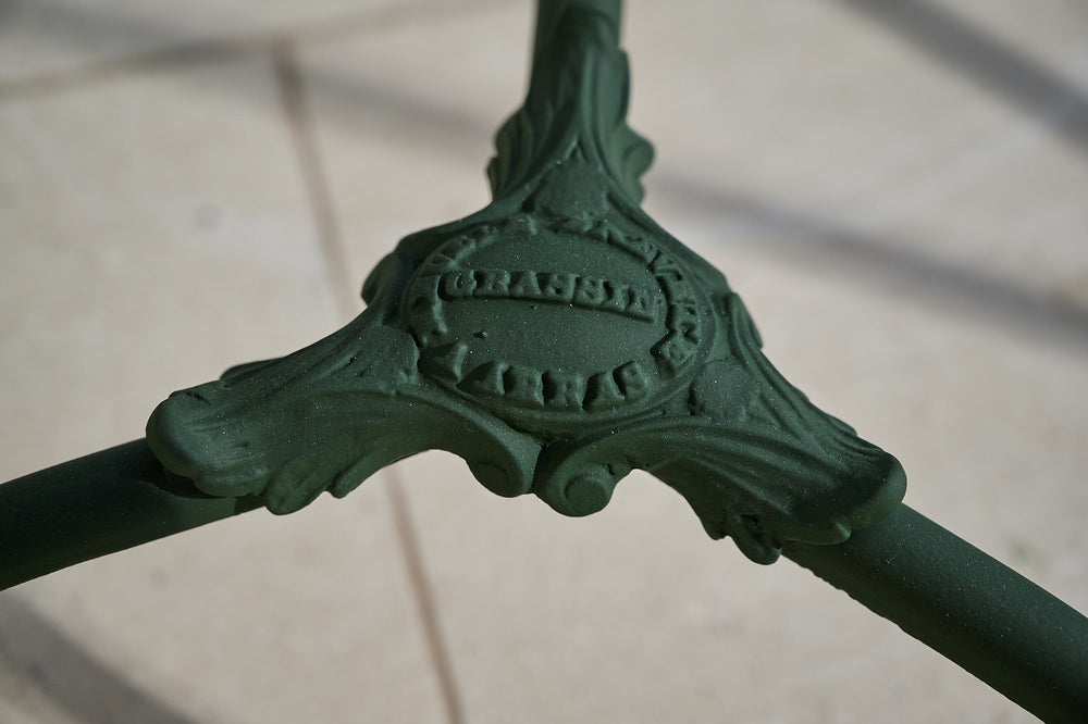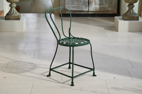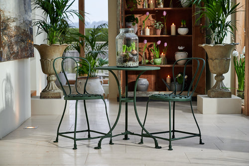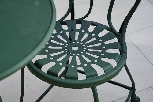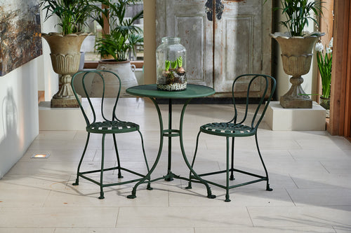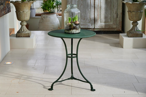 A lovely matt green Arras bistro set in very good condition having been fully restored by us. The small round table, perfect for dinner for two, has three elegantly curved legs. Both the table and chairs have the distinctive lion's claw feet, typical of all late 19th century Arras furniture.