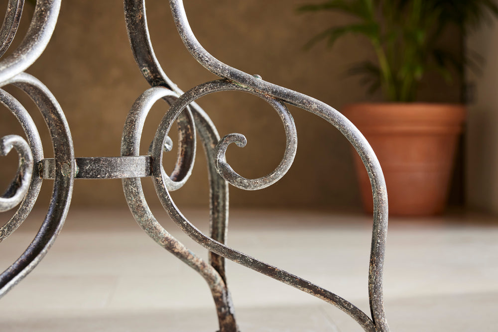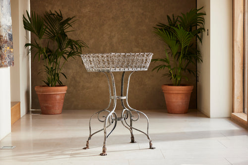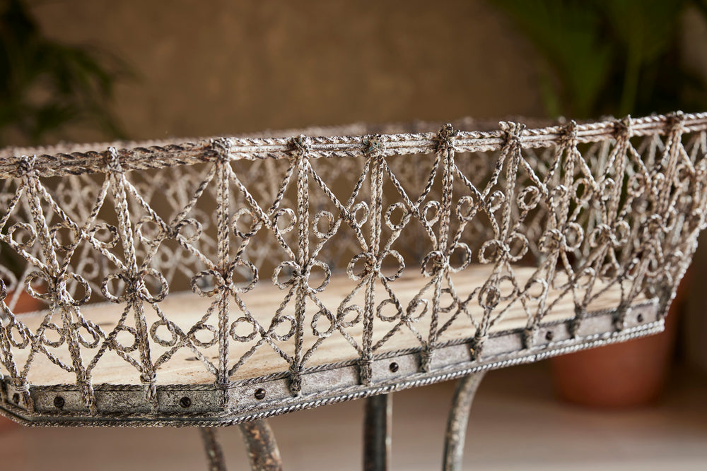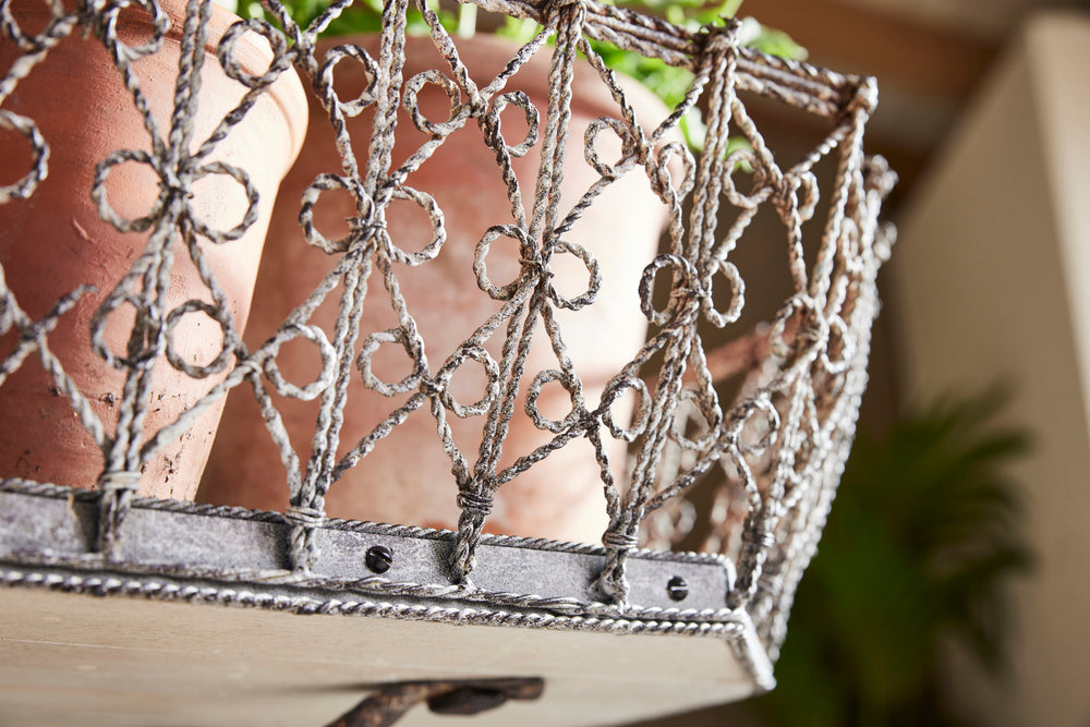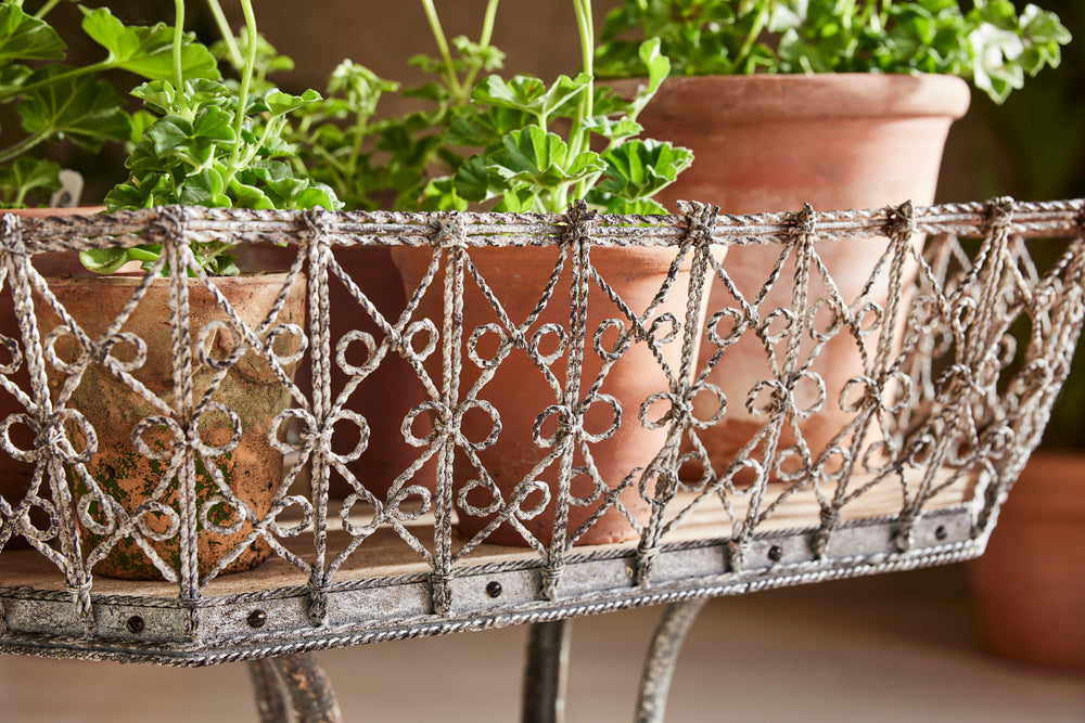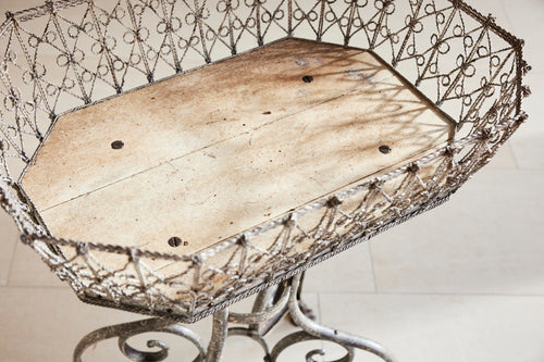 A really lovely Arras Jardiniere sitting on a strong wrought iron stand. The wire-framed lattice basket at the top is in unusually good condition and has a wooden base fixed to the stand.