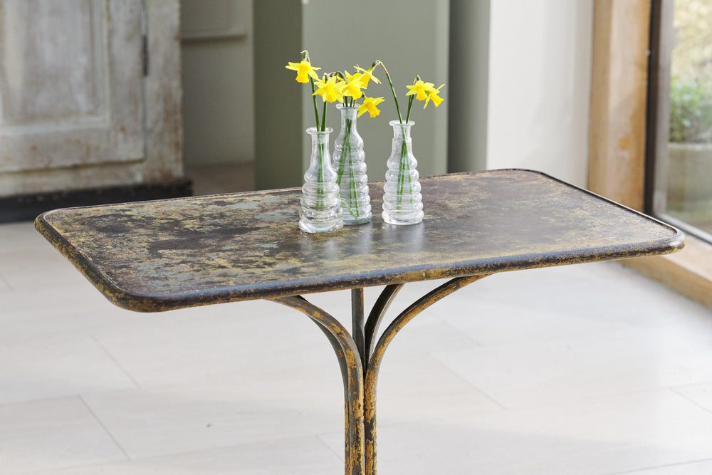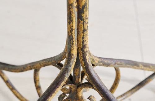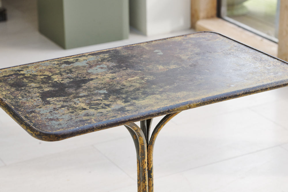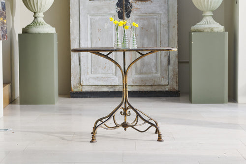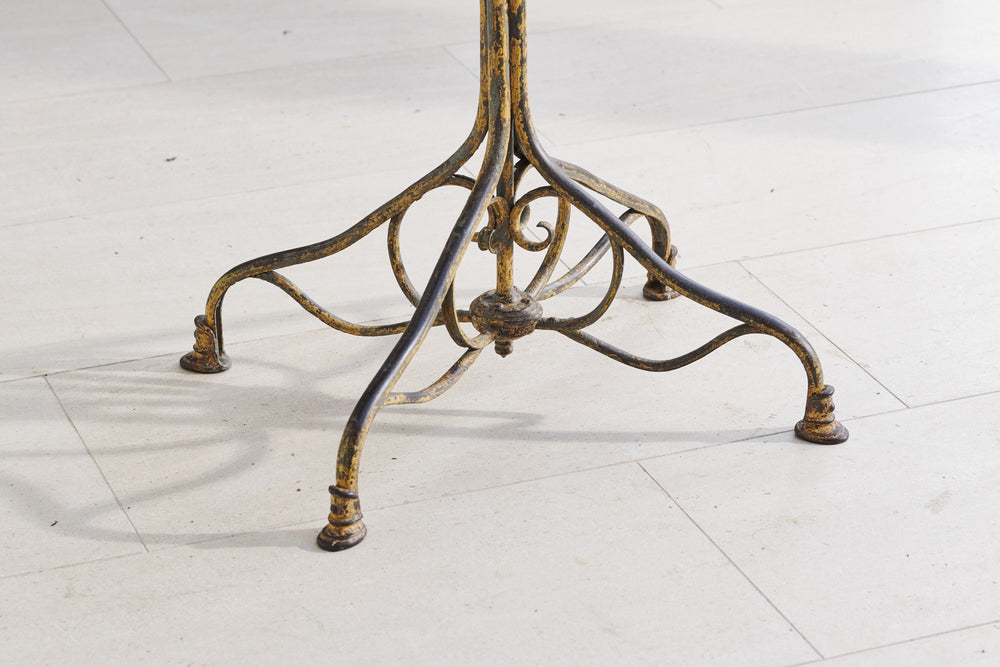 A very attractive wrought iron Arras table that has developed a wonderful painted patina with contrasting colours from decades of overpainting. The classic hoof feet date the table to around 1900. It is in excellent condition and although originally designed for the garden would look great as a contrast to soft furnishings inside the home.