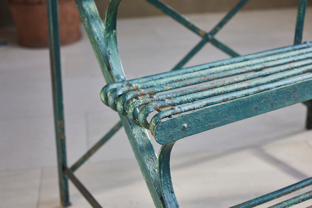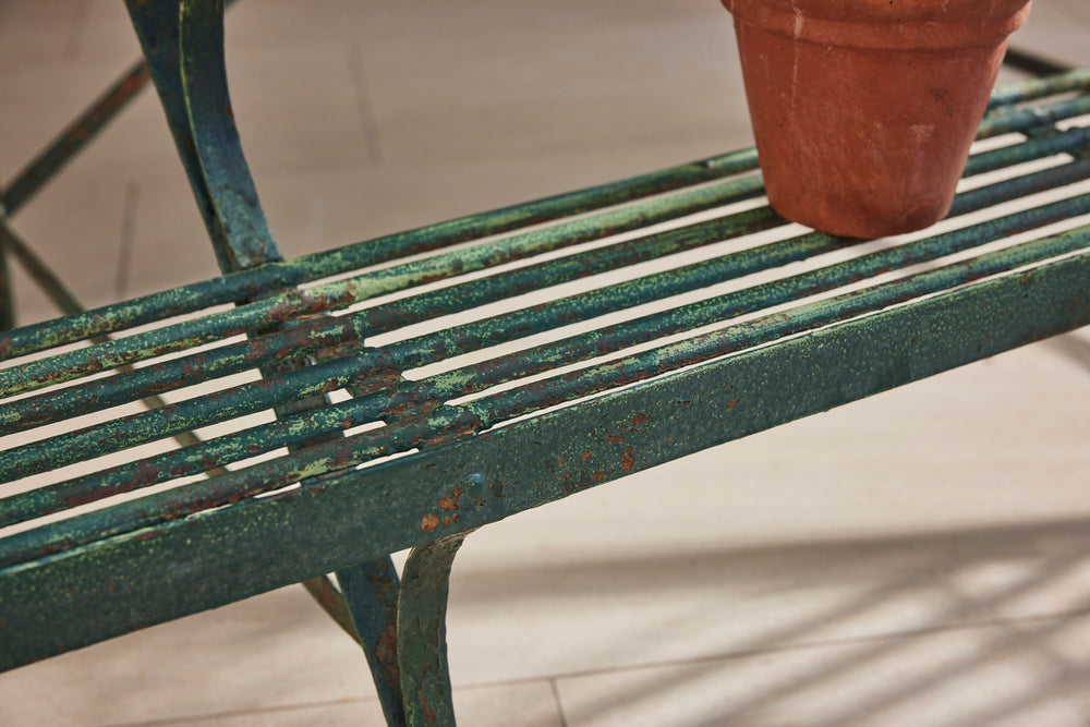 This folding 4-tier Arras plant stand retains its original green paint and features elegant horse's hoof feet
