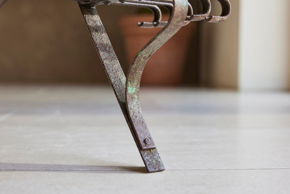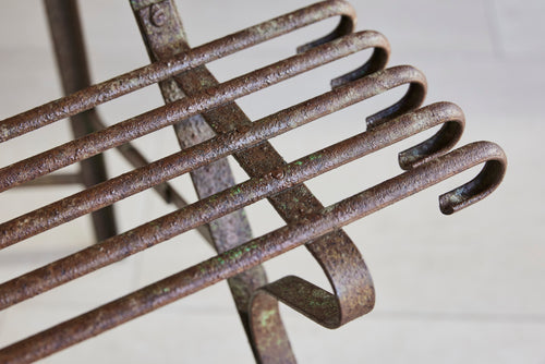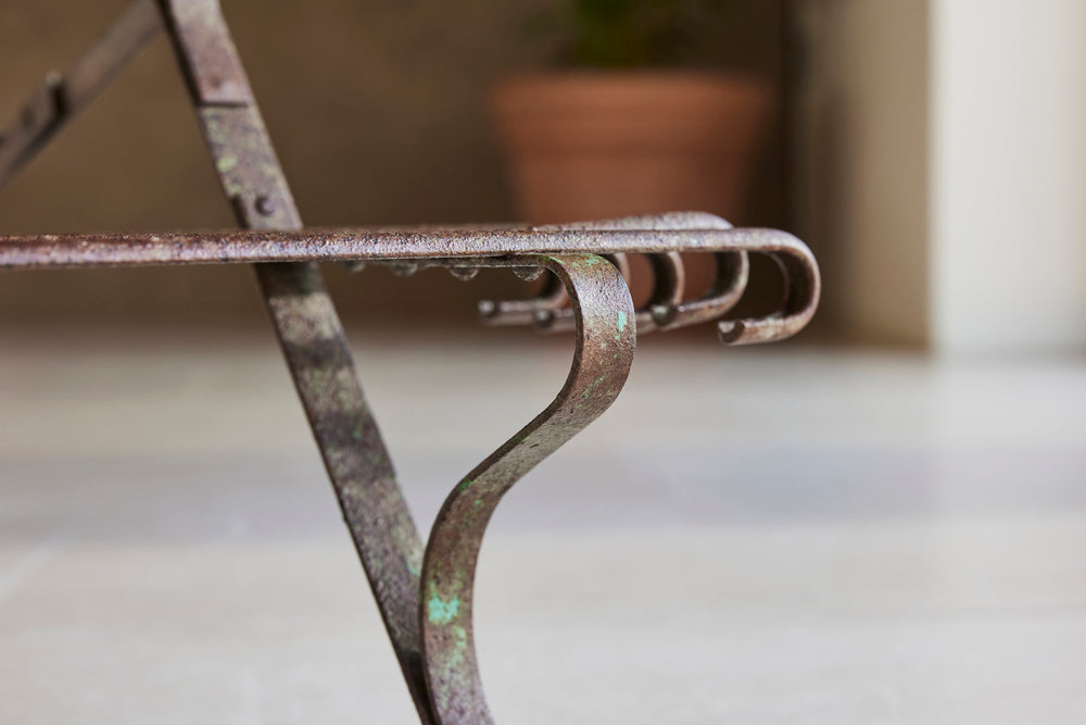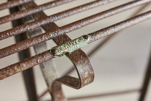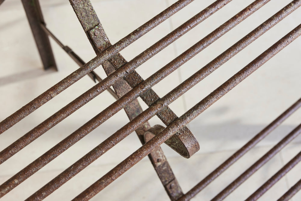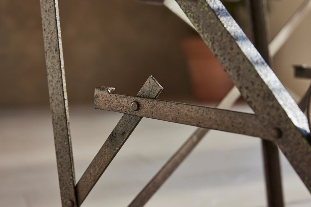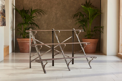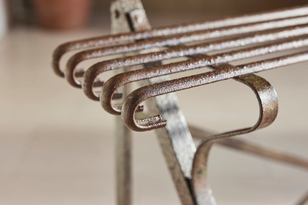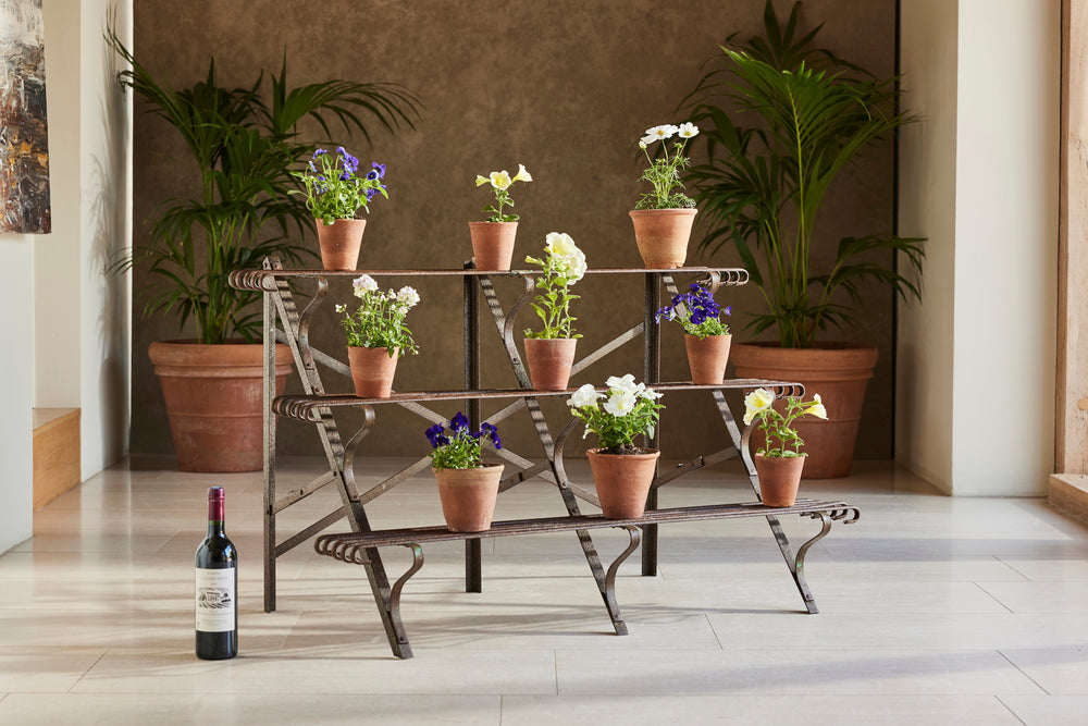 An Arras folding plant stand with three tiers. This one was originally designed to be a practical item most likely in a greenhouse. This model by Grassin Baledans was made in the early 20th century using wrought iron semi-hollow tubes and is in very good condition and is a character item for creating floral displays.