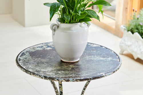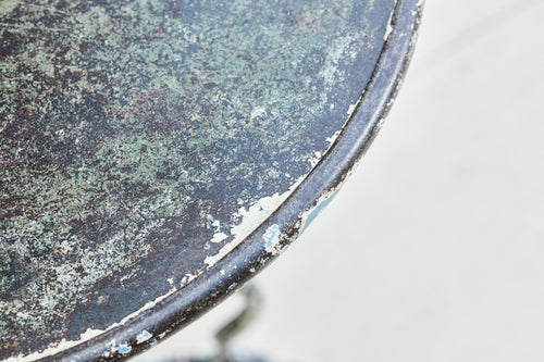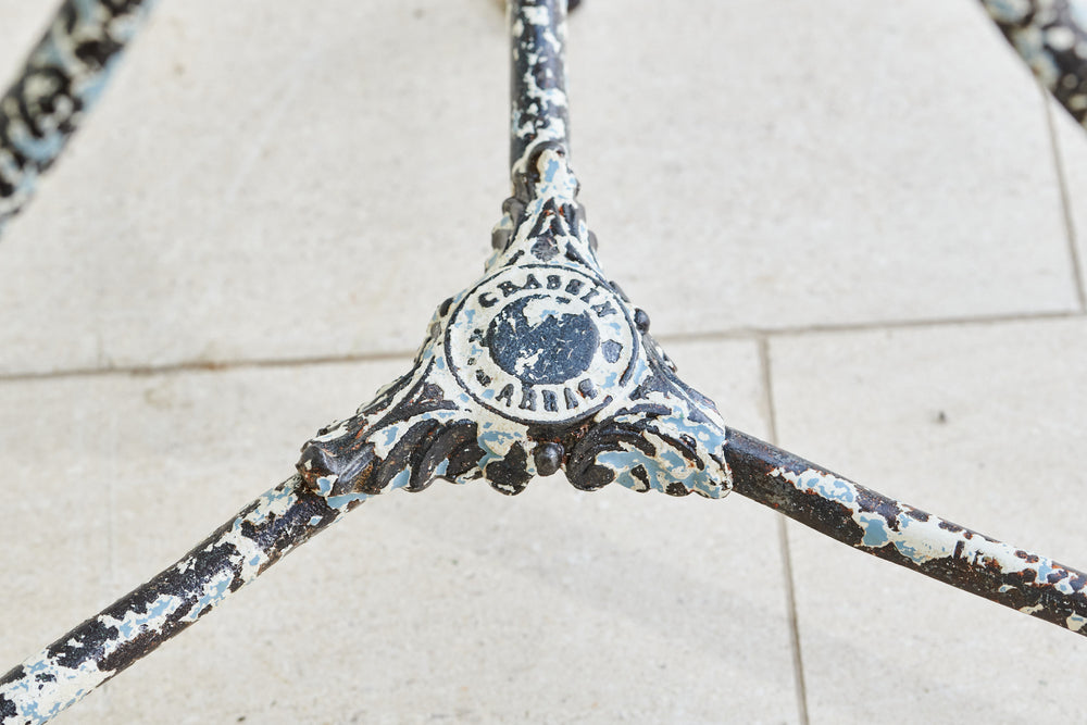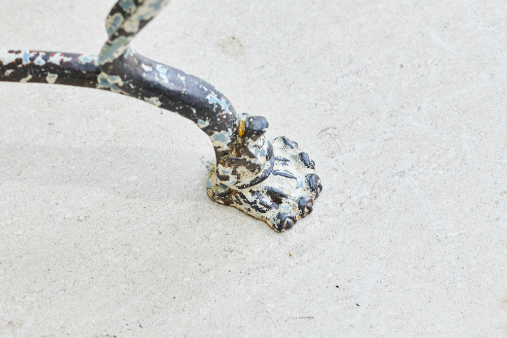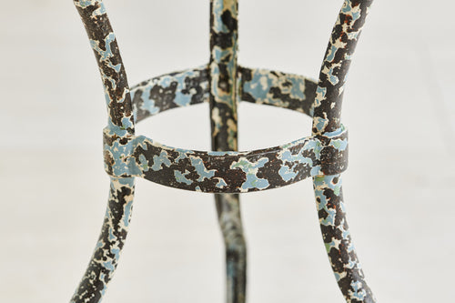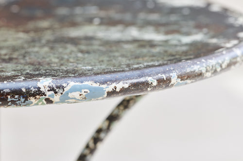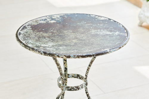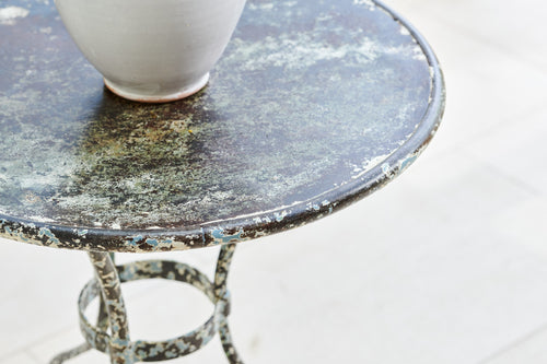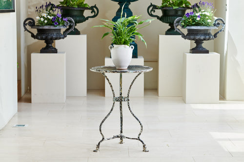 A small round Arras table with beautifully curved legs. Hand-forged in the mid 19th century this wrought iron table would make a very attractive side or occasional table. It is in very good condition and has a lovely painted patina. The lions claw feet and the manufactures plaque built into the frame adds to its interest.