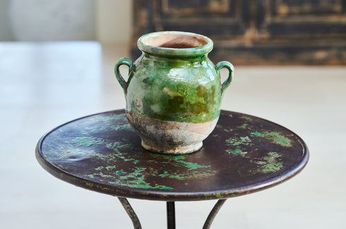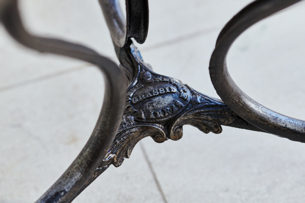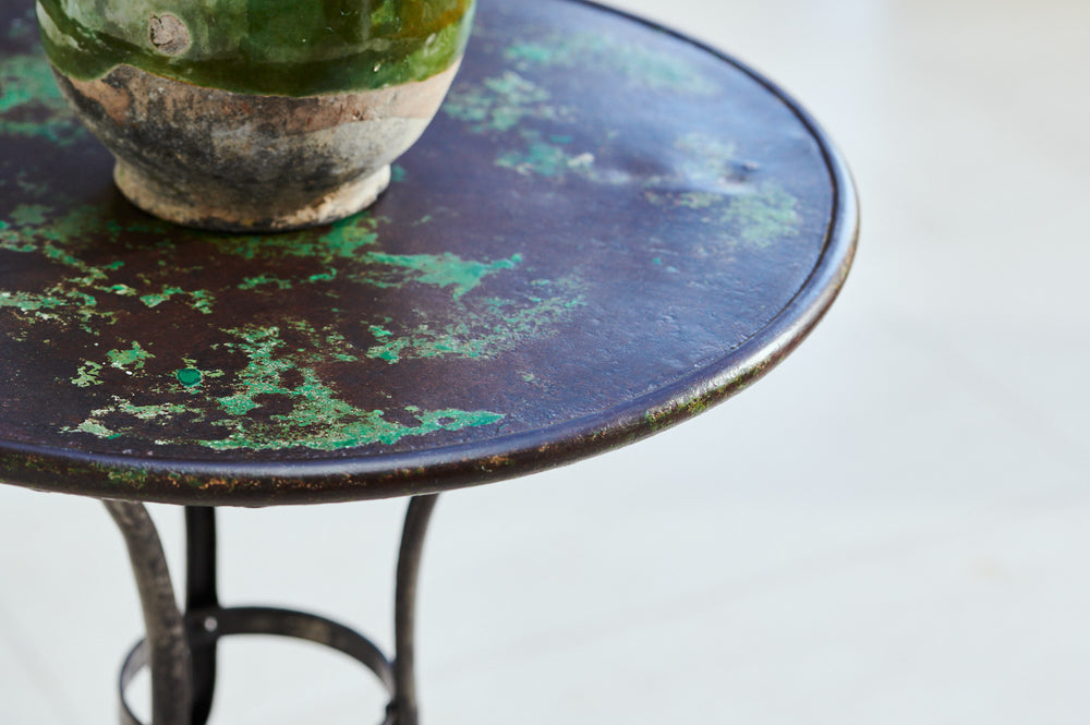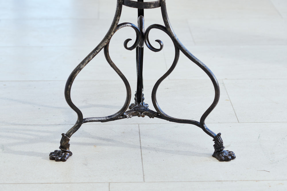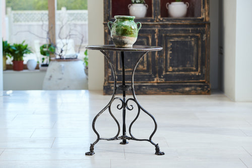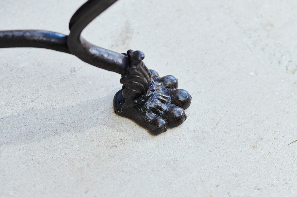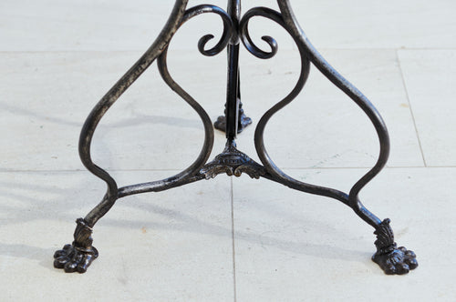 A small round Arras table with beautifully curved legs. Hand-forged in the mid 19th century this wrought iron table would make a very attractive side or occasional table. It is in very good condition and has a lovely painted patina. Large lions claw feet and the manufactures plaque built into the frame adds to its interest.