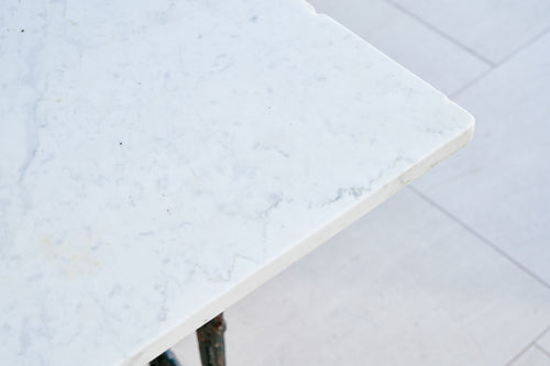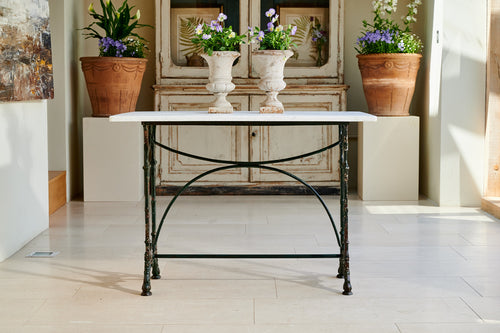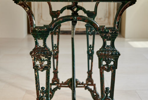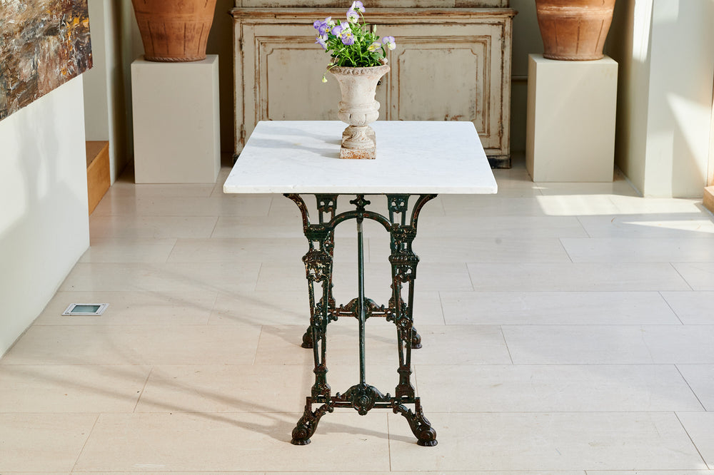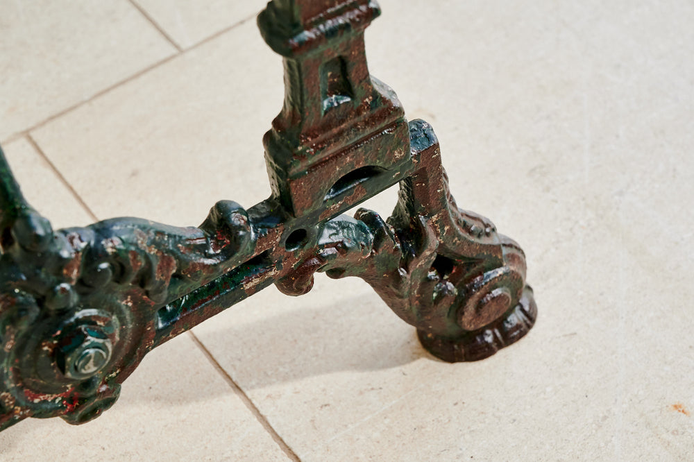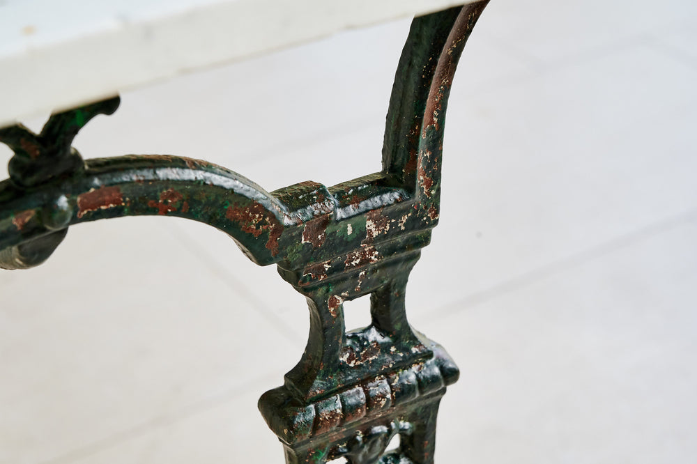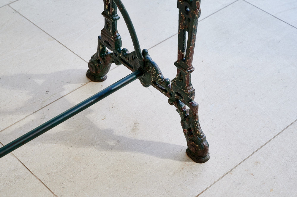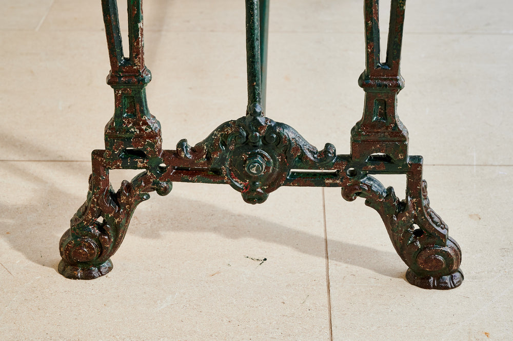 A French table with an art deco design wrought iron base and a marble top. In its original dark green paint it would easily sit 4 whilst also making an interesting corner or side table.