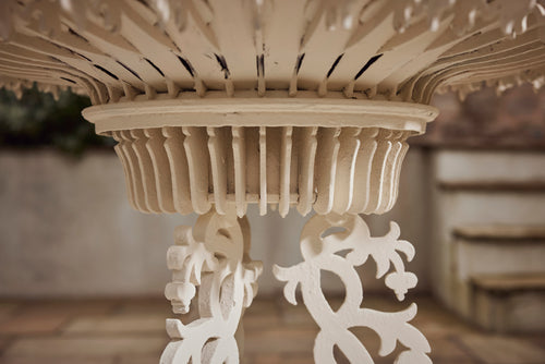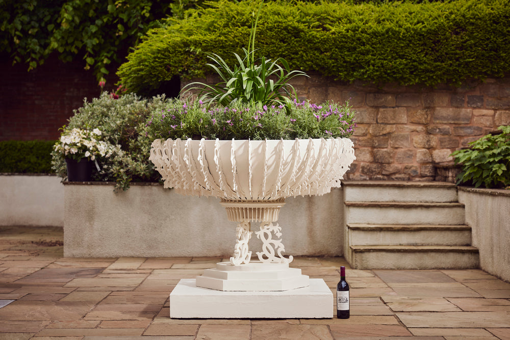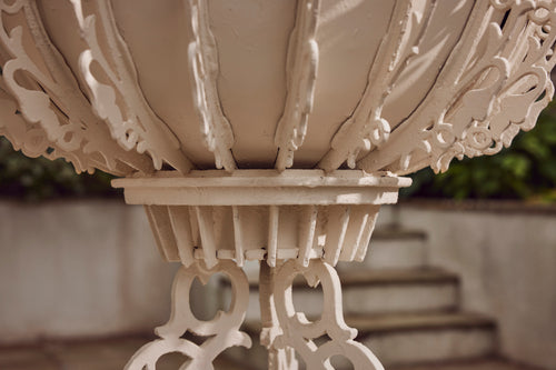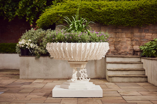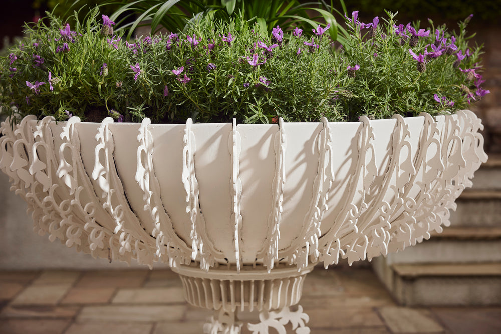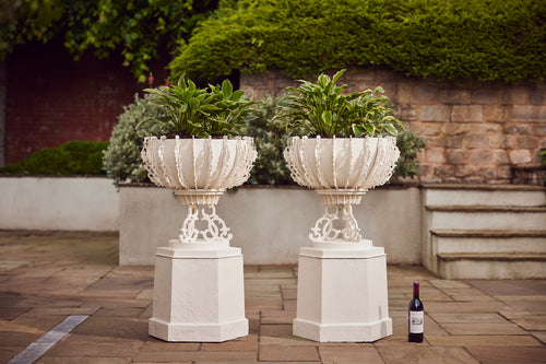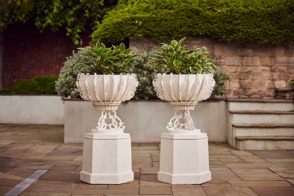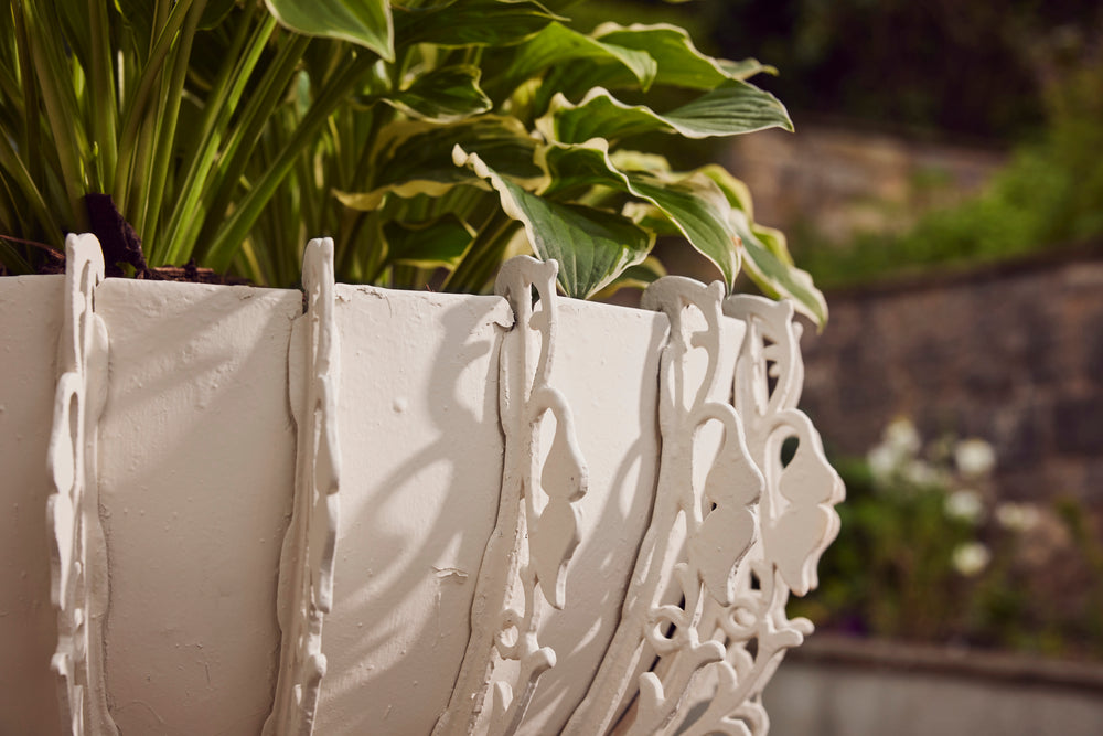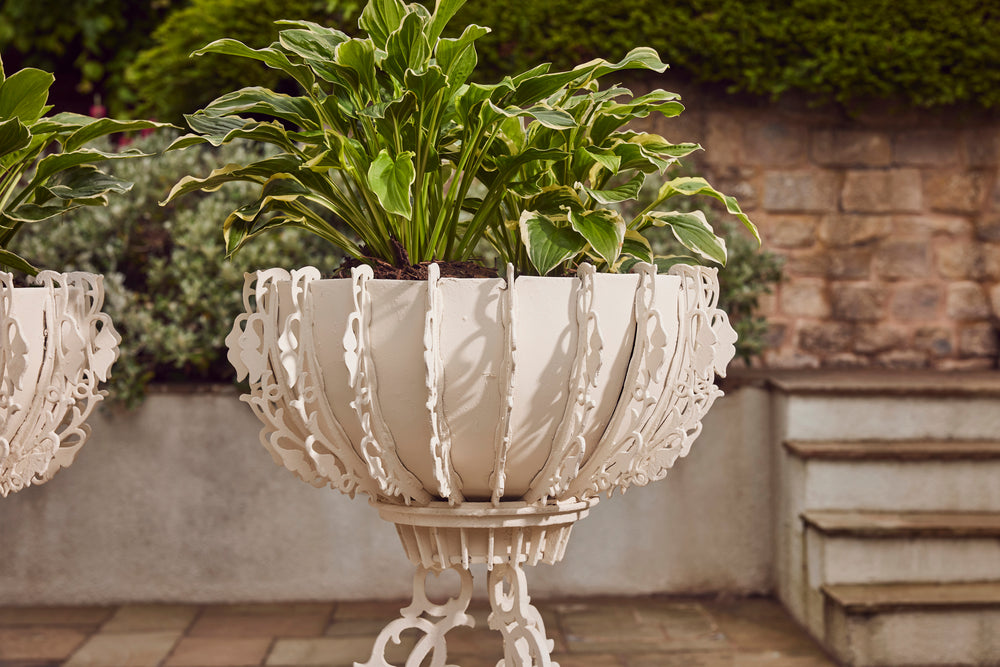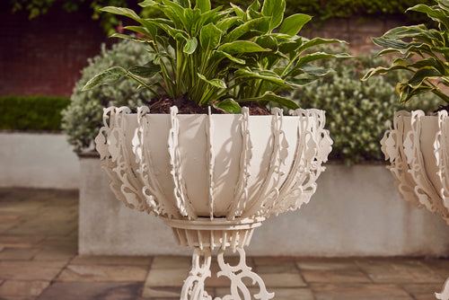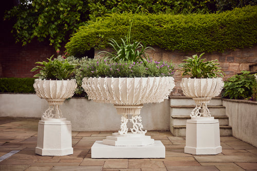 A particularly rare set of Victorian painted cast iron and zinc planters with an intriguing design. Each one has twenty cast iron supports into which a sequence of sectional zinc liners is fitted to form the body of the planter. These foiliate supports fit into cast triform and hexagonal base. The large planter has a further cast iron square base whilst the smaller pair have tapering hexagonal bases so all three sit at a similar height. Notwithstanding the impressive design of these planters the sheer size and scale of the set offers a great opportunity to create a wonderful display of plants and flowers all year round in what would be the centrepiece of a garden.