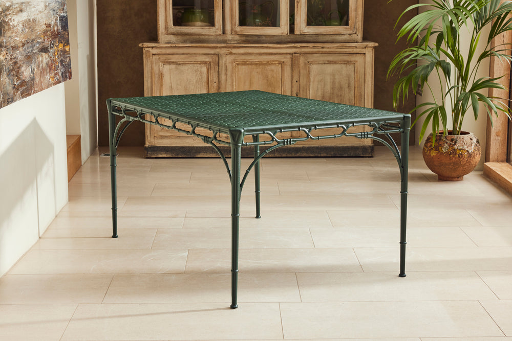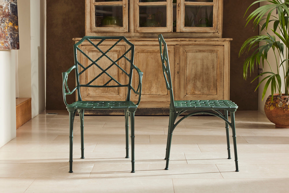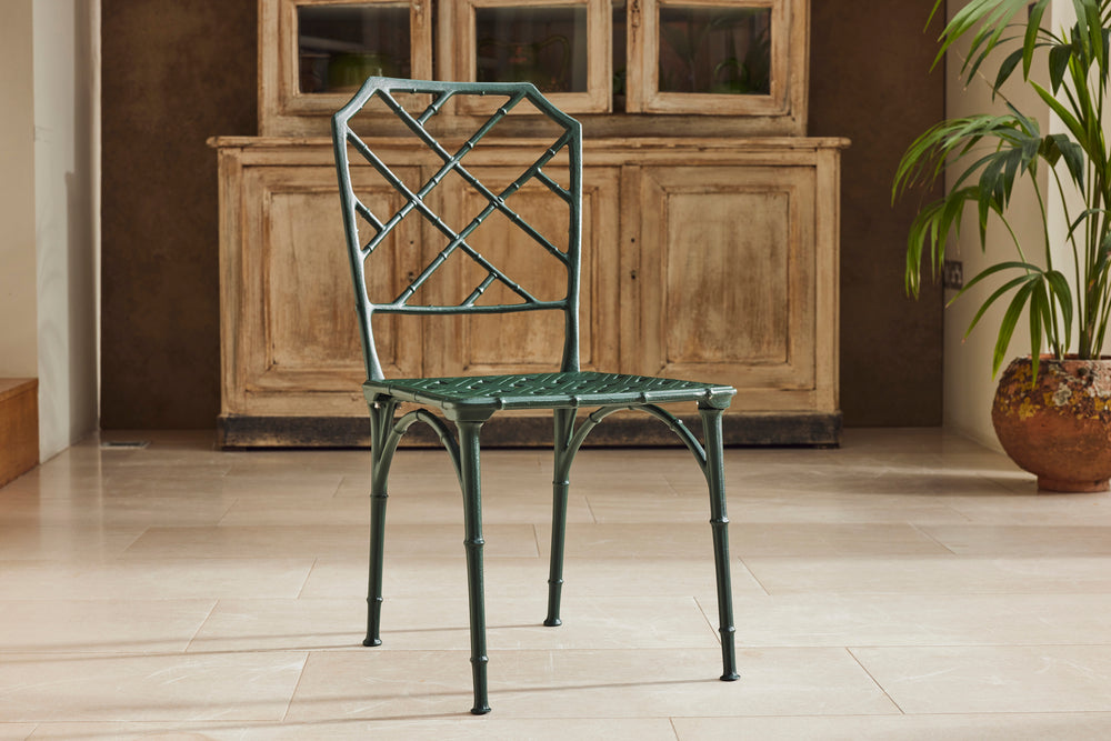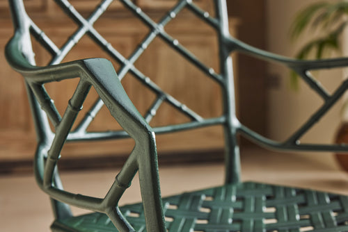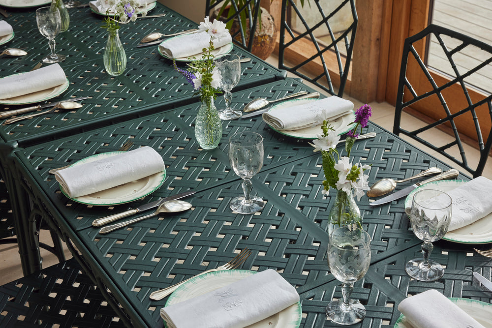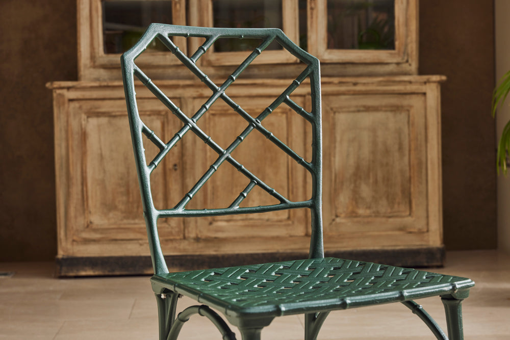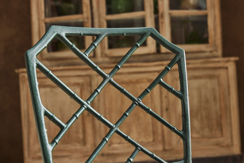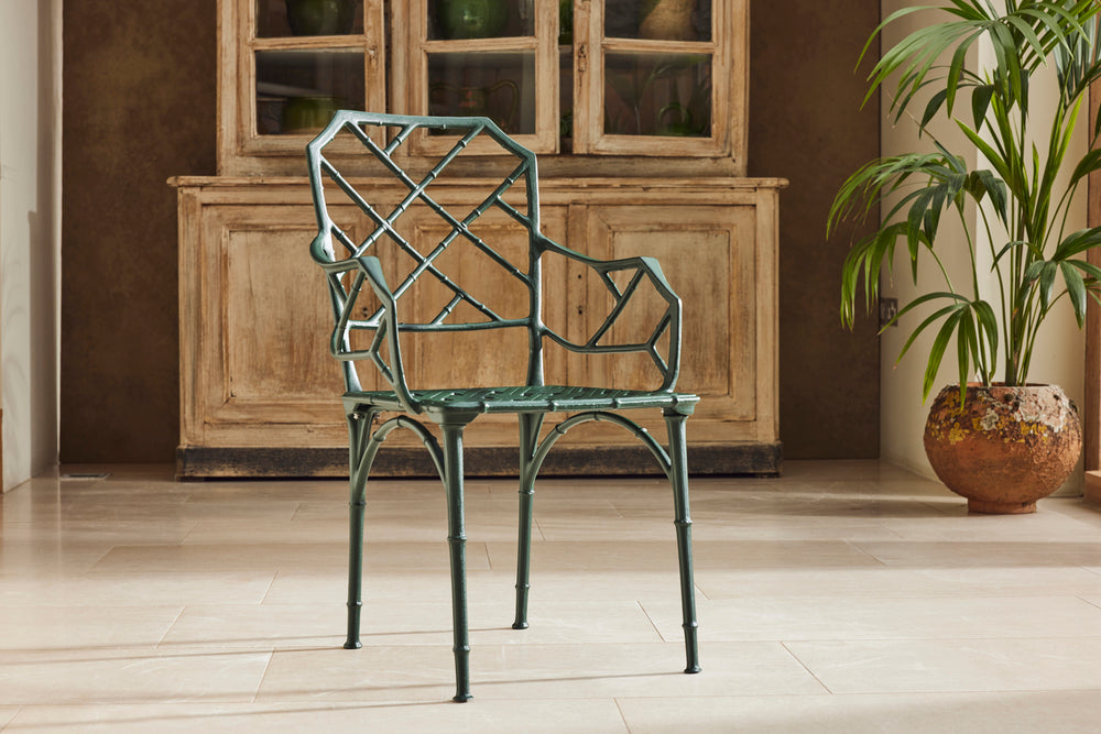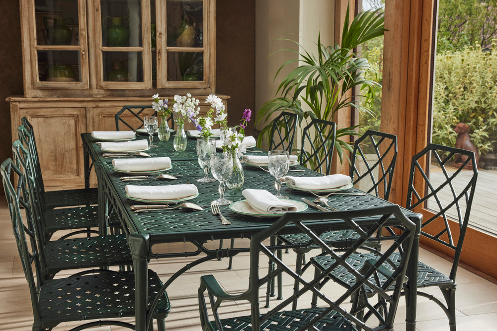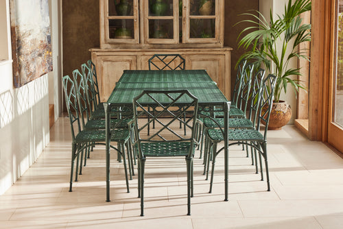 The result is a really lovely ten seat dining set consisting of 8 chairs and 2 armchairs and a pair chinoiserie style tables of rectangular form with pierced tops. A perfect set for a big family BBQ or an outdoor dinner party.
