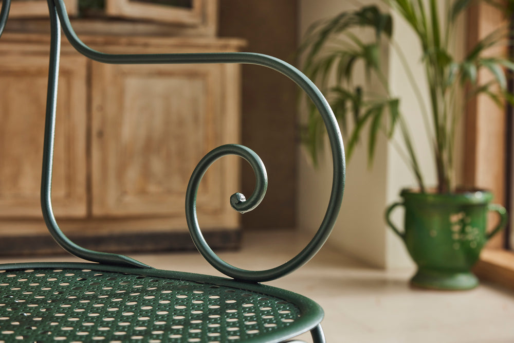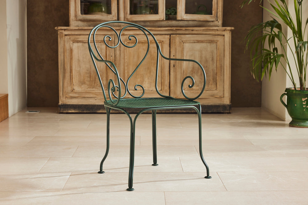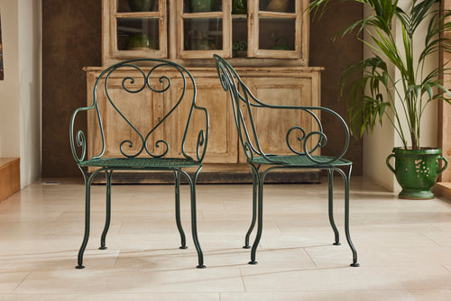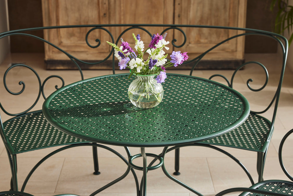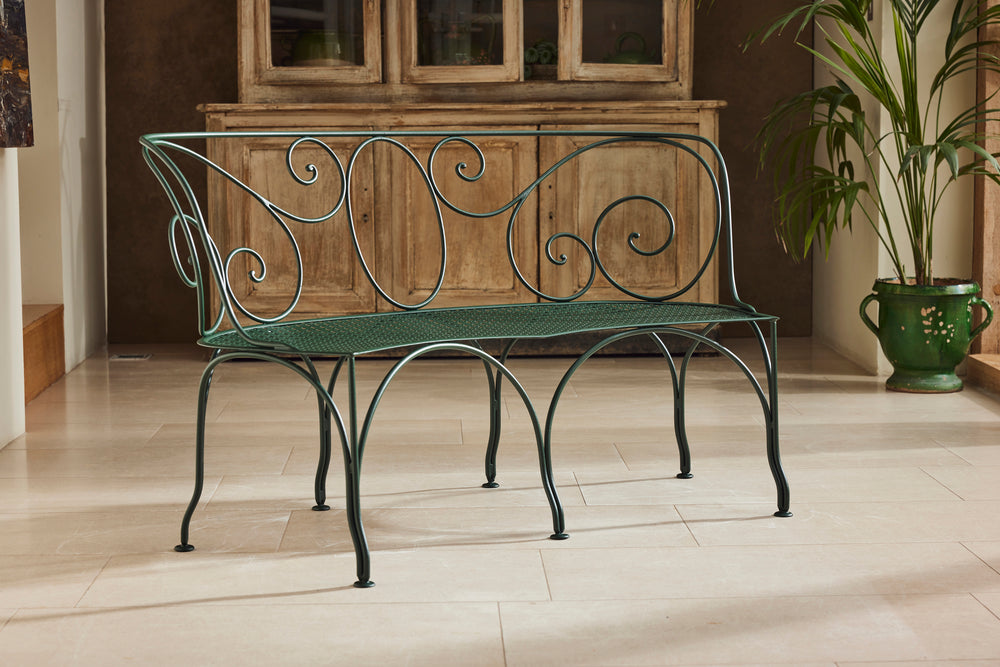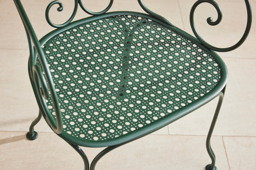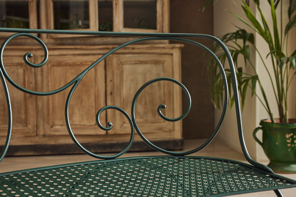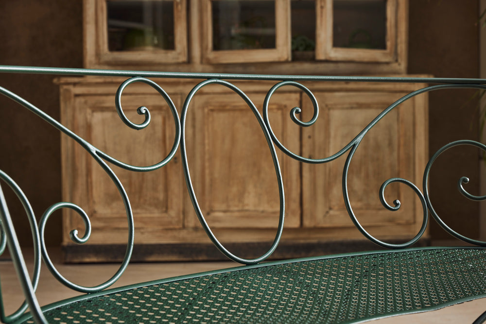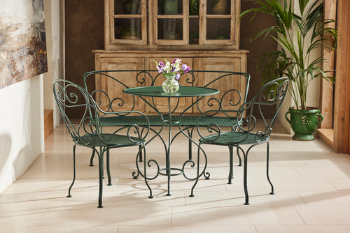 this 1920s garden set in the lovely town of St Remy de Provence in the South of France. Unusually the set consists of a 2-3 seater bench, two armchairs and a dining table. Made from hand forged wrought iron with faux bamboo mesh seats and a matching table top this set has been fully restored by us and is therefore in very good condition. It would be perfect for alfresco dining or in the garden room.