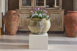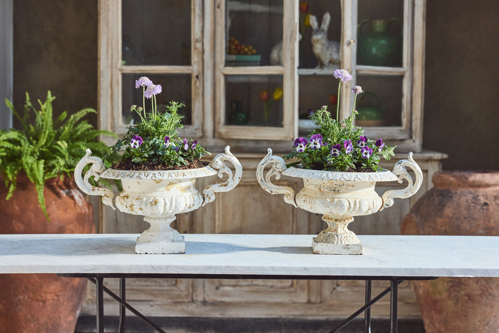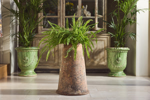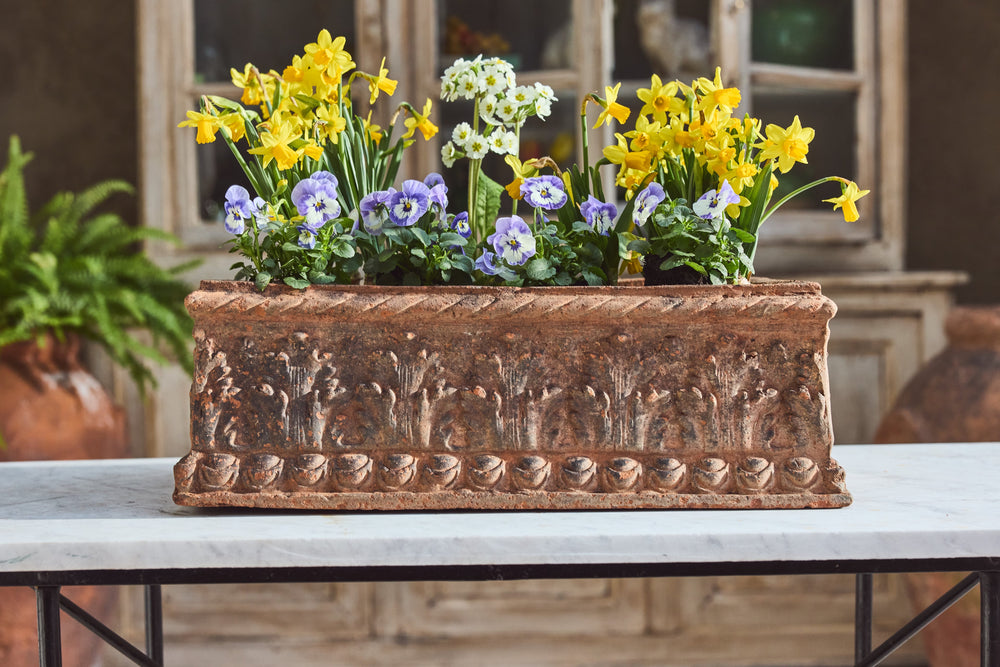 An early 20th-century bottle carrier to which we have added six antique terracotta pots to create an interesting and fun plant display. The carrier was made from a copper alloy and is in its original condition. It is a well-designed, attractive decorative piece in its own right and comes to life when filled with bottles or pots.