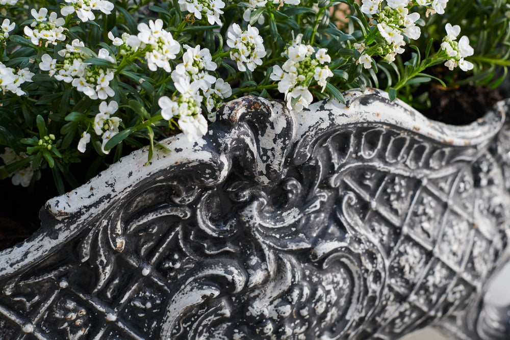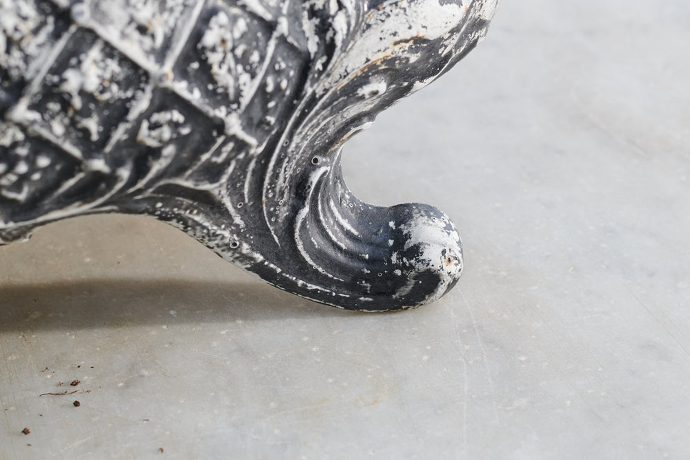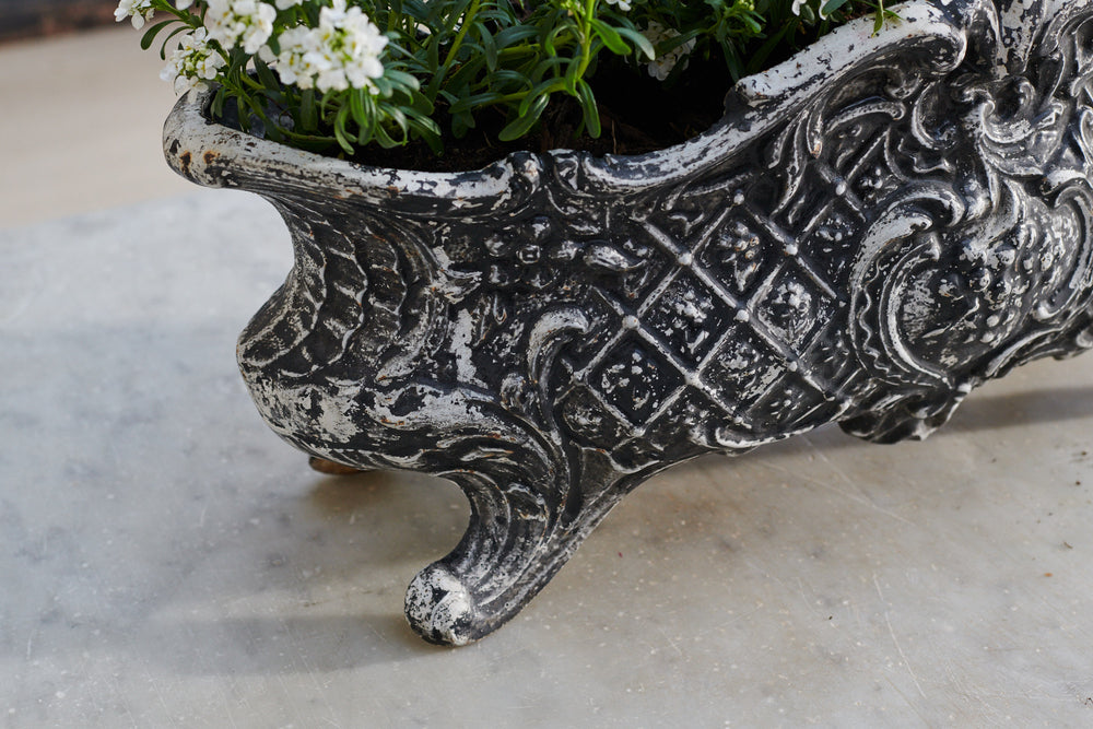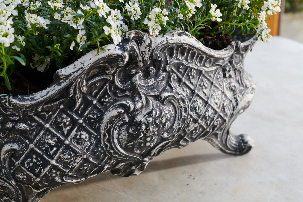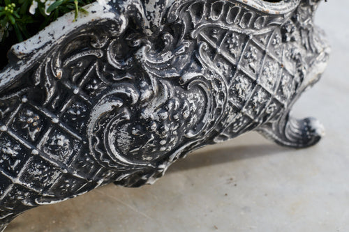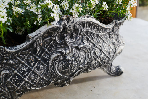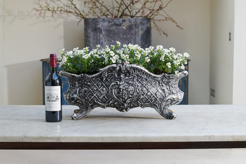 A French Jardiniere form the 1950s. With a decorative cross-hatch pattern stamped into the metal and a worn painted patina, this attractive planter would looks great filled with seasonal flowers.