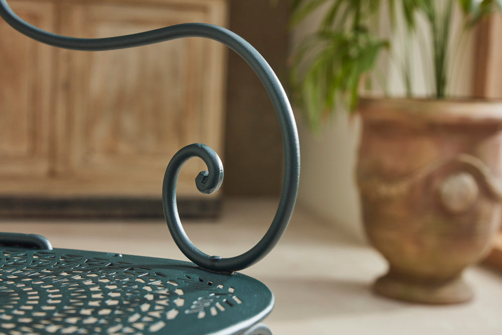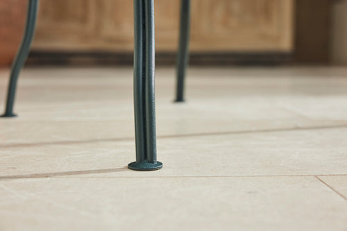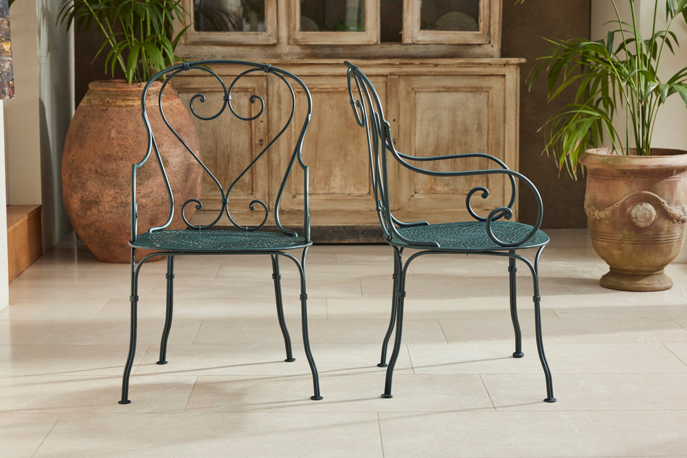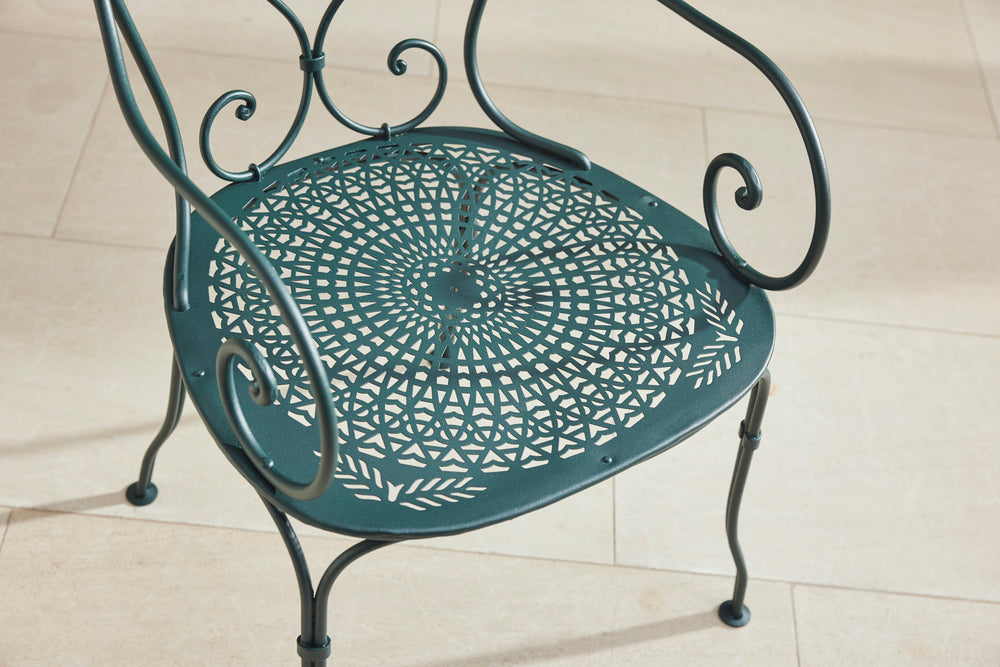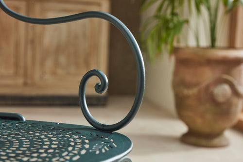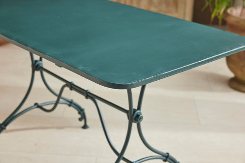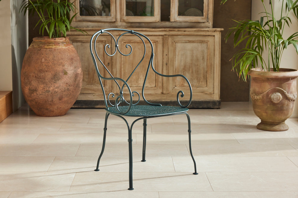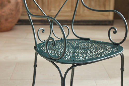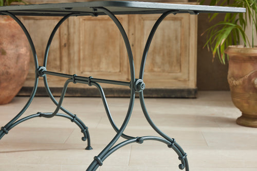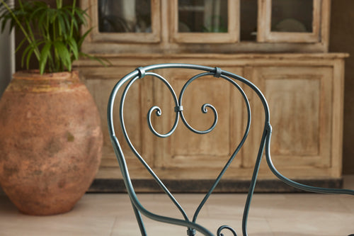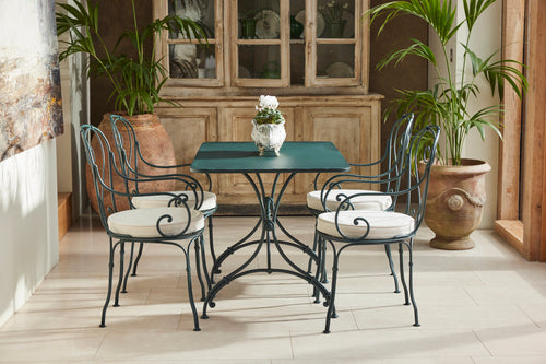 A charming French garden table with four chairs, dating back to around 1930. The table features an intriguingly designed frame, skillfully constructed using rivets, clamps and bolts adding character and durability to its structure. The 4 armchairs chairs are in very good condition featuring patterned seats and beautifully hand-forged scrolled backs highlighting the craftsmanship of the period. The set is generously sized, comfortably seating 4 people, making it ideal for dining either in a garden room or out on the patio.