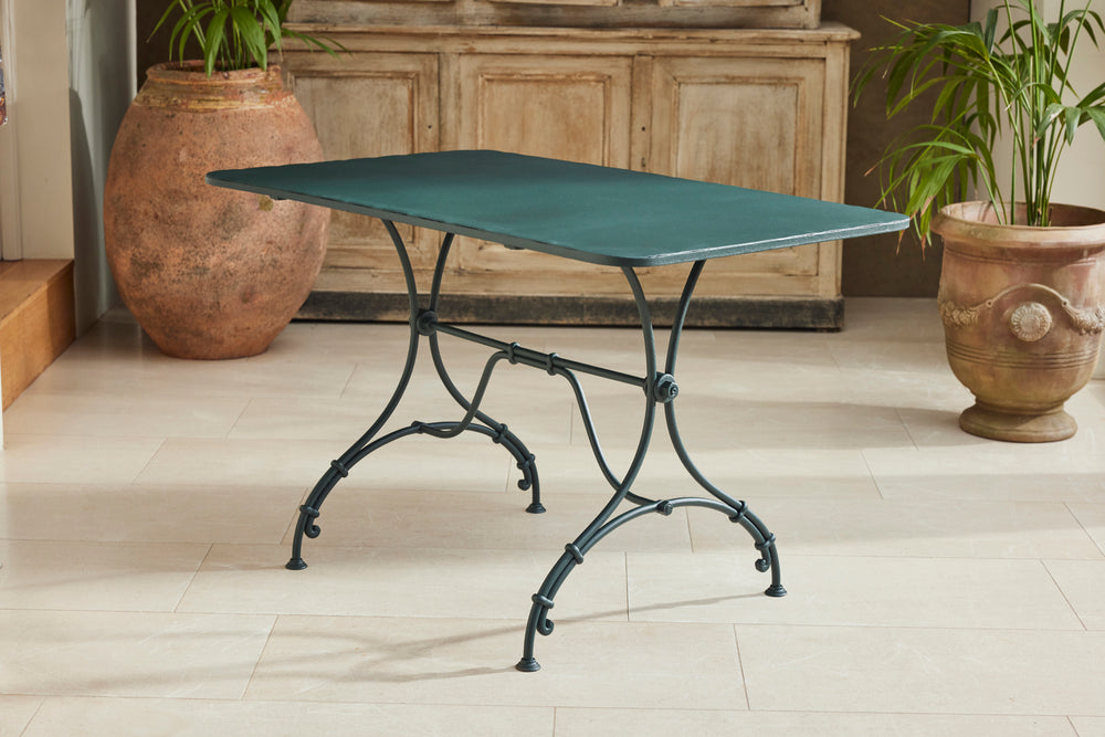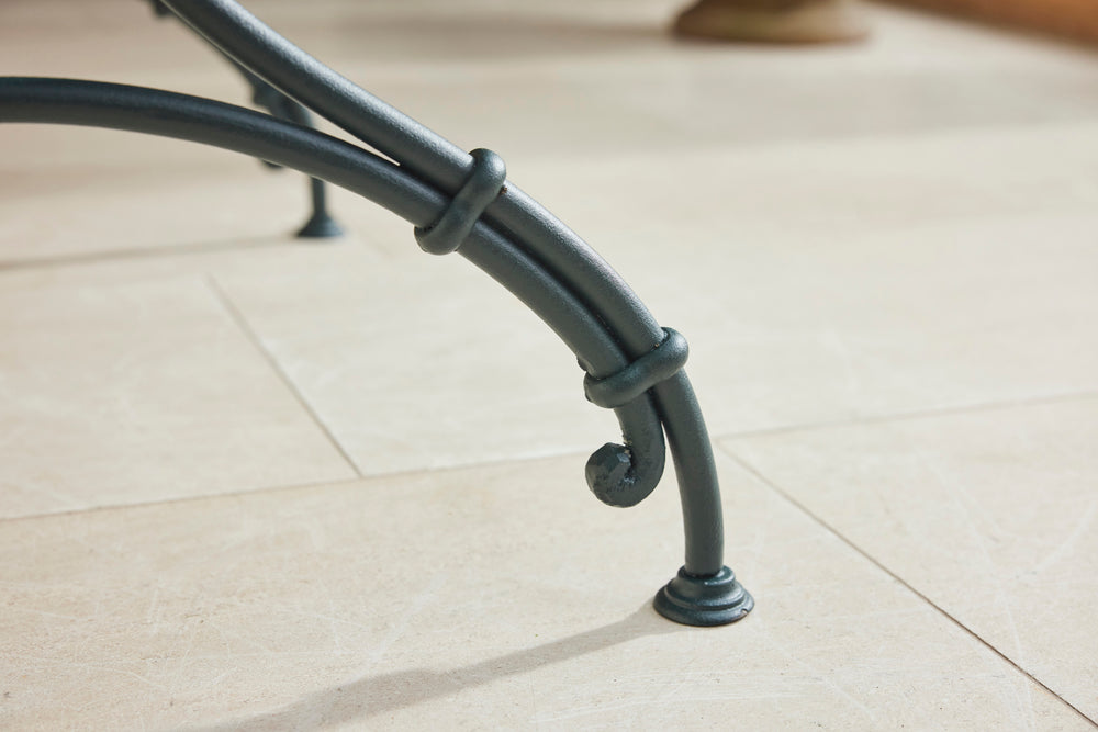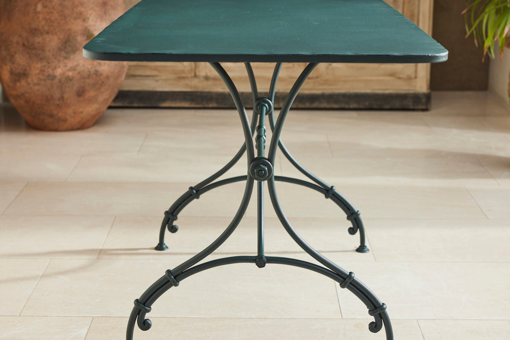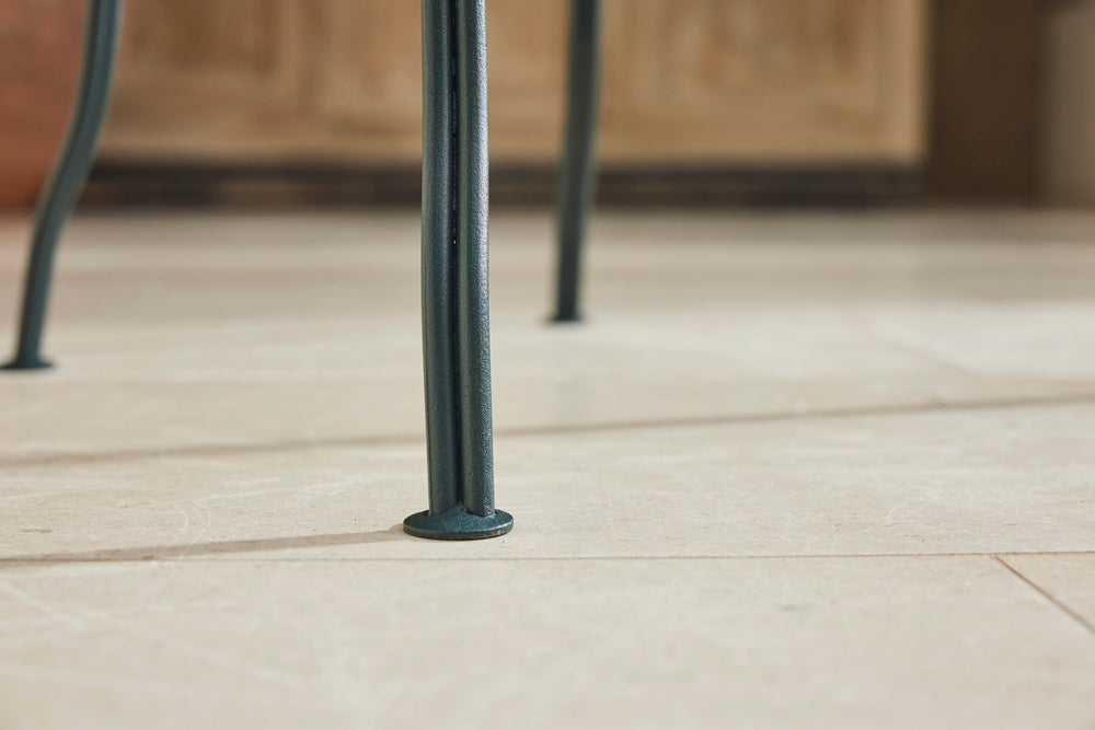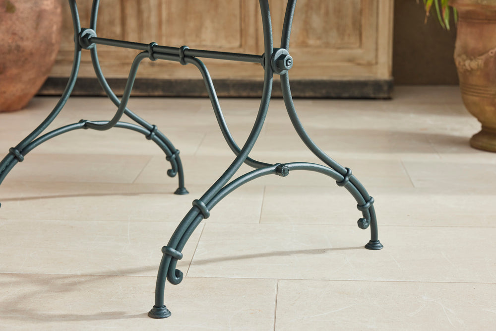A charming French garden table with four chairs, dating back to around 1930. The table features an intriguingly designed frame, skillfully constructed using rivets, clamps and bolts adding character and durability to its structure. The 4 armchairs chairs are in very good condition featuring patterned seats and beautifully hand-forged scrolled backs highlighting the craftsmanship of the period. The set is generously sized, comfortably seating 4 people, making it ideal for dining either in a garden room or out on the patio.