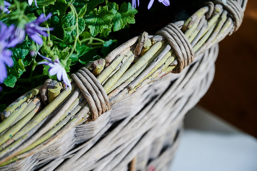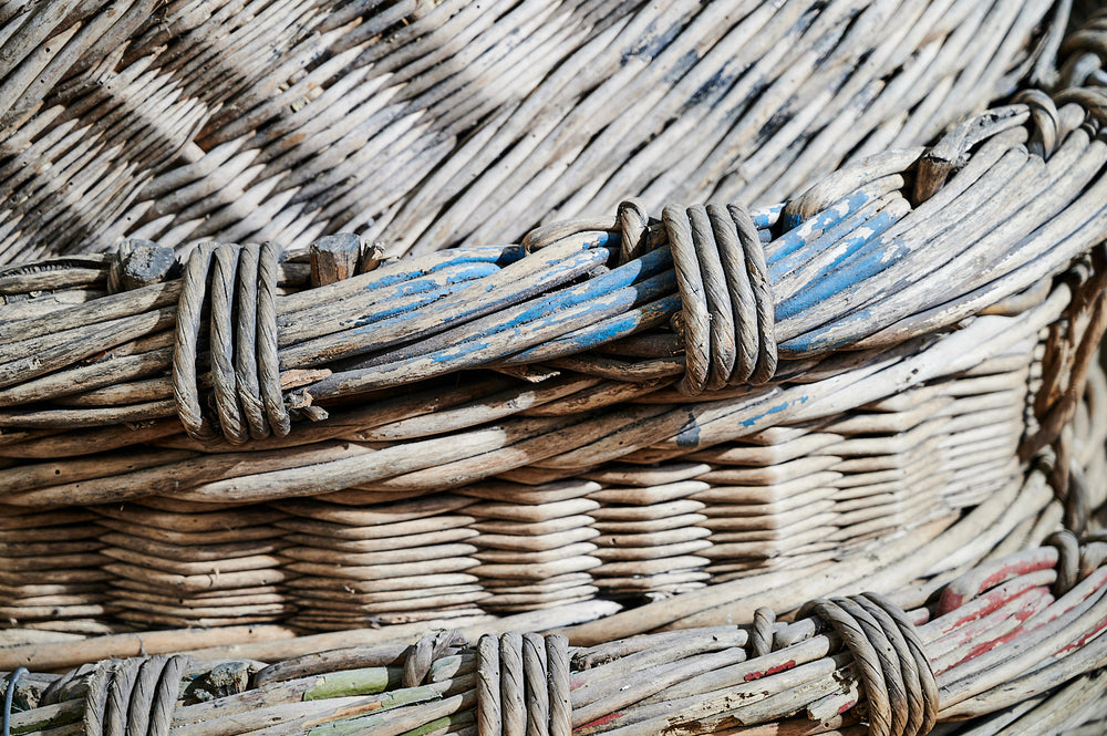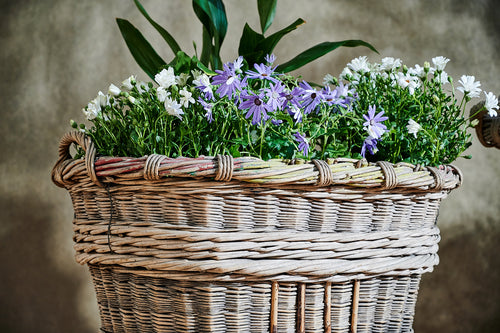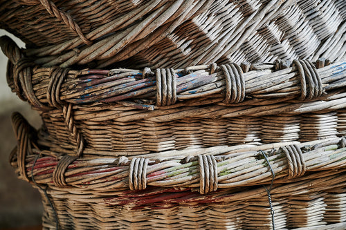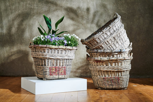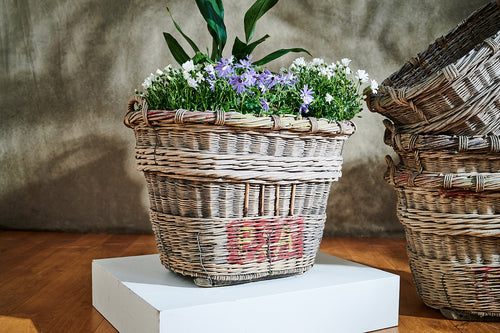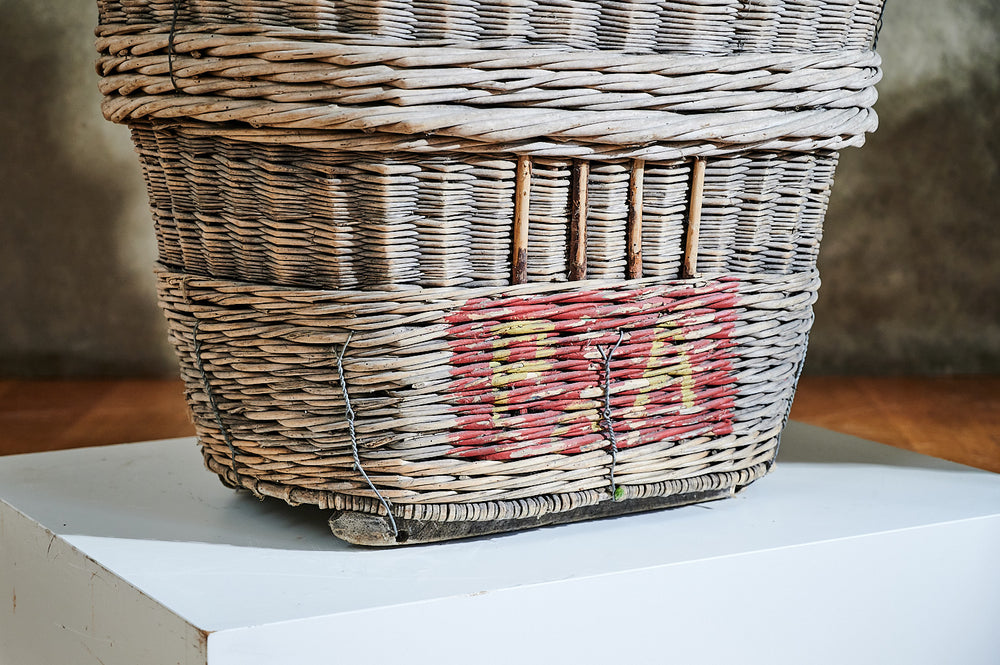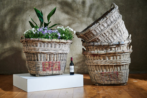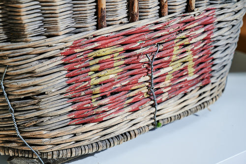 These early 20th century baskets were initially used when harvesting grapes in the Champagne region of France. They are made of woven wicker with twisted wire supports and sit on two wooden runners. There are traces of original red yellow paint and some lettering on the wicker, which would have been used to distinguish the vineyard. They are a great size and could be used with a liner as a planter and are perfect as log baskets, laundry baskets, shoe storage and toy baskets.