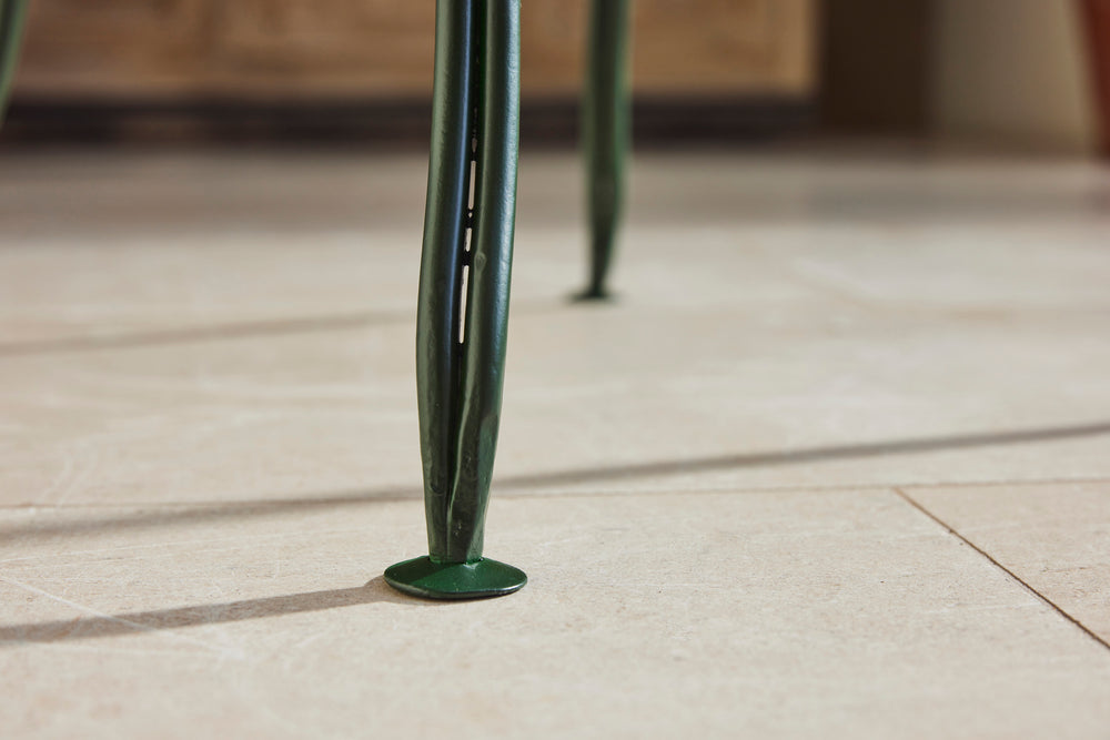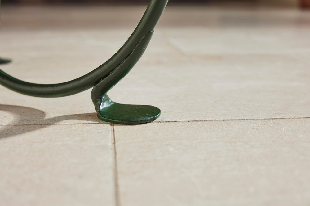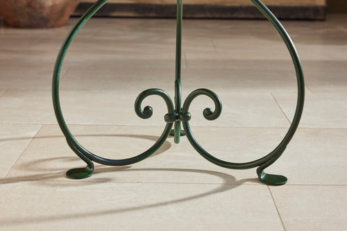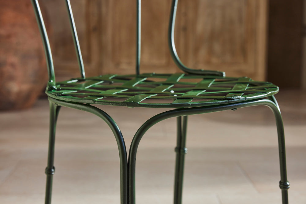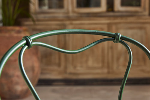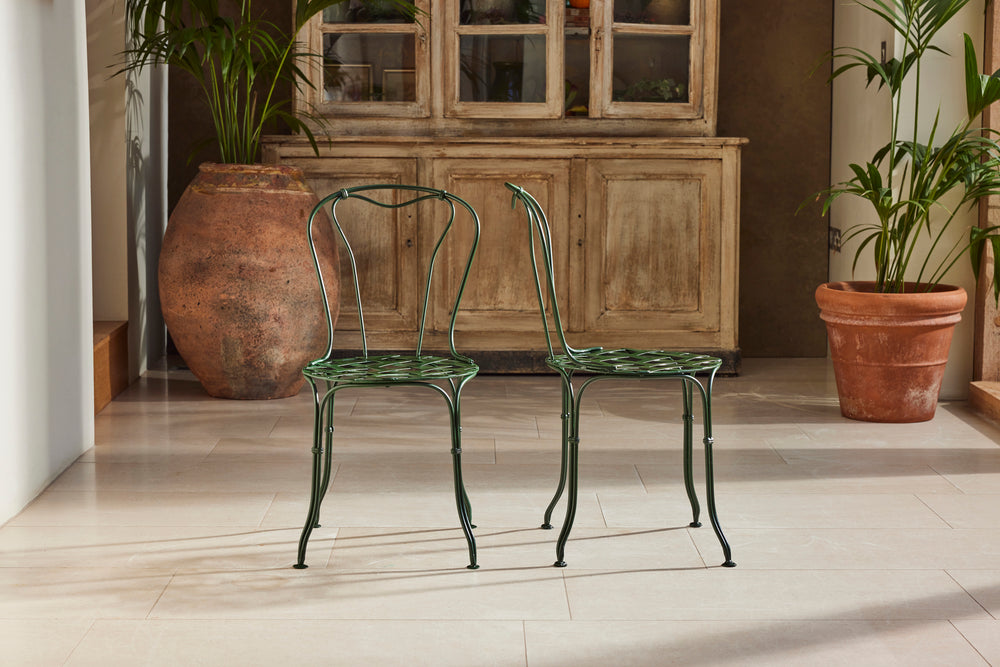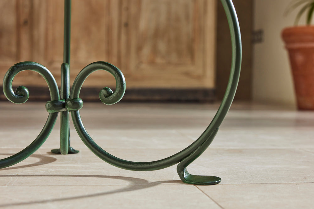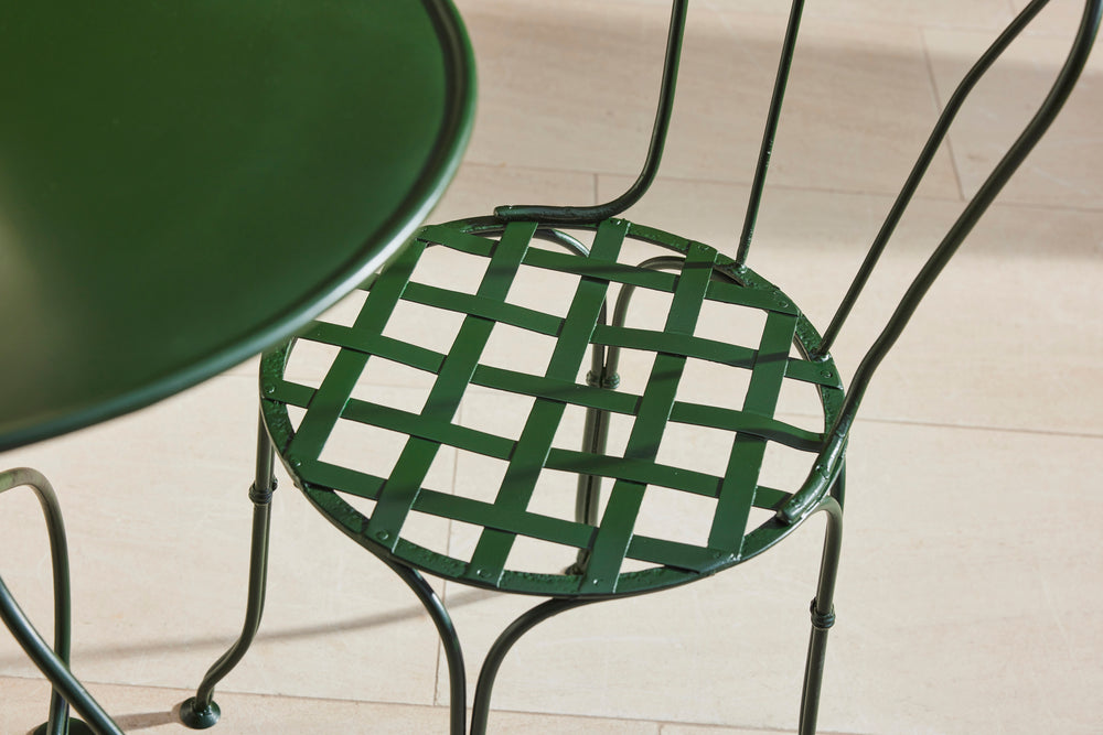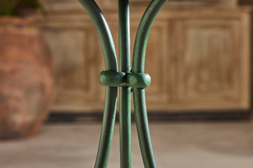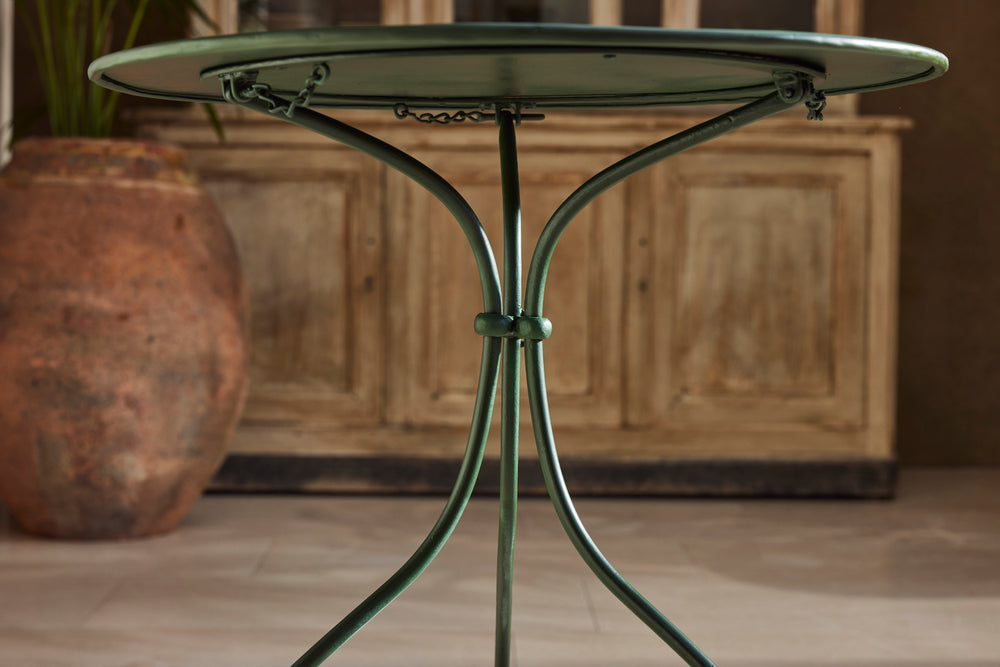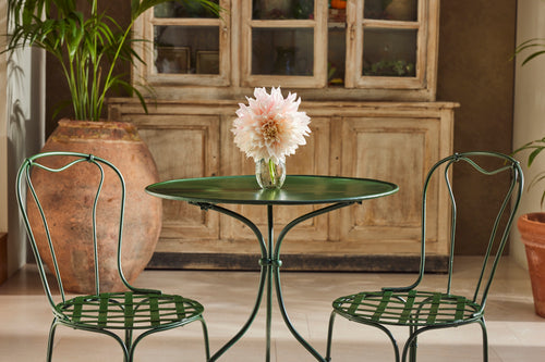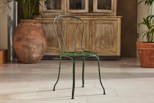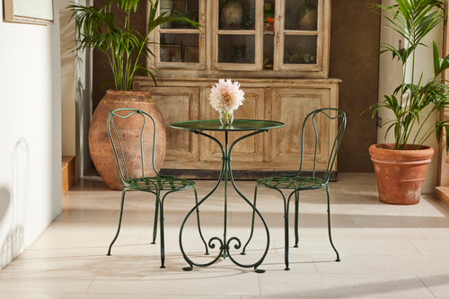 This attractive hand forged wrought iron bistro set from the 1930s includes a folding table with a distinctive curved base and lovely little feet and two chairs which are hand forged, clipped and riveted together. This set is now looking for a new home on a balcony or quiet corner of a garden.