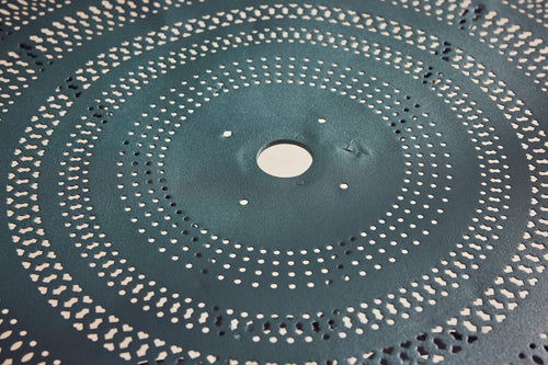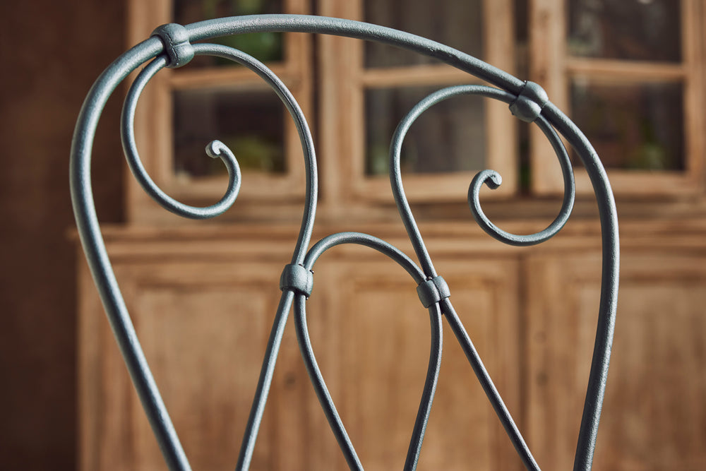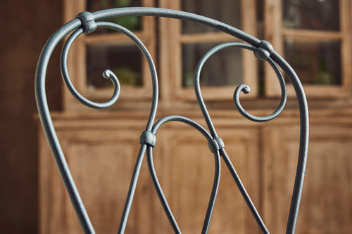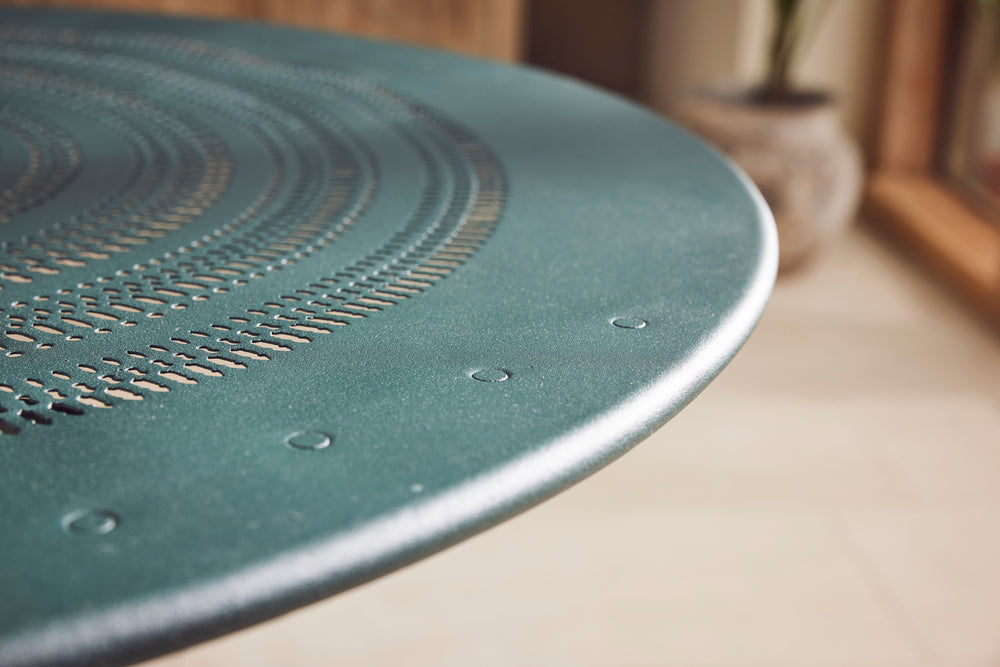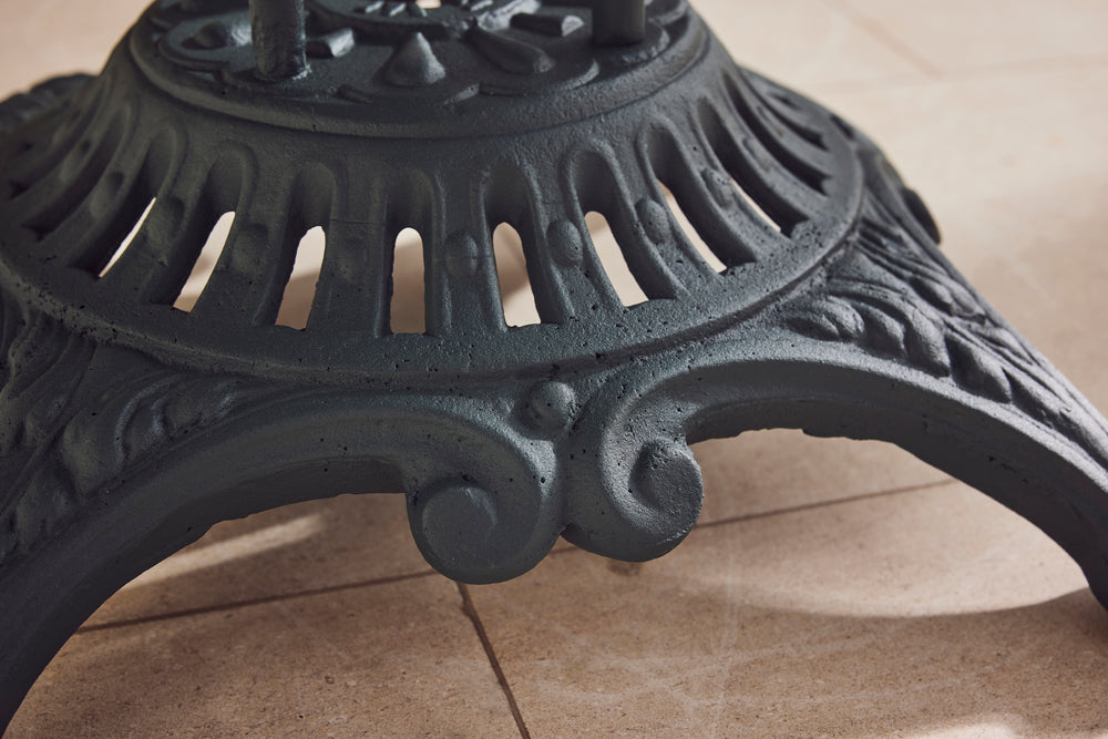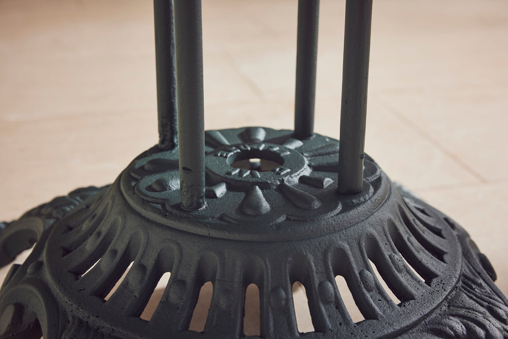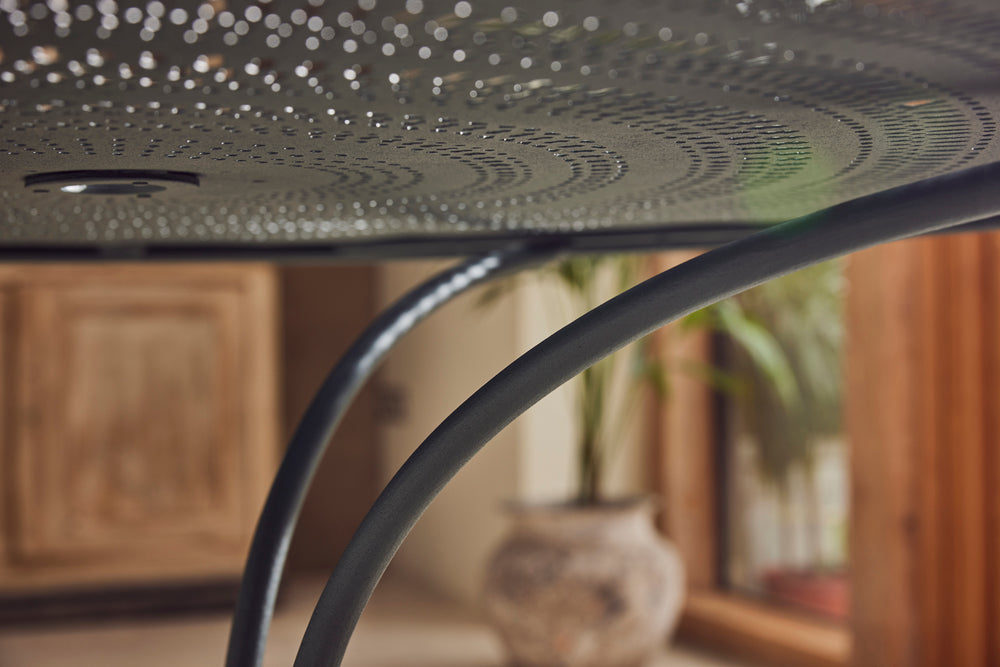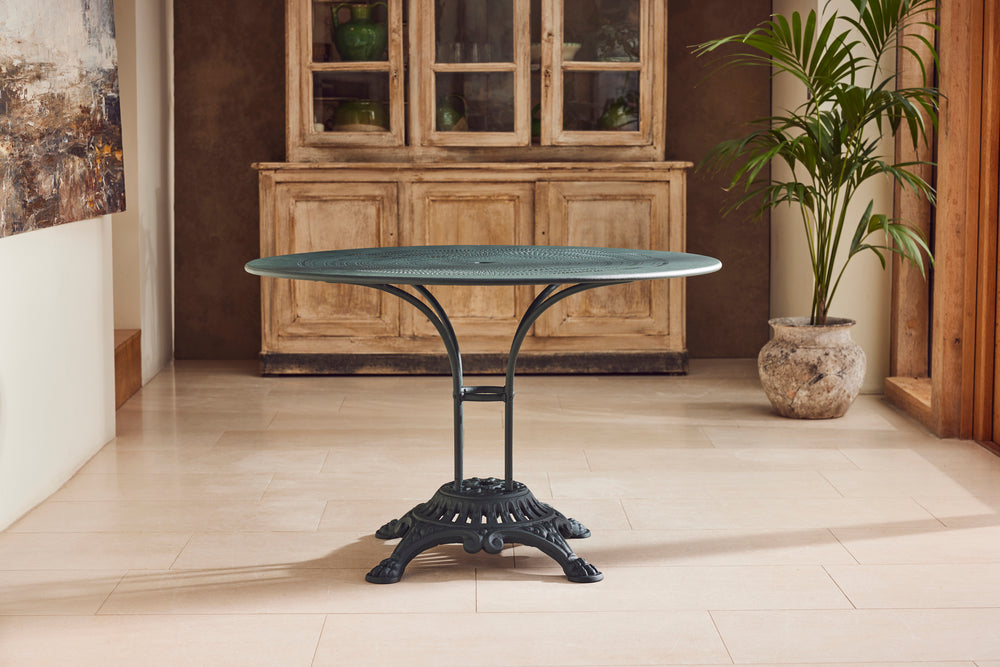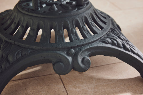 We love this highly sociable round garden table and chairs. The table has a very strong and decorative cast iron base on which sits a patterned metal top.