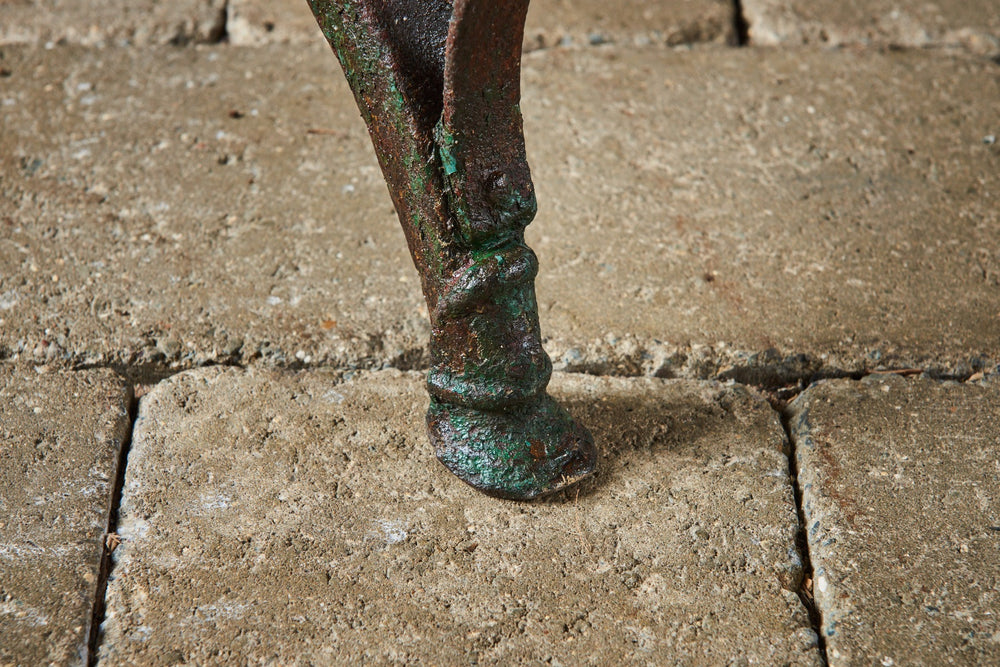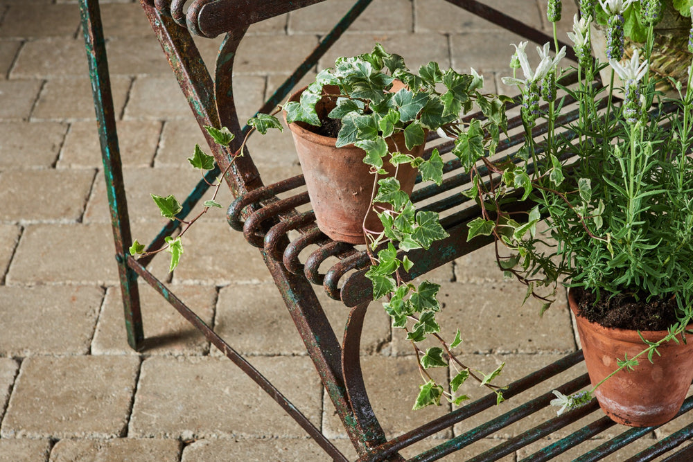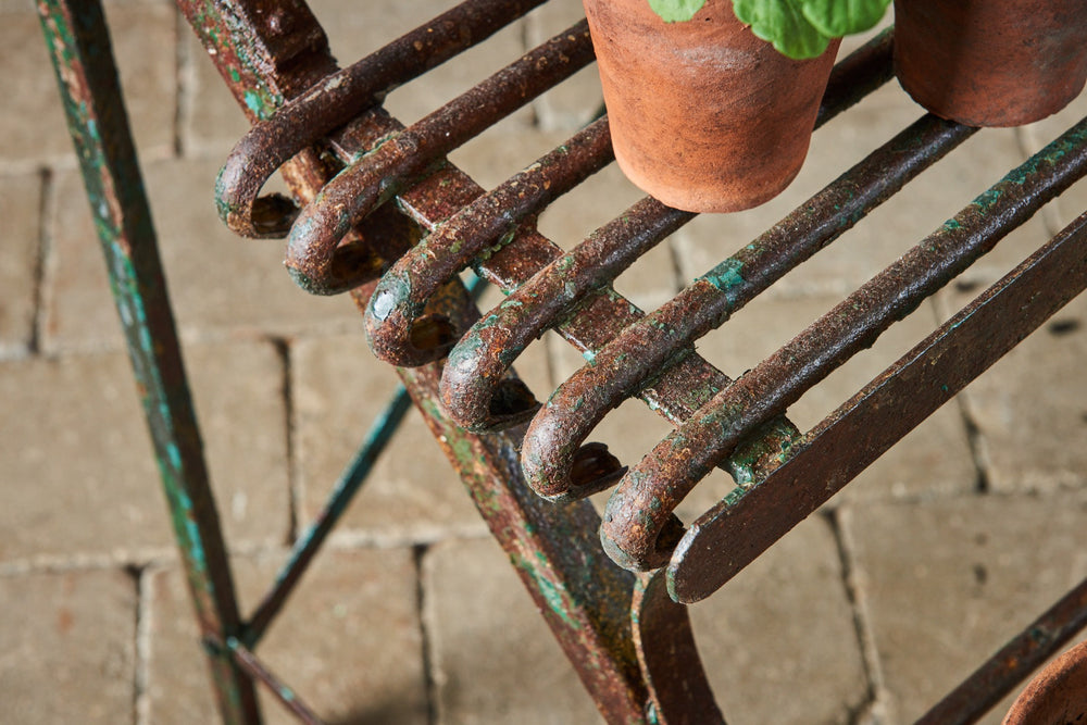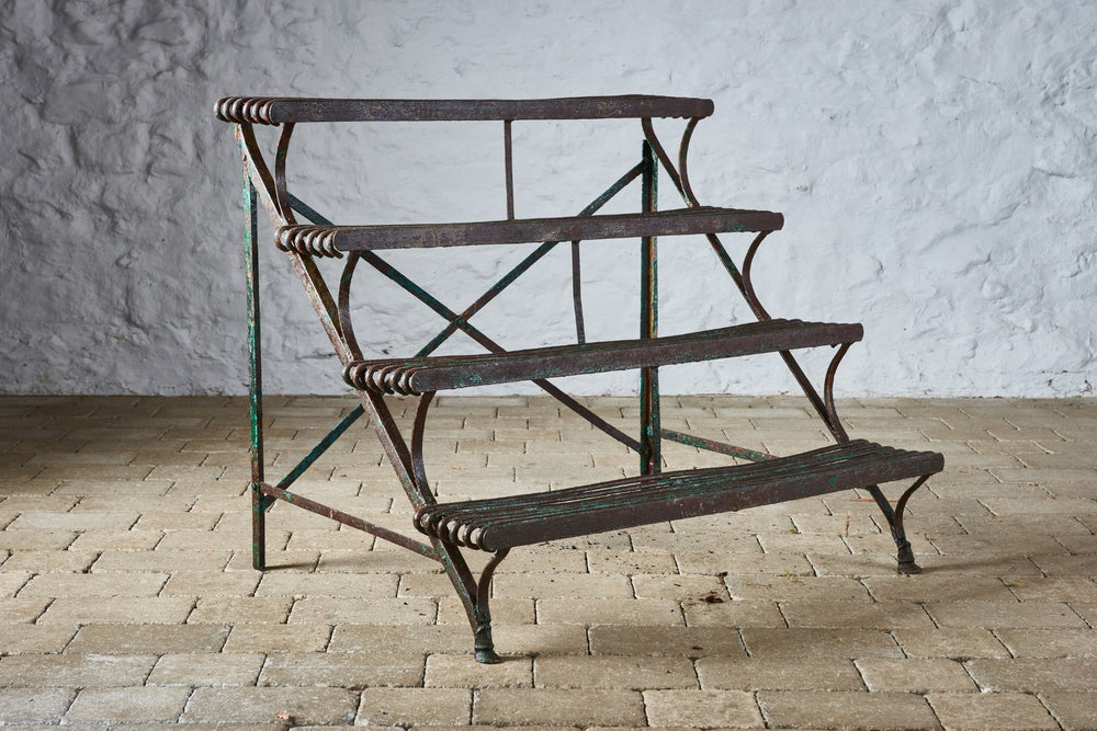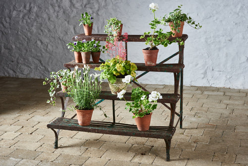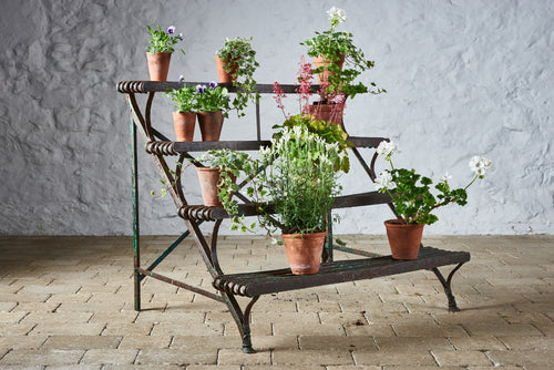 A lovely Arras plant stand from manufacturer Grassin Baledans. The term "Arras" refers to garden items produced in the French town between 1840 and 1914 from patented half-round hollow steel tubing. This turn of the century version originally featured in the manufacturers 1874 catalogue and could be as tall as 8 tiers high. This 4 tier version with hoof feet would have been used in an orangery or conservatory to construct a fantastic floral display.