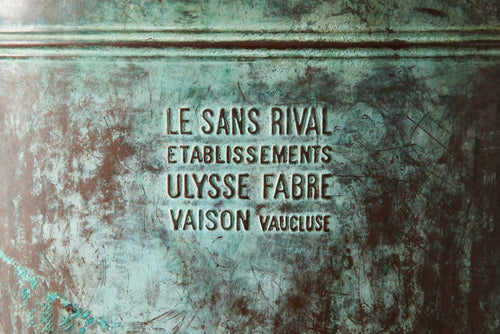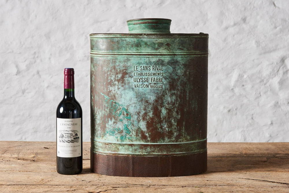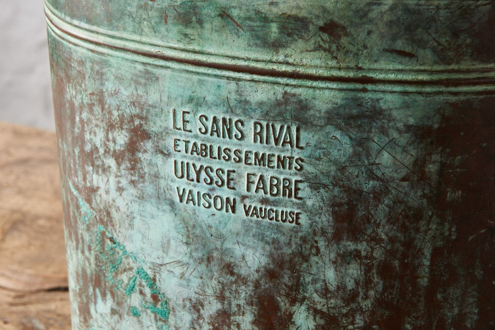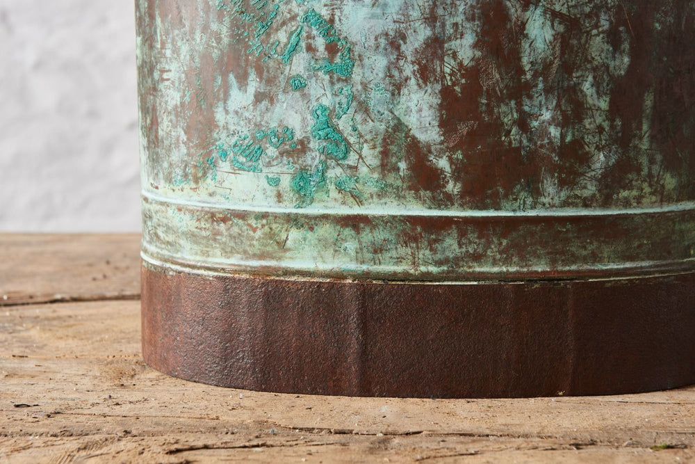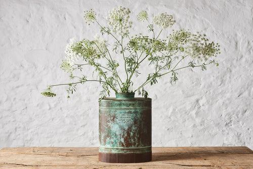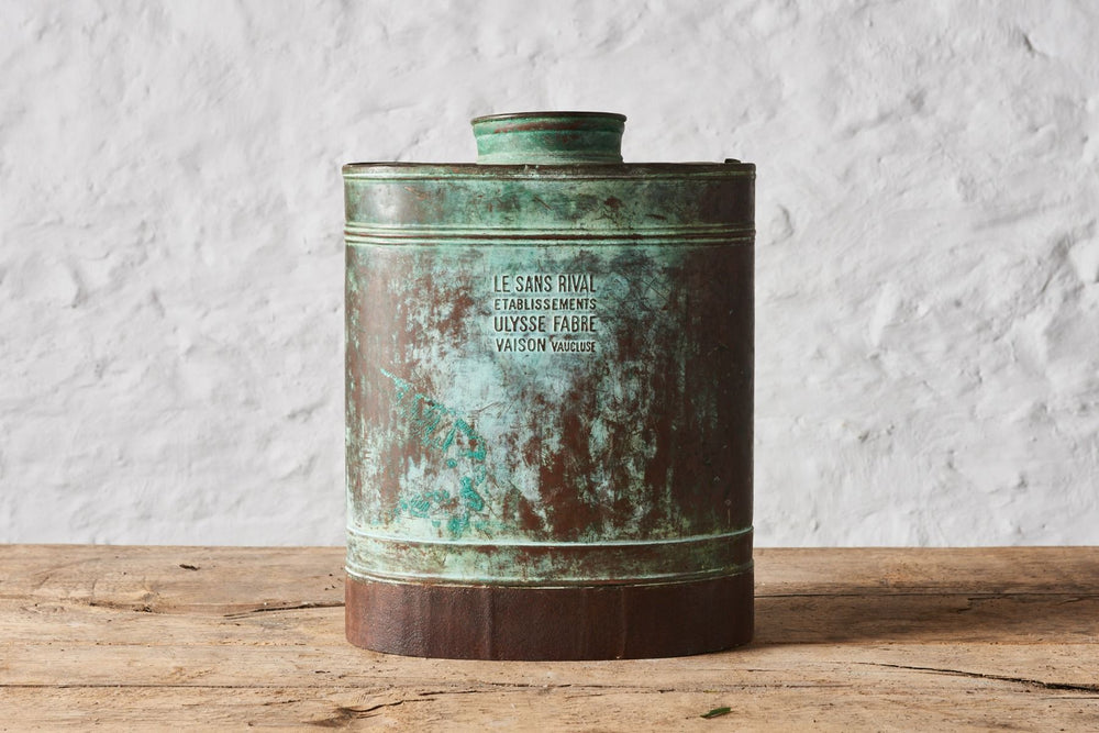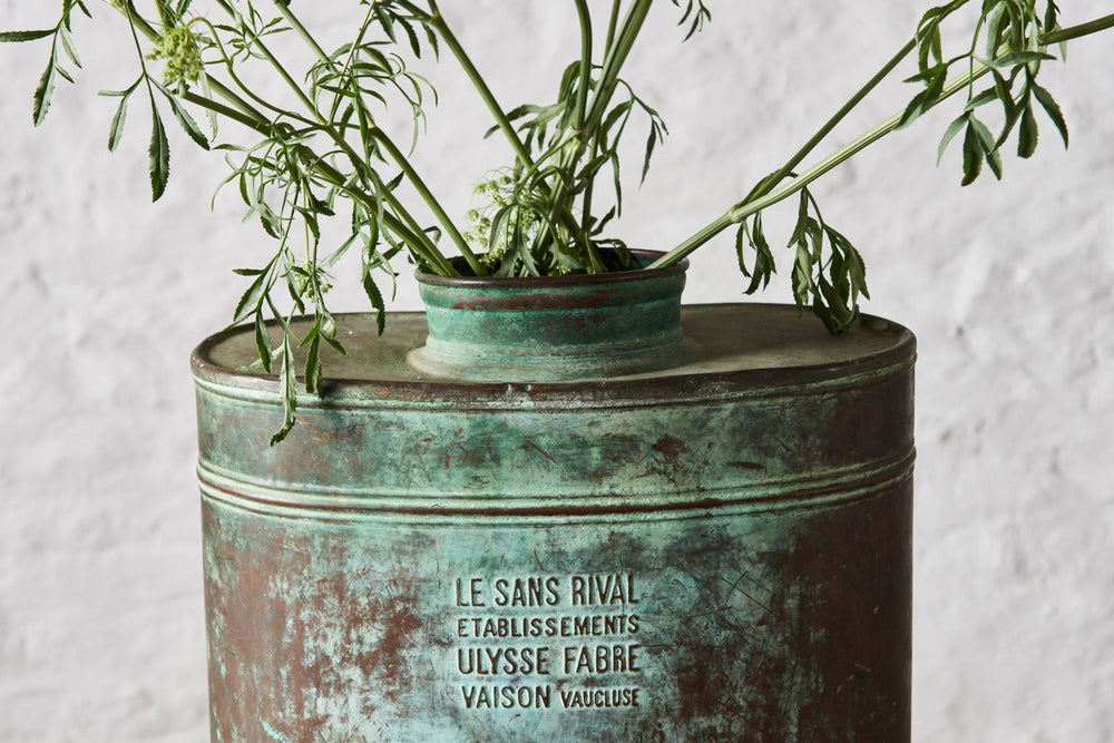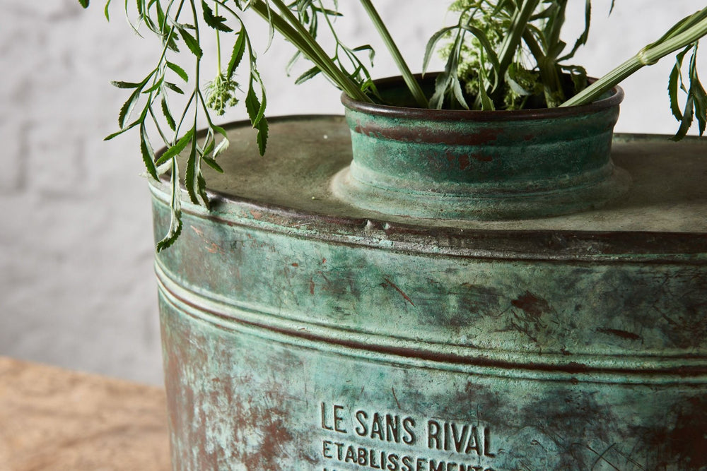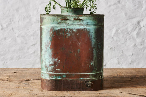 This obsolete grape sprayer has been repurposed as an attractive container for flowers or as a decorative item in its own right. It has developed the most beautiful and vivid verdigris finish and has the original makers name stamped upon it.