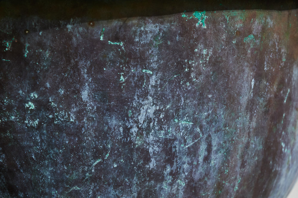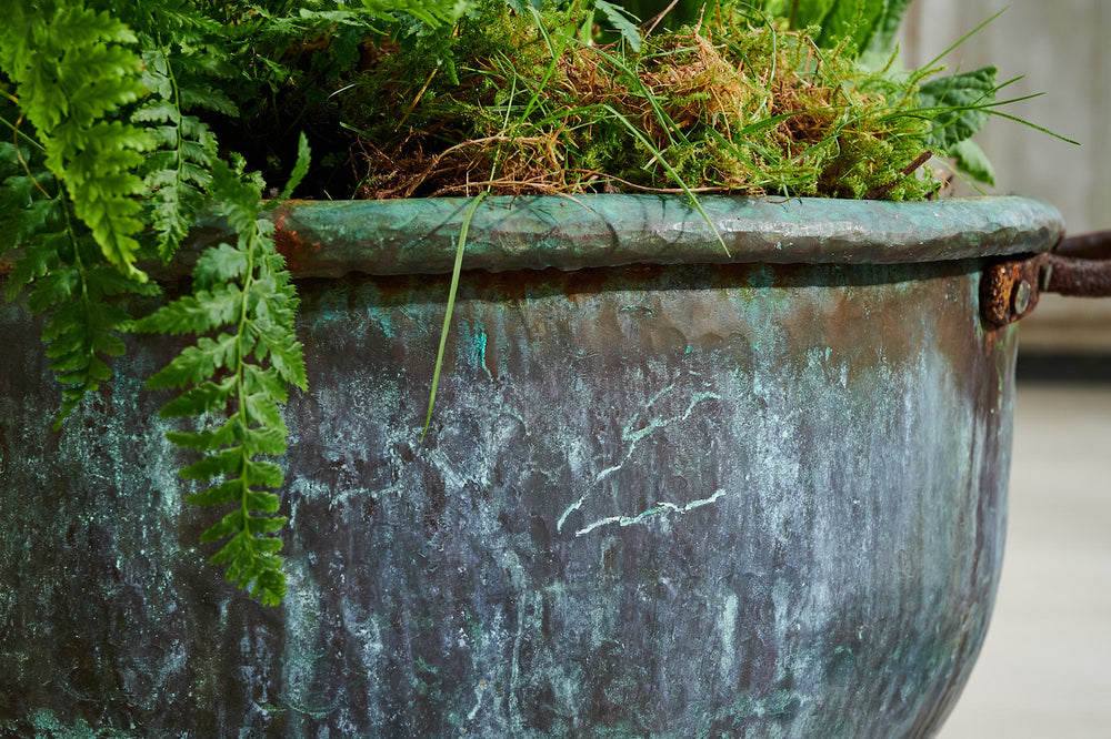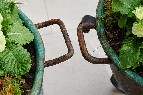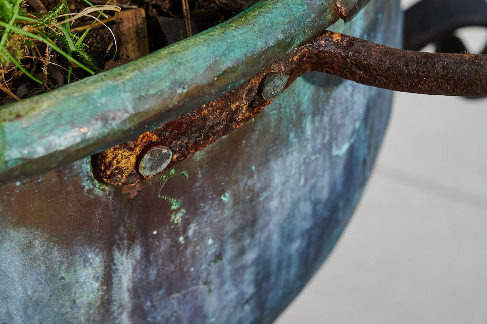 A near pair of copper bowl planters complete with verdigris and drainage holes sitting on a hand forged wrought iron frame. Perfect for seasonal planting.