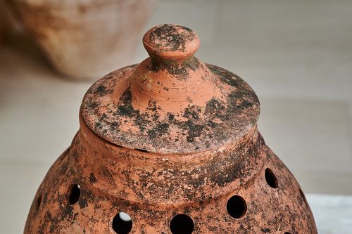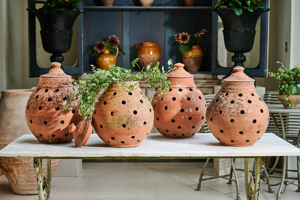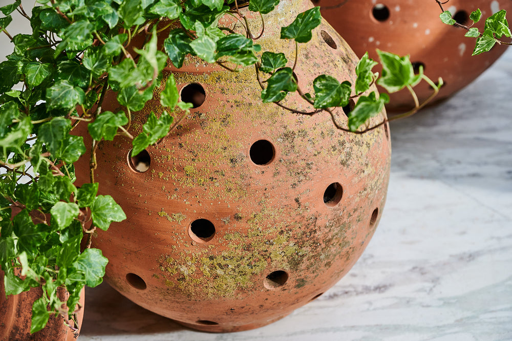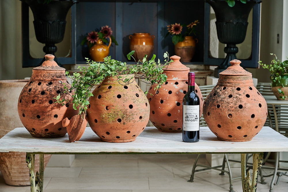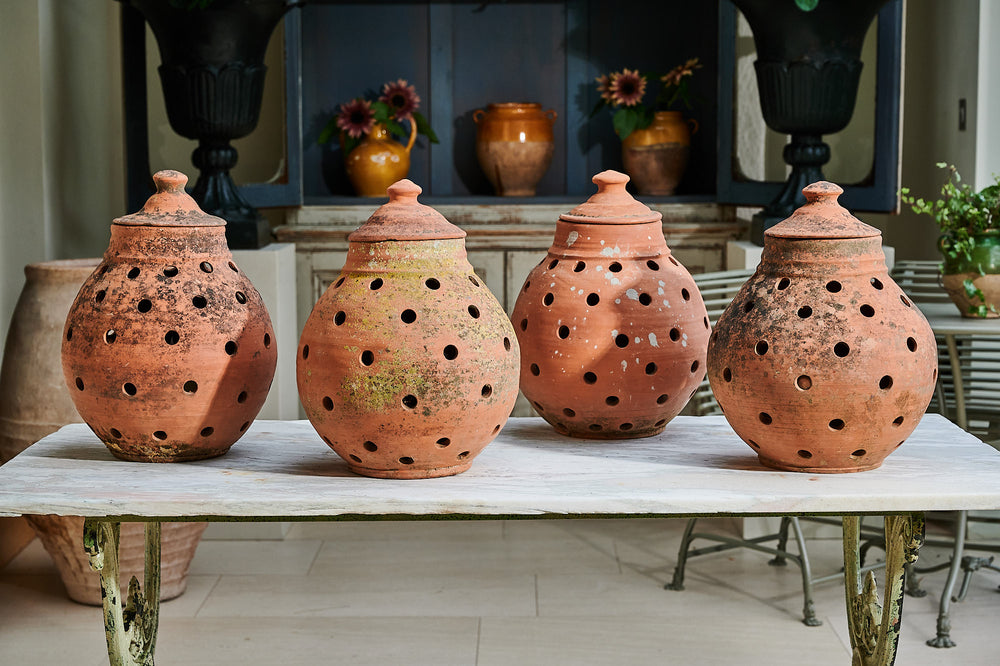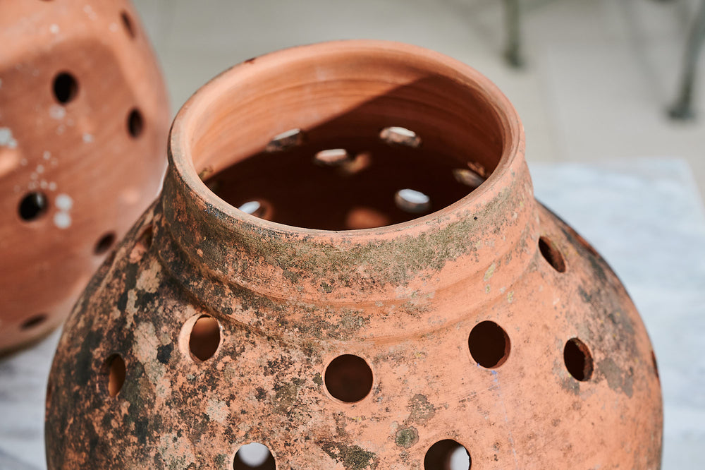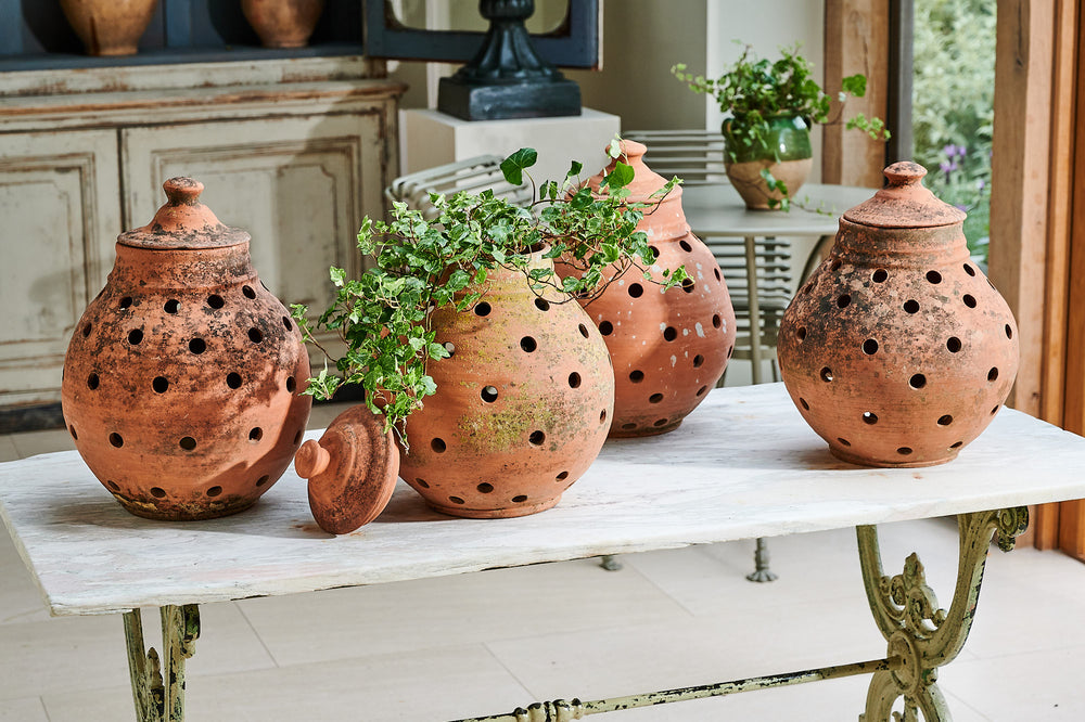 We bought these old French terracotta pots from a fair in Bezier in the South of France. We are unsure of what their original use was but they look great with trialling ivy and with their lids on with candles flickering through the small holes.