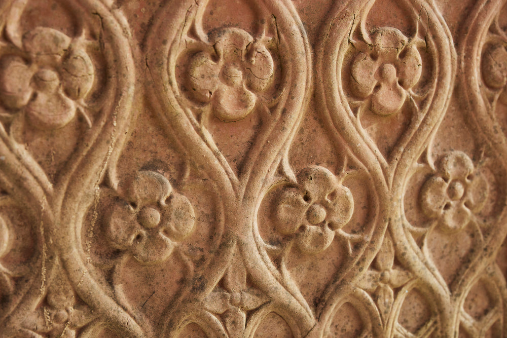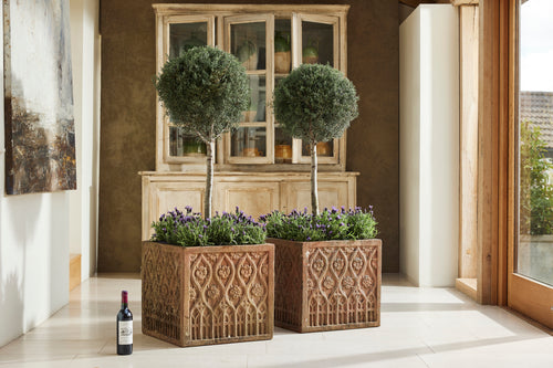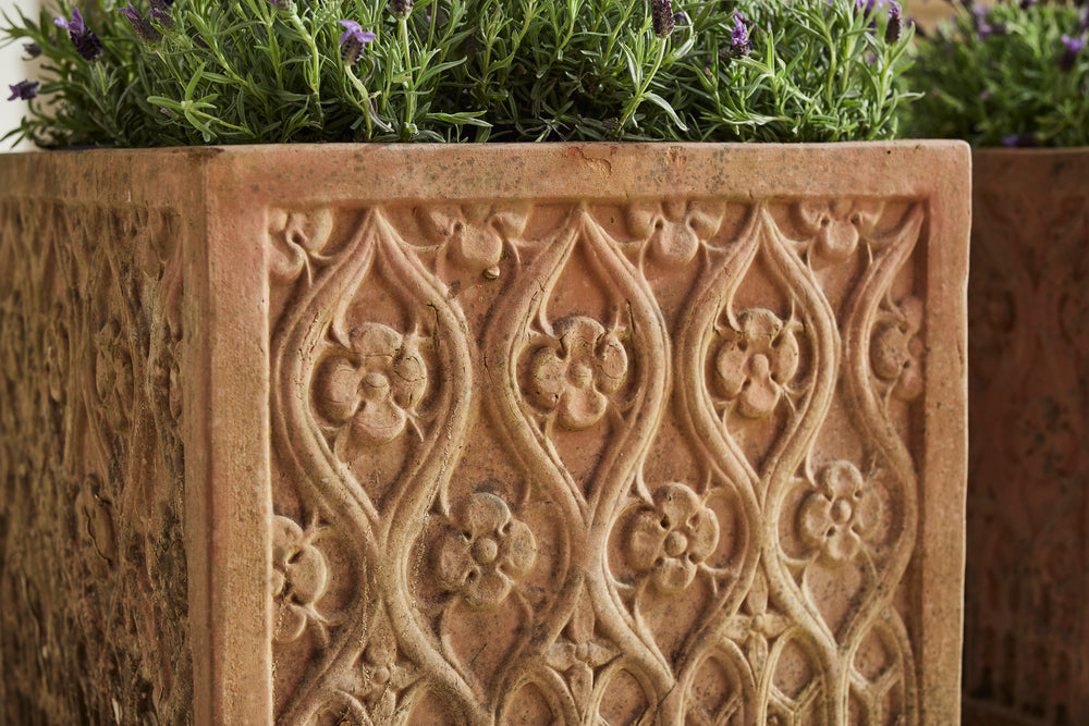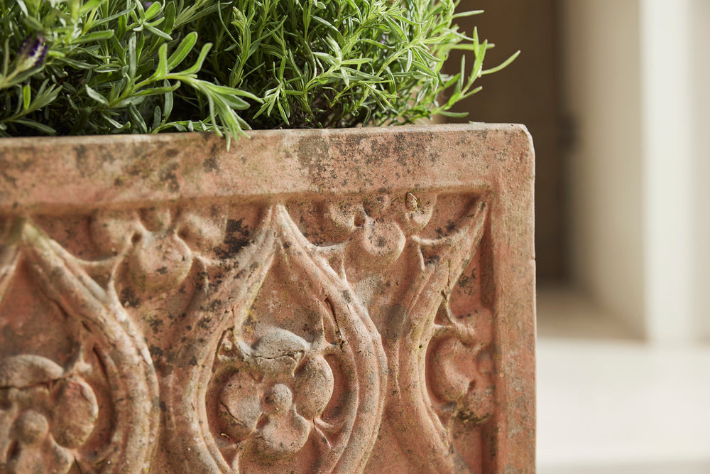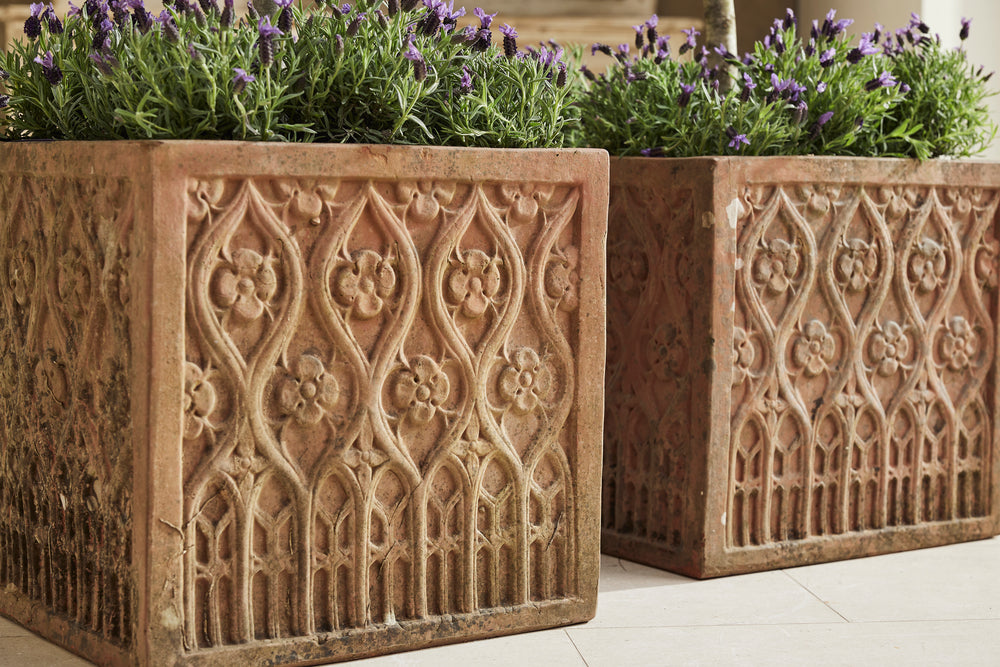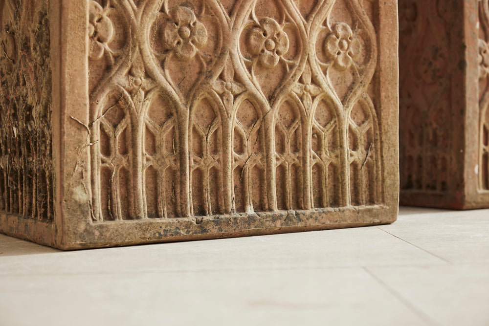 These good size terracotta planters with a raised foliate decoration are from the estate of the late Mary Quant a renowned fashion designer from the swinging 60’s. They are highly decorative and would be fantastic at an entrance with a small tree or shrub. They are in very good condition and well weathered so they would seamlessly into any mature garden.