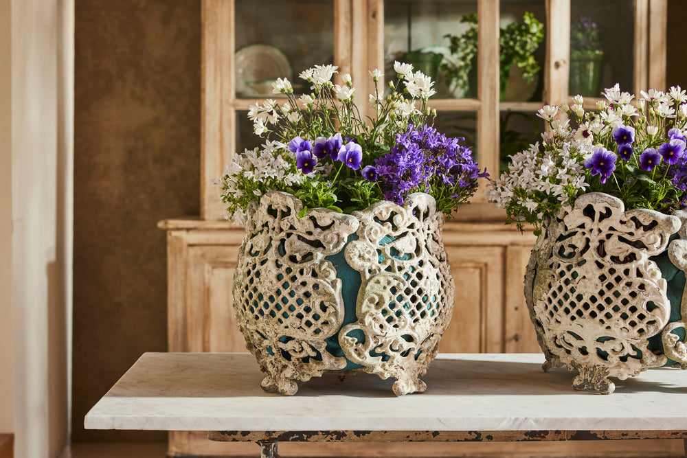 This elegant pair of mid-20th-century garden planters are crafted from painted zinc and beautifully weathered over time. Each planter sits on four distinctive feet and features an intricate lace like perforated design, adding a delicate yet striking touch. They are them filled with seasonal plants, enhancing their timeless charm. A truly unique and stylish addition to any outdoor space.