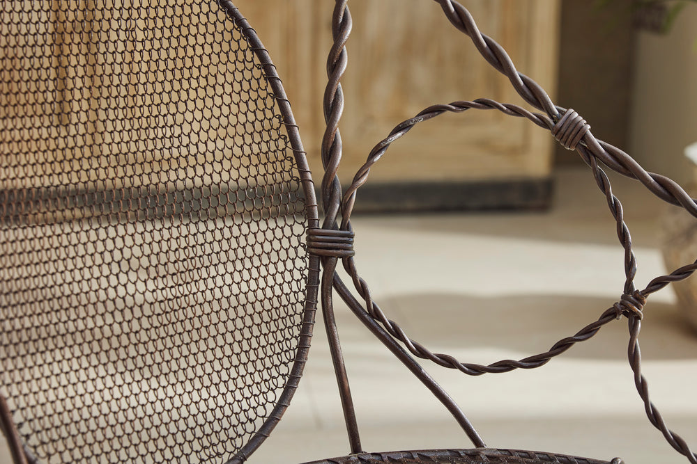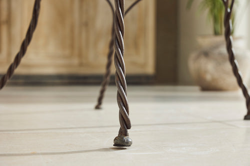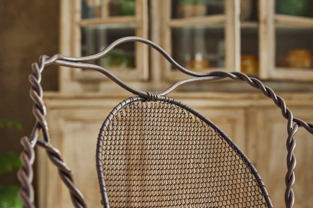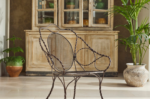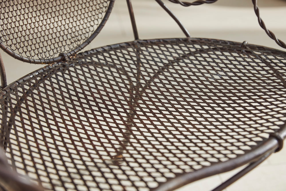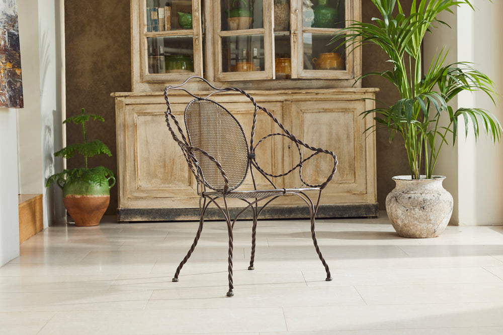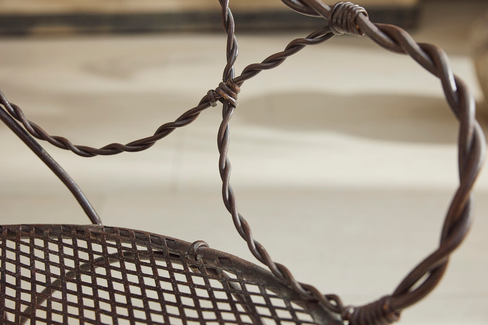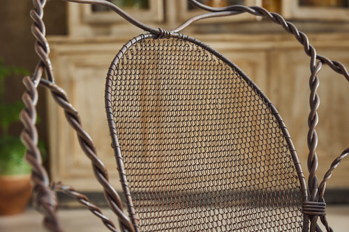 This pair of armchairs was made in around 1930s by foundry Kollen in Dijon France. They have very distinctive frame whereby the wrought iron has been twisted to resemble rope. They have been clipped, clamped and tied together with no signs of welding. They are very comfortable and have a patterned metal seat and a mesh back and are in very good original condition. They must to have been used in a garden room as the effects of weathering are minimal. A very stylish and rare pair.