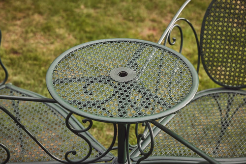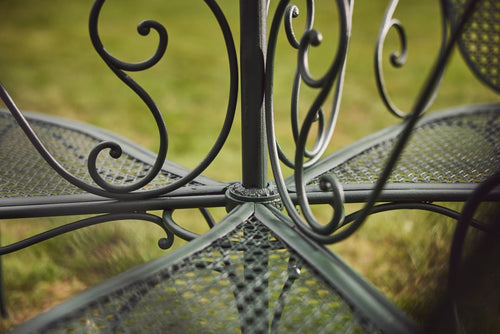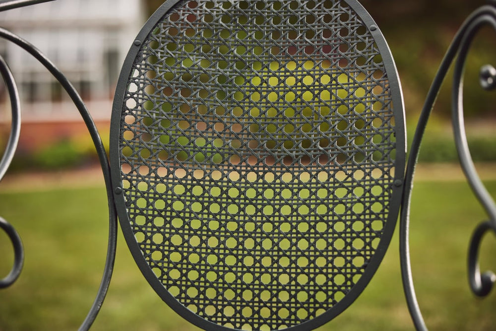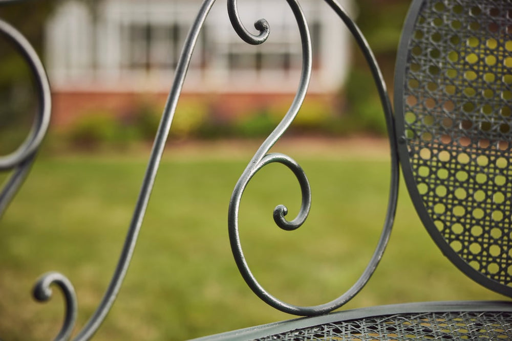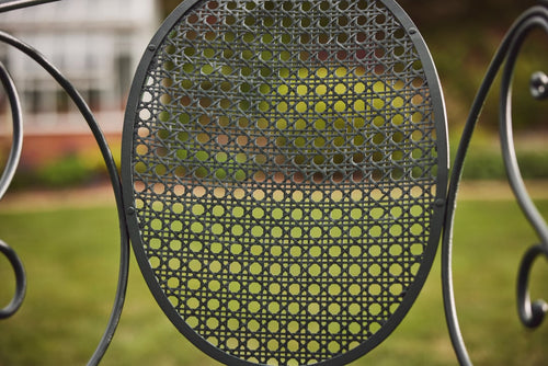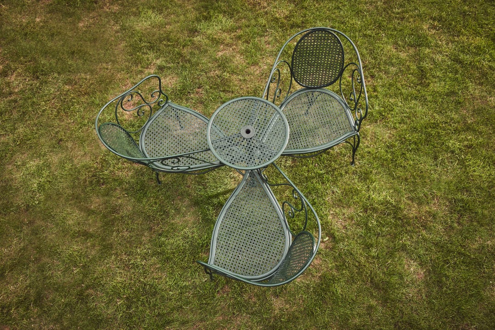 Crafted with a wrought iron frame and faux bamboo seats, it remains in very good condition considering its age. The distinctive three-seat design, arranged in a propeller-like formation, makes this both a conversation piece and a decorative focal point for any garden or orangery.
