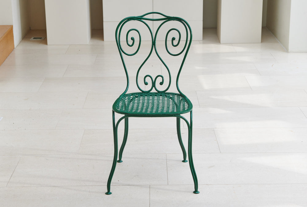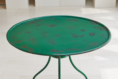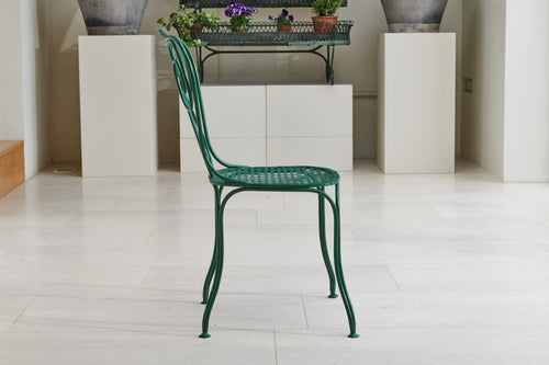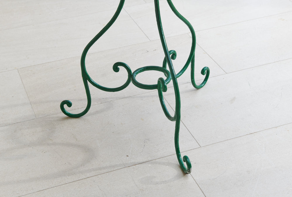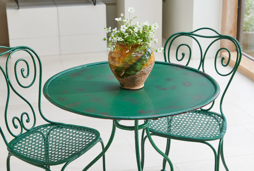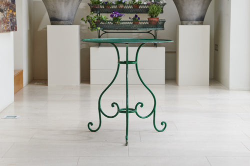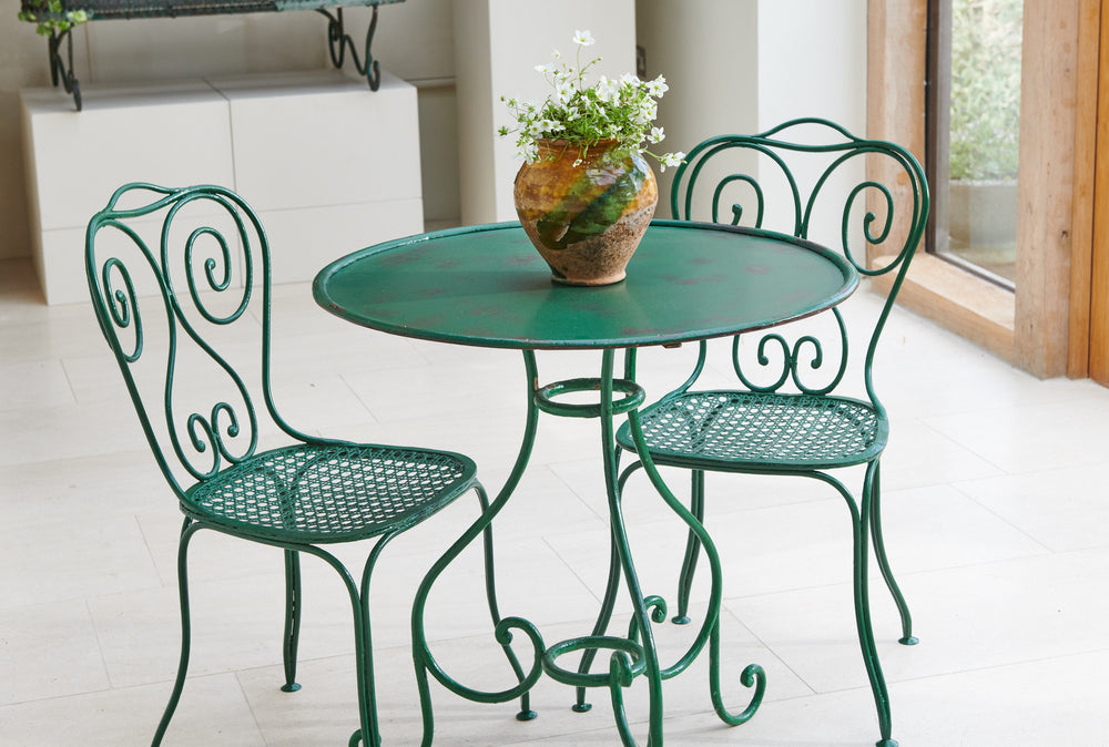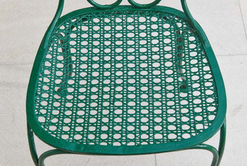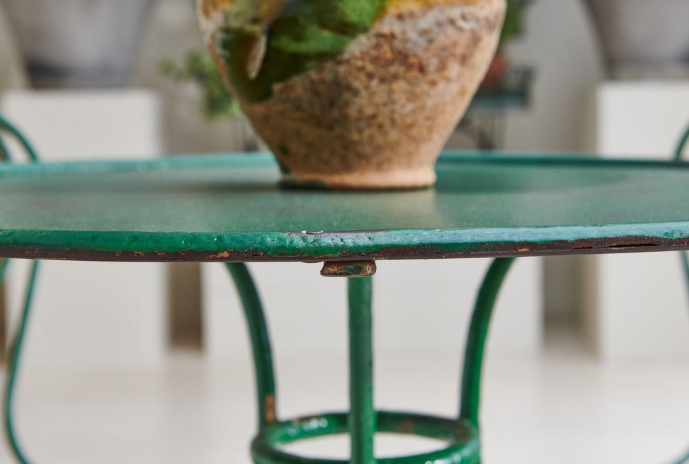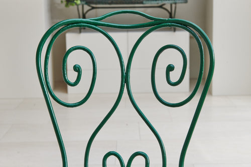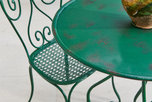 A hand-forged green bistro set featuring a curved legged table and two chairs with metal faux bamboo seats. This very attractive set which is in very good condition would work particularly well on a small patio or balcony.