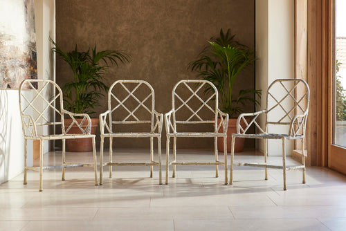 A set of four painted cast aluminium garden armchairs in a faux bamboo design, with cockpen backs, and slatted seats with the legs joined by H stretchers. They are strong and comfortable chairs and would look good with a metal or wooden table.