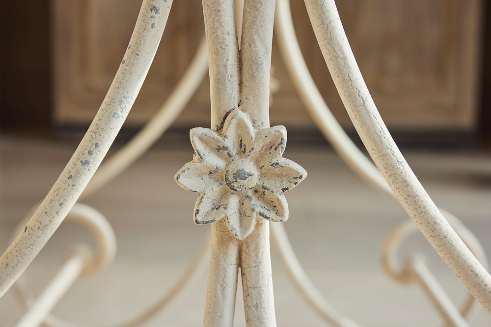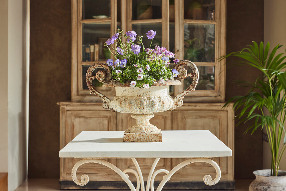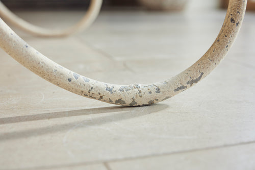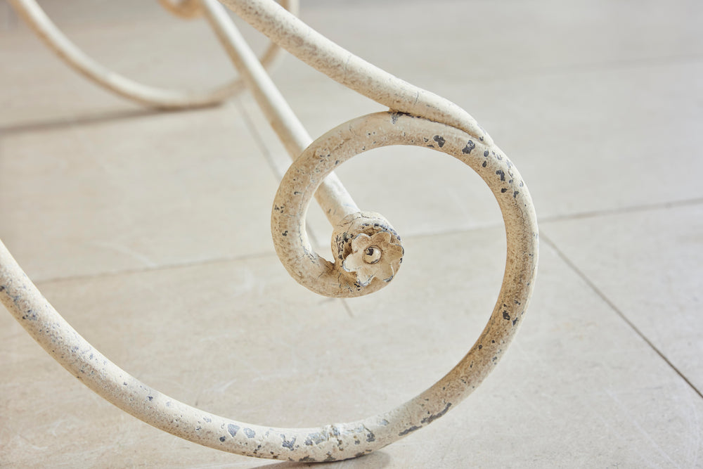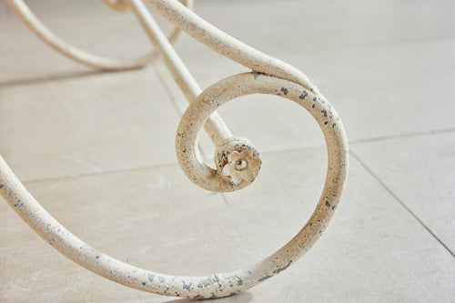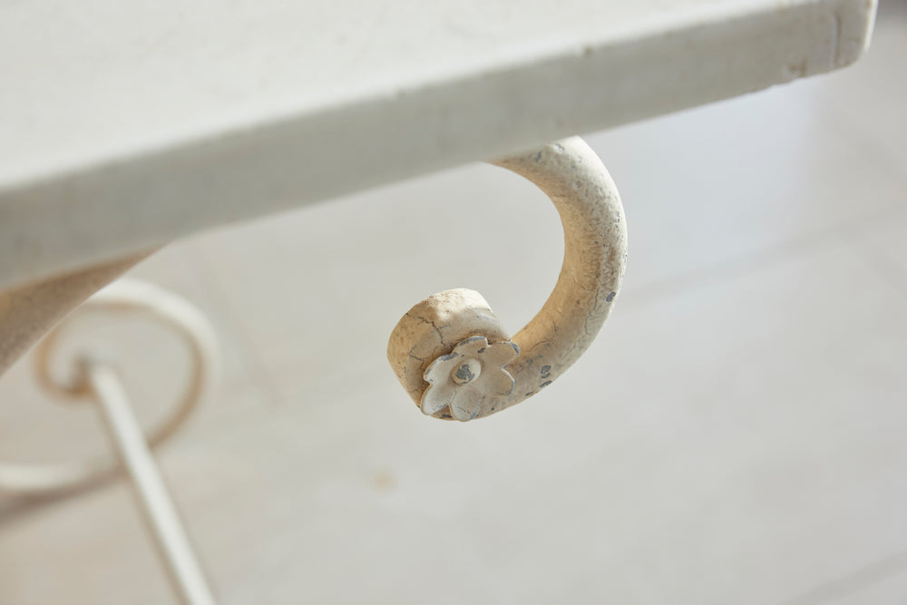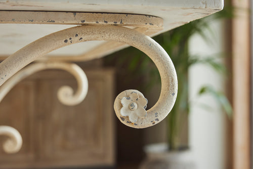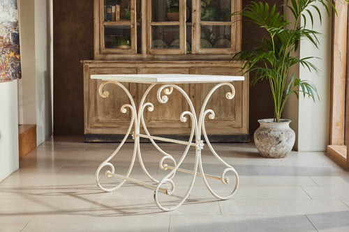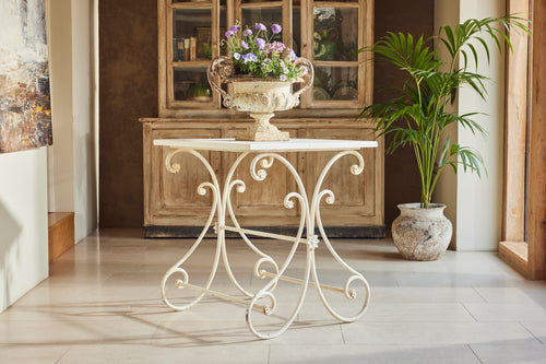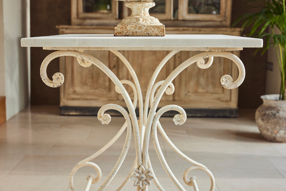 We bought this very attractive table in the South of France where it had been used as florists work table for over 100 years. It has a hand forged curved wrought iron frame which features decorative floral motifs throughout the design. It comes with its original marble top and at a working height of 81cm would make a lovely and unique console, hall table or side table in a garden room.