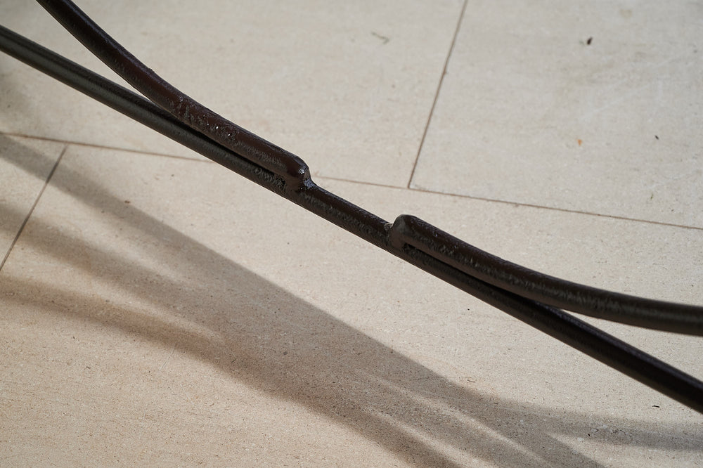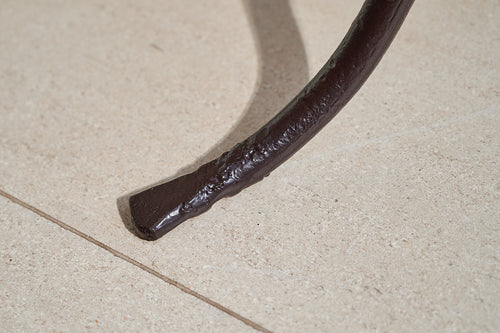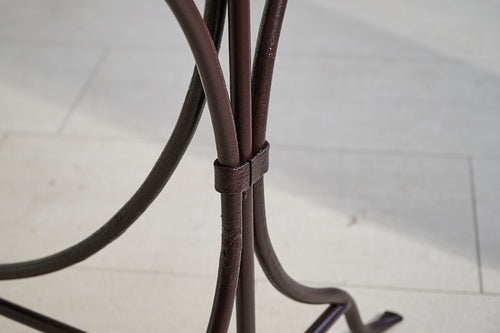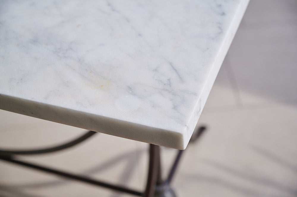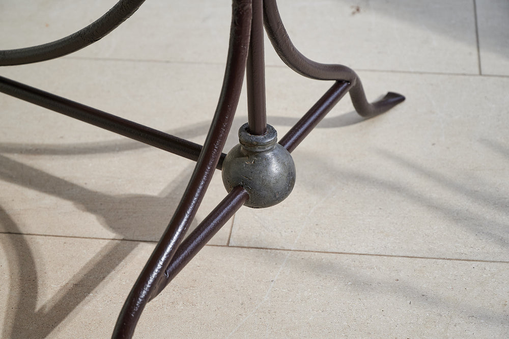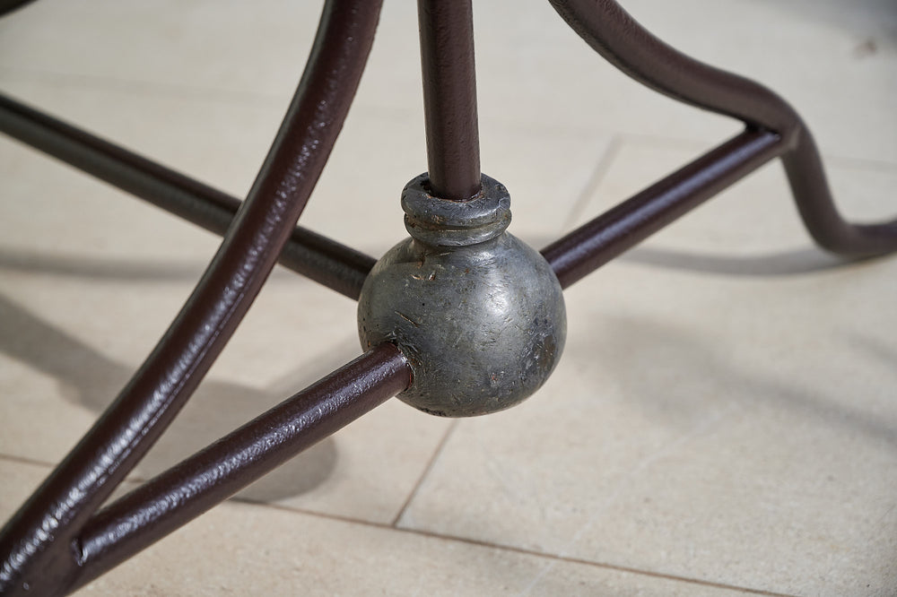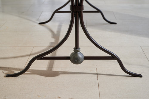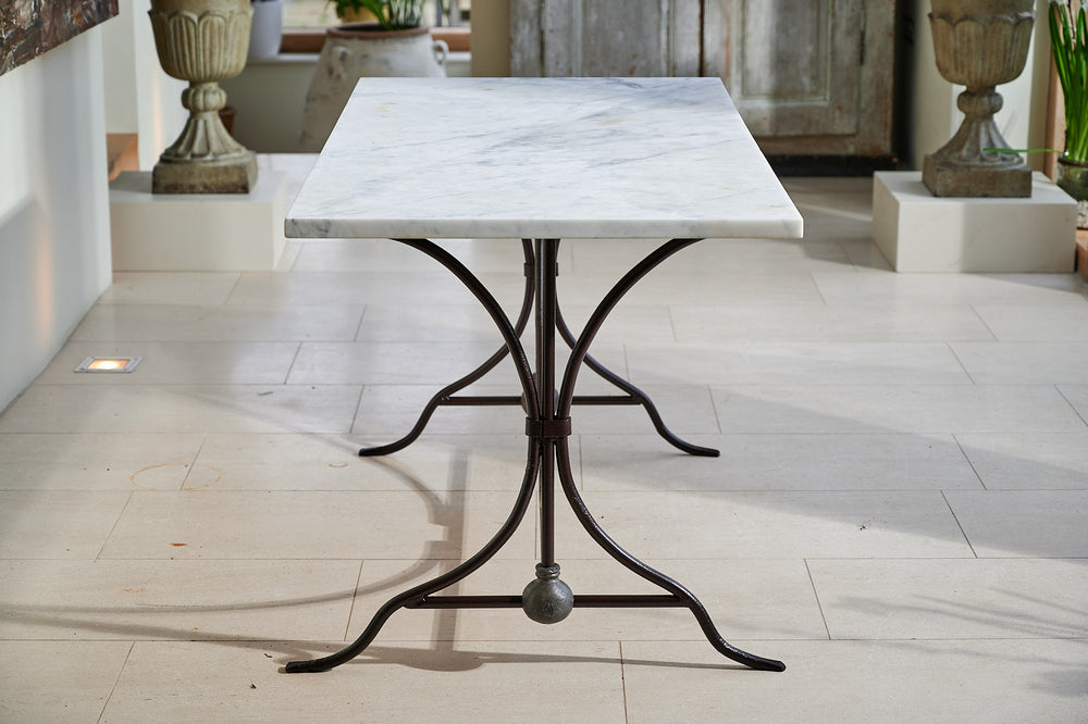 We bought this table in Northern France, where it had been used as florists work table for over 100 years. It has an attractive wrought iron frame joined by a large ball of lead at either end. It features its original marble top, which is in good condition and at a working height of 79cm, would make a lovely and unique console or hall table