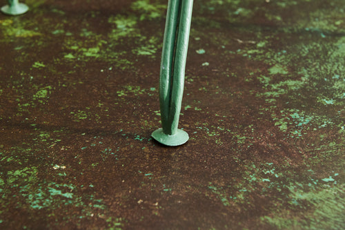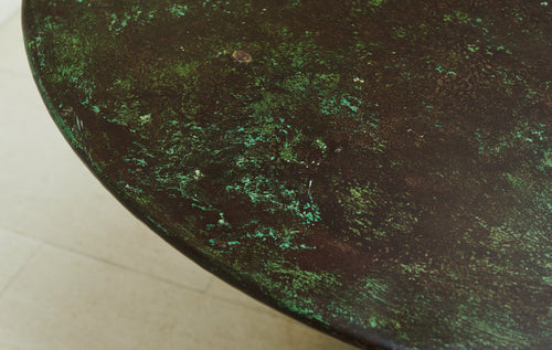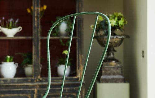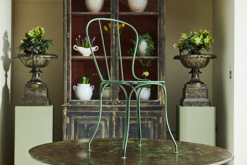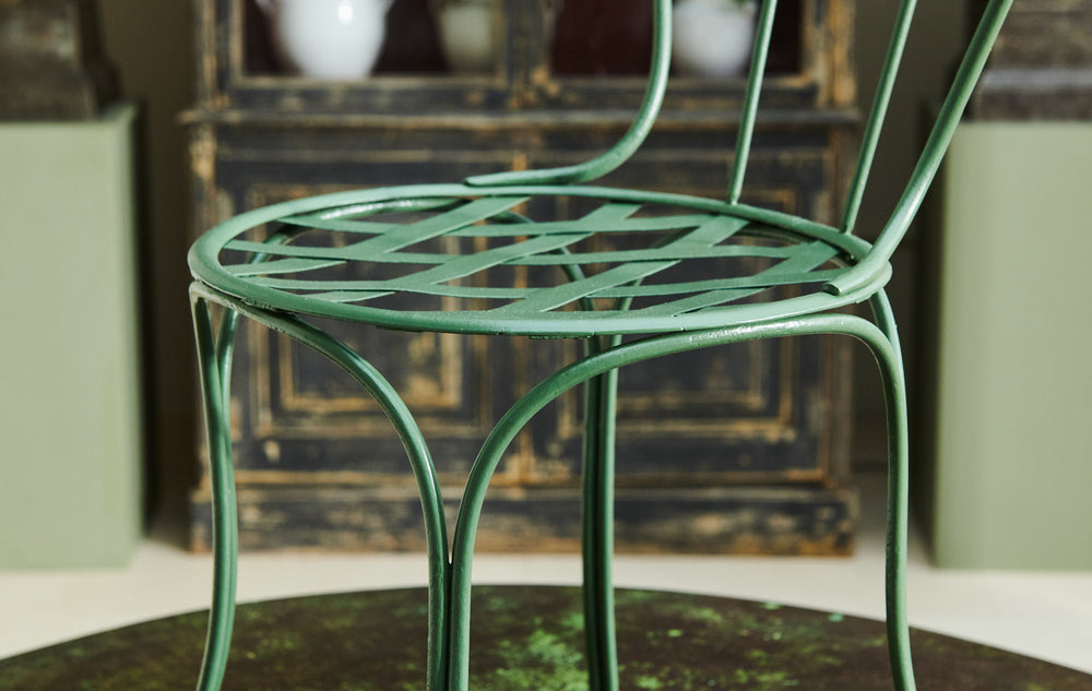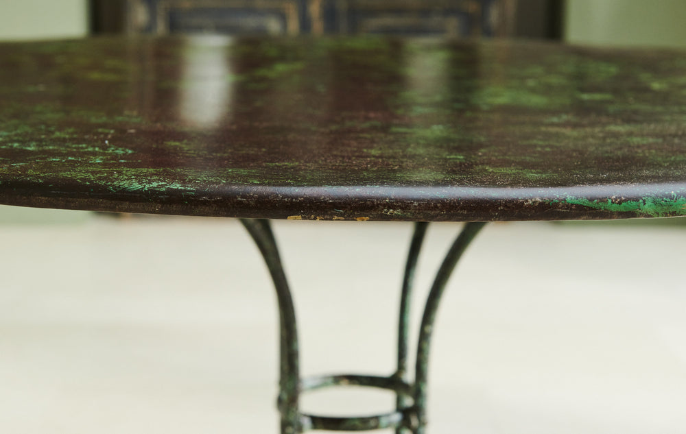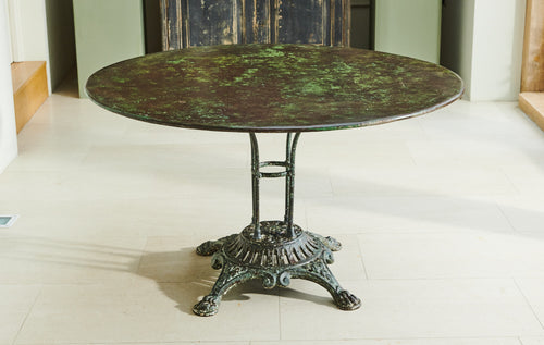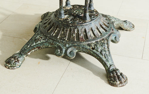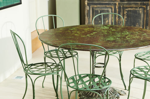 A French garden table from the 1930s with a heavy cast iron bass consisting of 4 lions claw feet. When preparing the table a fantastic green patina was revealed after the old peeling top layer of paint was removed. The six chairs from the same period have been restored to complement the patina of the table to create a very attractive, functional and unique garden set.