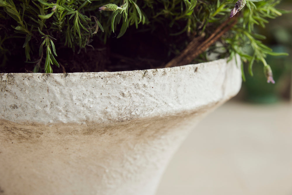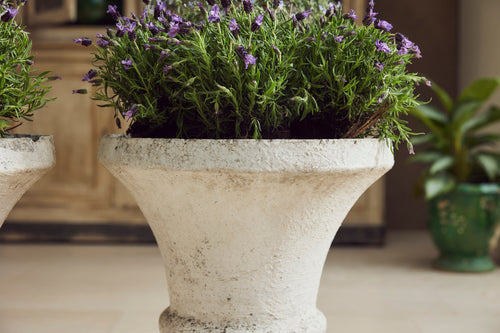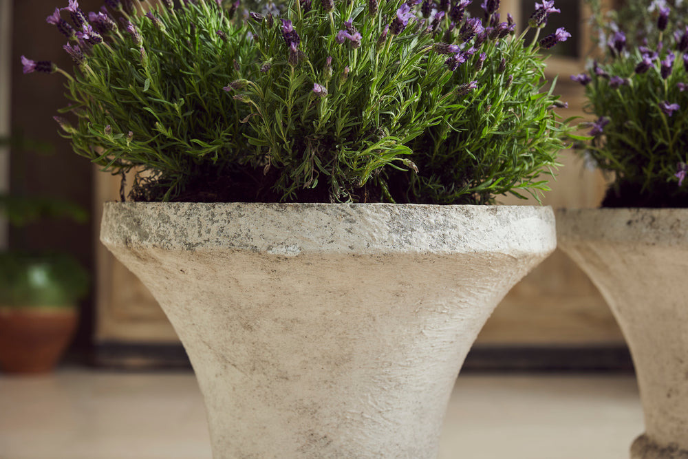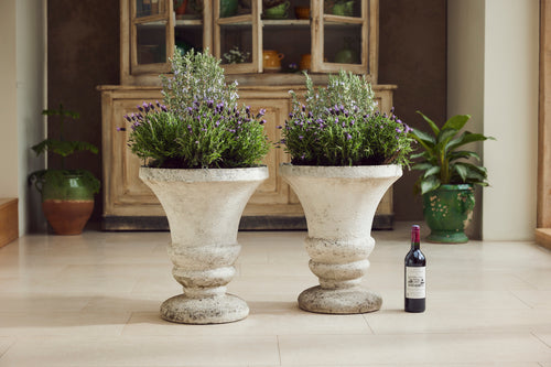These well cast composite urns are a good size and in very good weathered condition. They are large enough to accommodate a small shrub whilst also being perfect for seasonal flowers. They represent a good value opportunity to bring some mid century style to you garden.