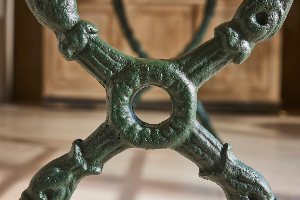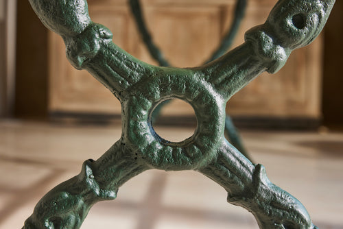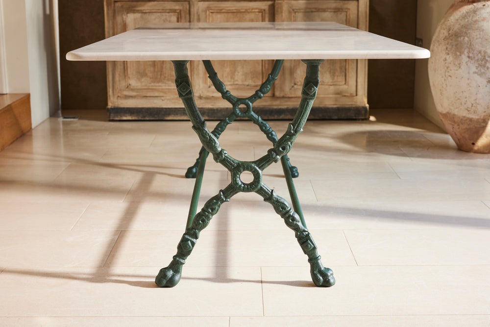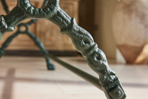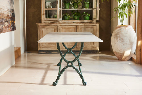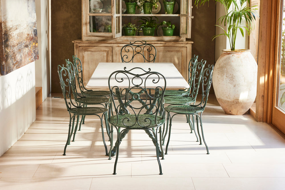 We bought this exceptional garden table and 8 chairs chairs at a Chateau sale in Orleans France. The table has an attractive cast iron frame and a new marble top as the original had perished. The set included two armchairs and six matching chairs all of which have been restored and powder coated and are therefore in very good condition. The chairs include hand made seat cushions making it the set perfect for comfortable and elegant entertaining this summer.