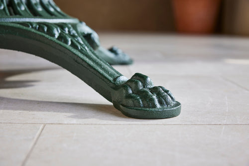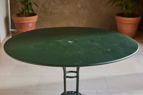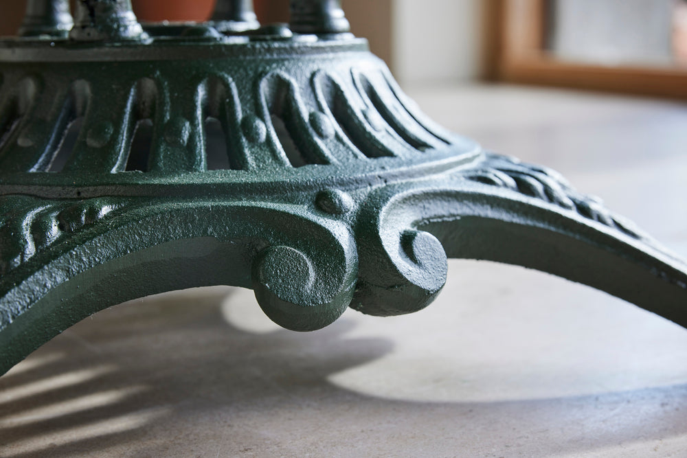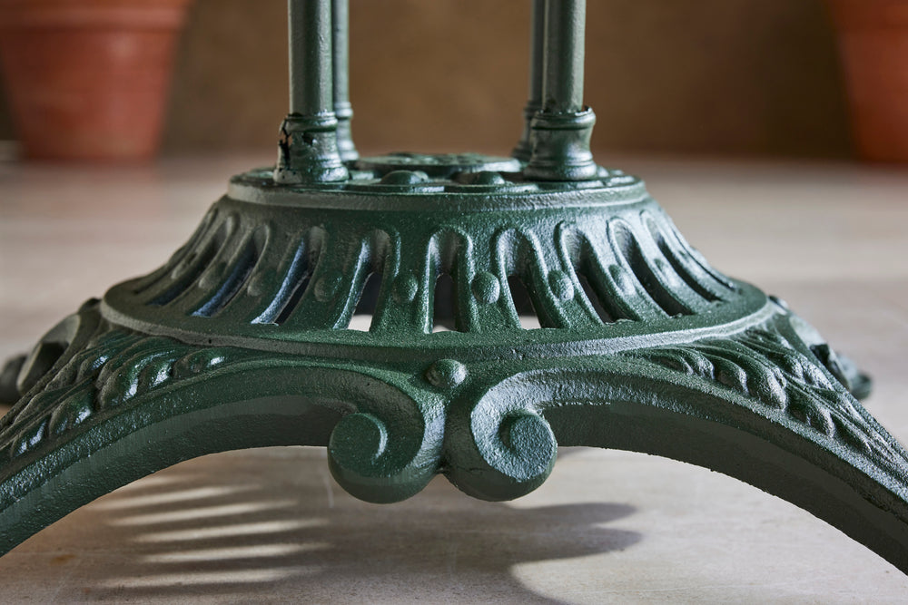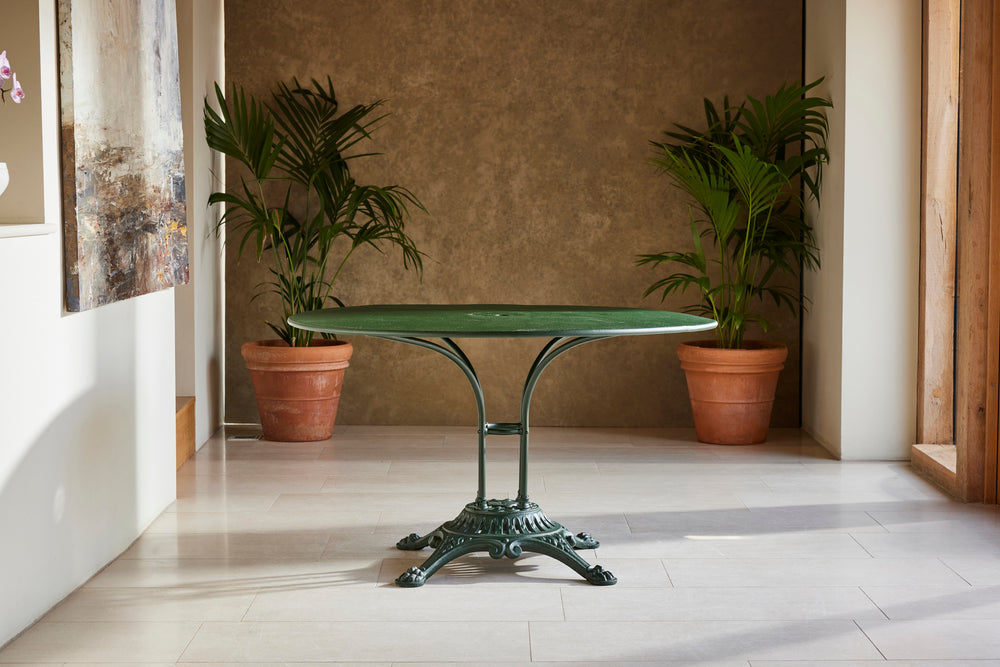 We love this highly sociable round garden table. It has a very strong and decorative cast iron base on which sits a painted metal top.