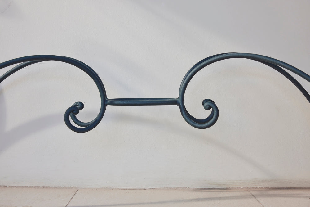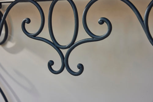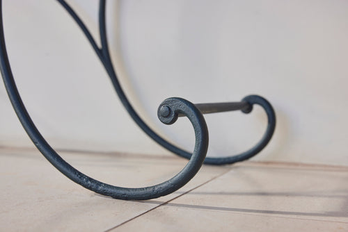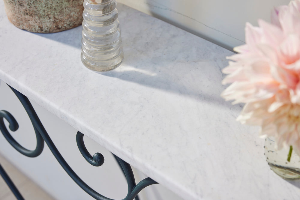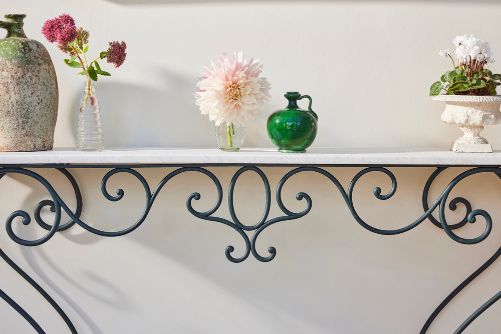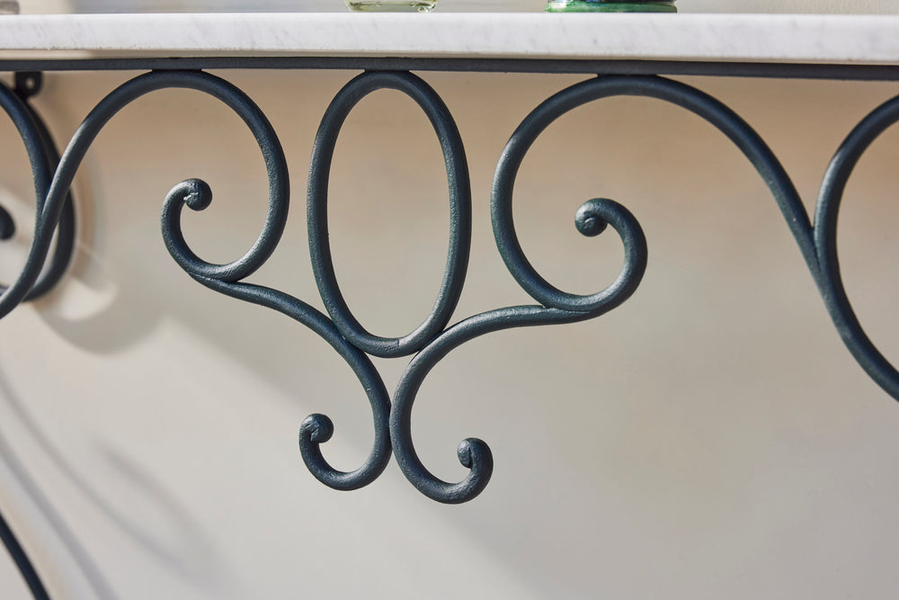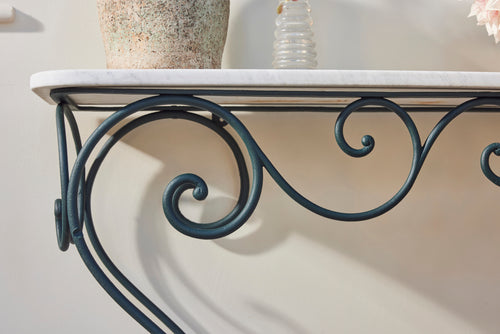We found this lovely 19th century hand forged console table seemingly abandoned in a French antiques dealers garden. It required quite a few repairs and the original marble top had perished so has been replaced with new. The curved frame is very attractive and it would look as good in a garden room as it would in a hallway. Owing to its design it does required fixing to the wall and there are two eyelets at either end beneath the removable marble top for this purpose.