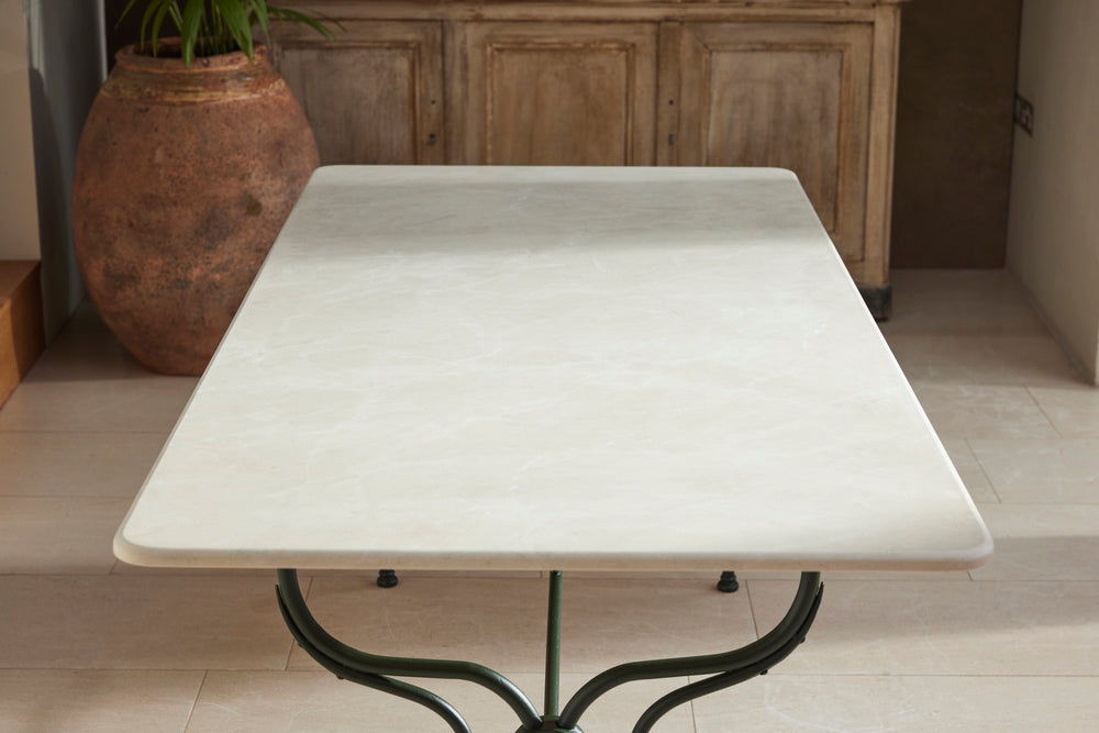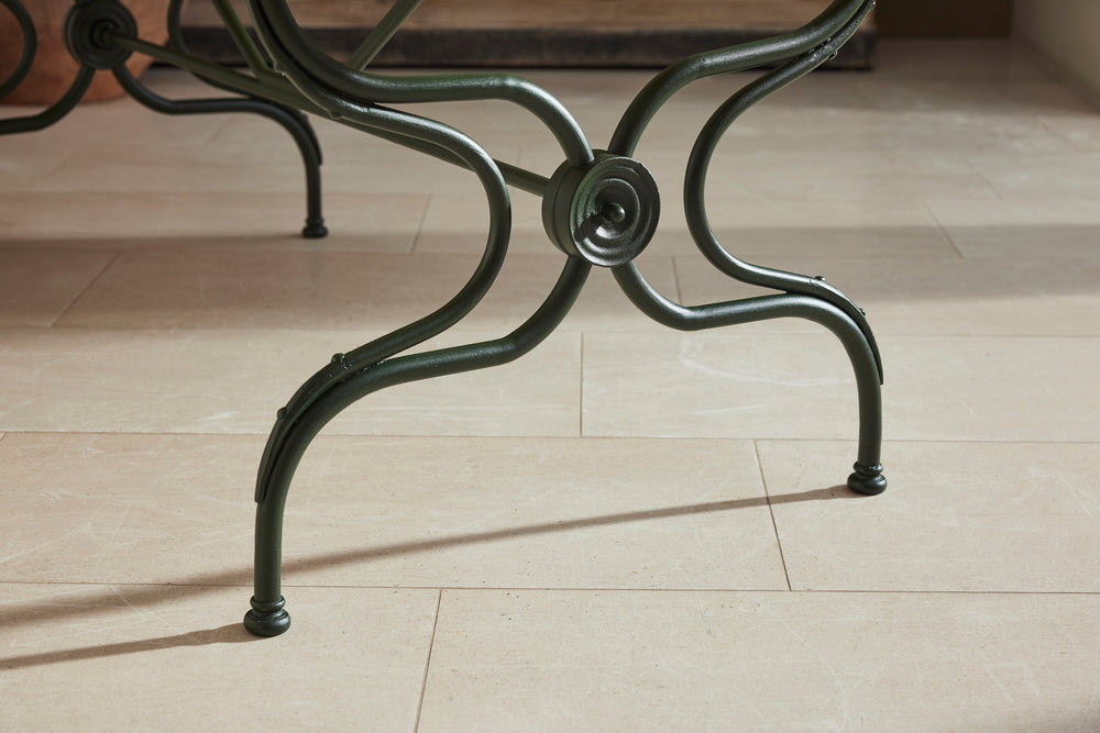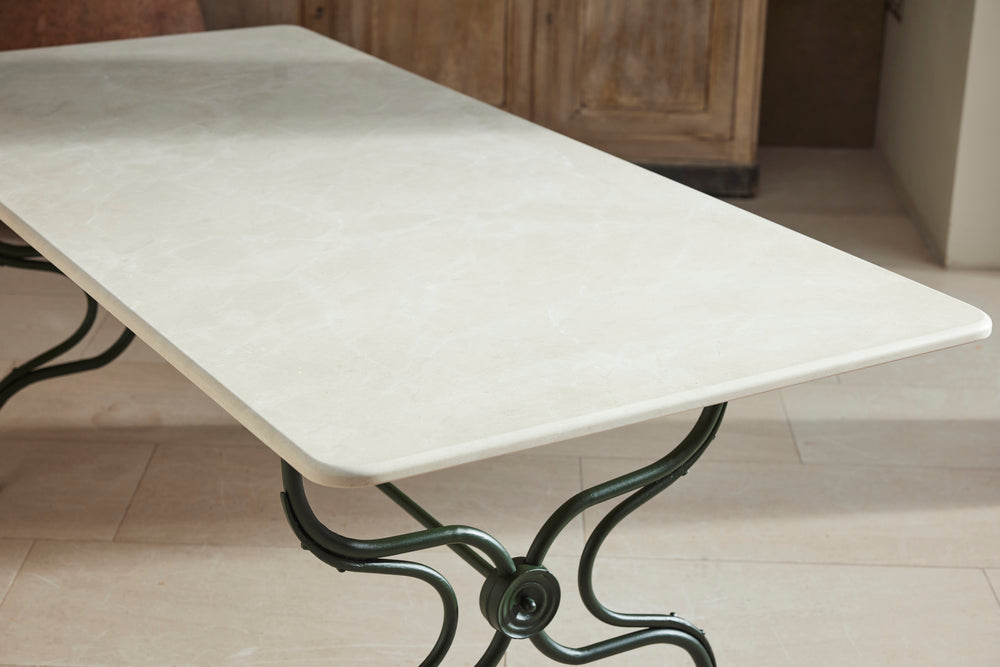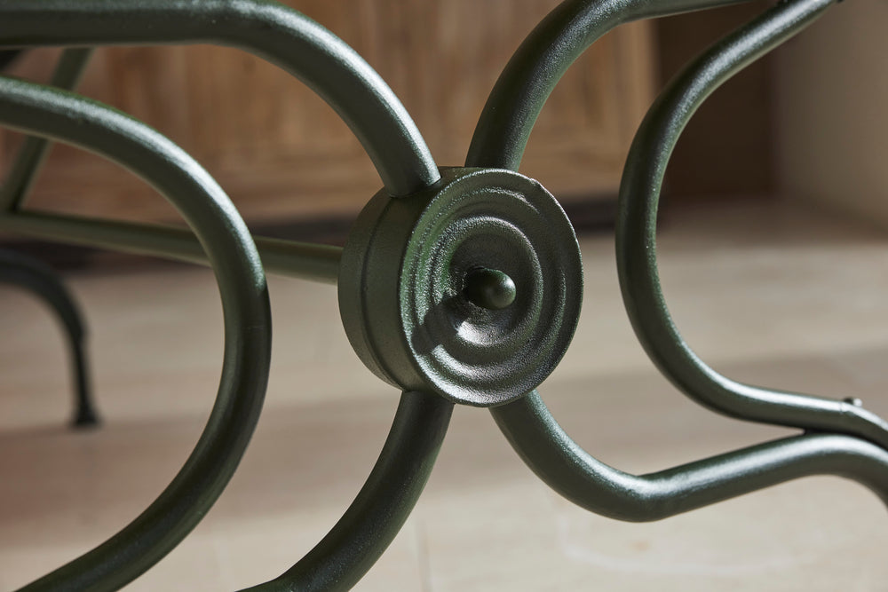 This substantial 19th-century dining set is a true statement of elegance and craftsmanship, perfect for those who appreciate both style and durability. At its heart is a marble-topped table, resting gracefully on a classic French macaron wrought iron base, combining strength with timeless beauty.