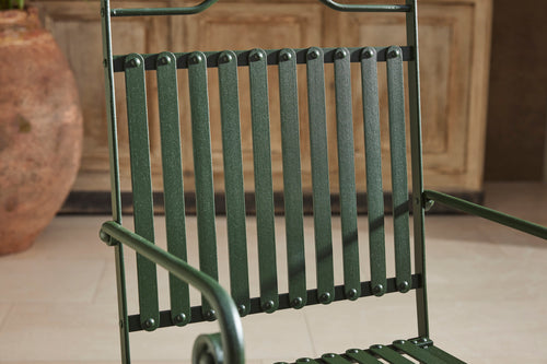 Accompanying the table are rare and distinctive strapwork armchairs, a striking design feature rarely found today. Each piece has been fully restored and powder-coated, ensuring both longevity and resilience against the elements. Ideal for stylish outdoor entertaining, this exquisite set will bring a touch of historic charm and sophistication to any garden, terrace, or patio.