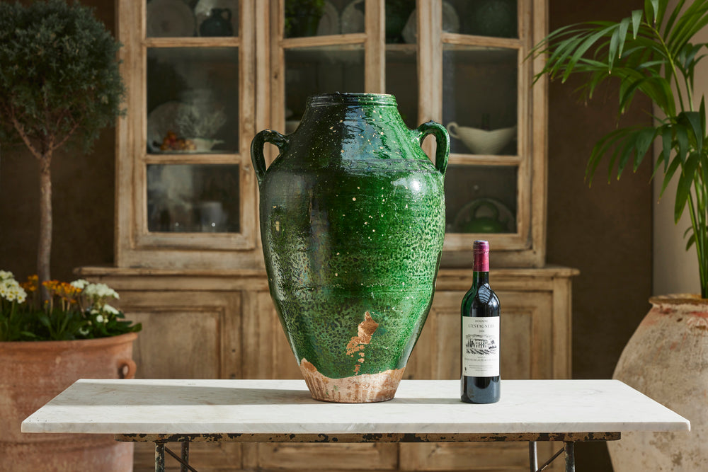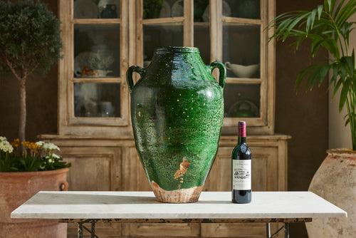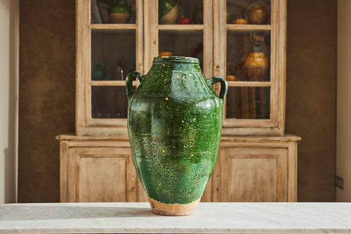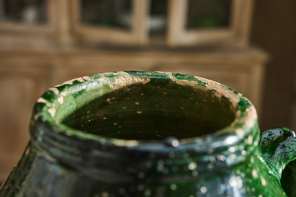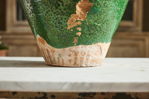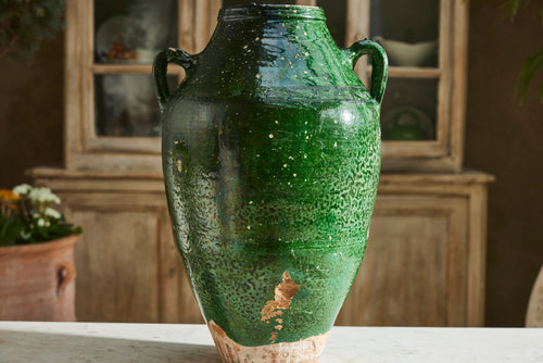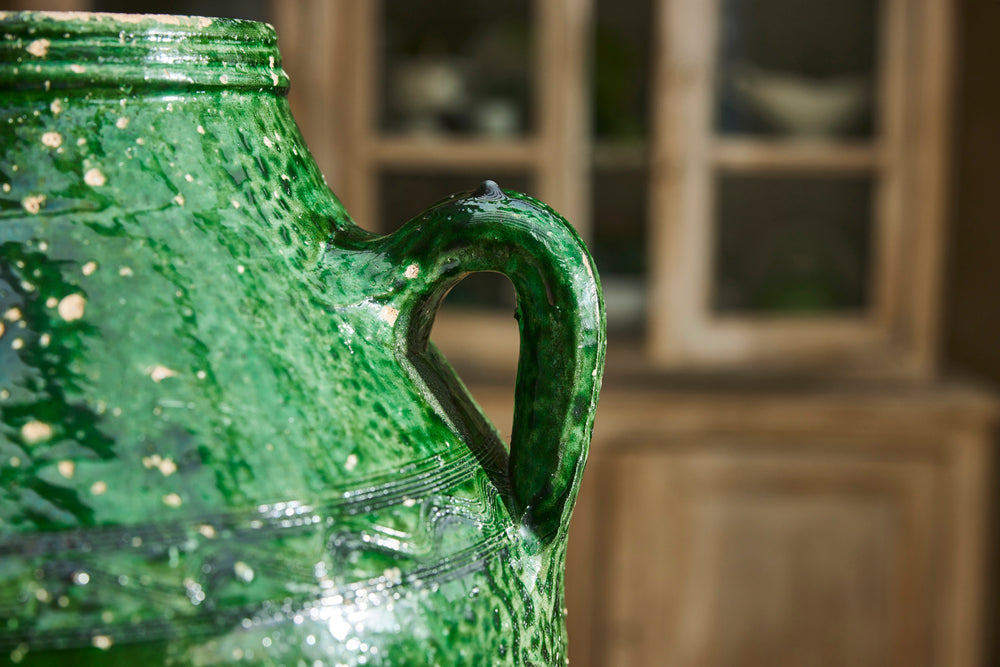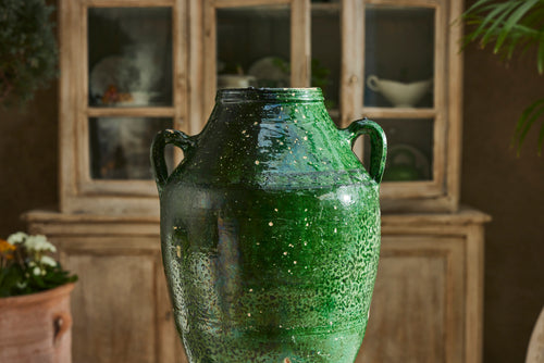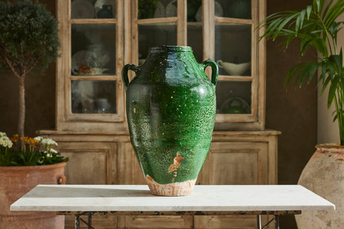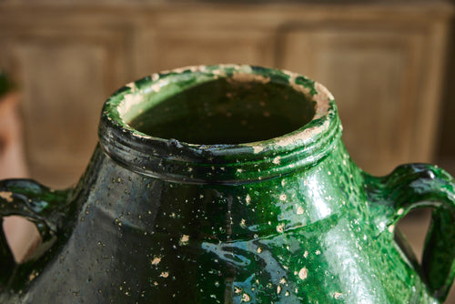 This authentic Greek olive oil urn dates to the mid-19th century and features a soft green glaze with classic side handles. Once used for storing olive oil, it now makes a characterful decorative piece for the home or garden.