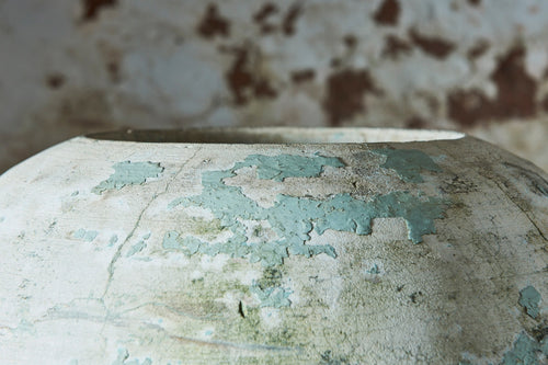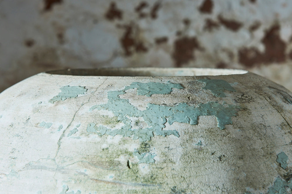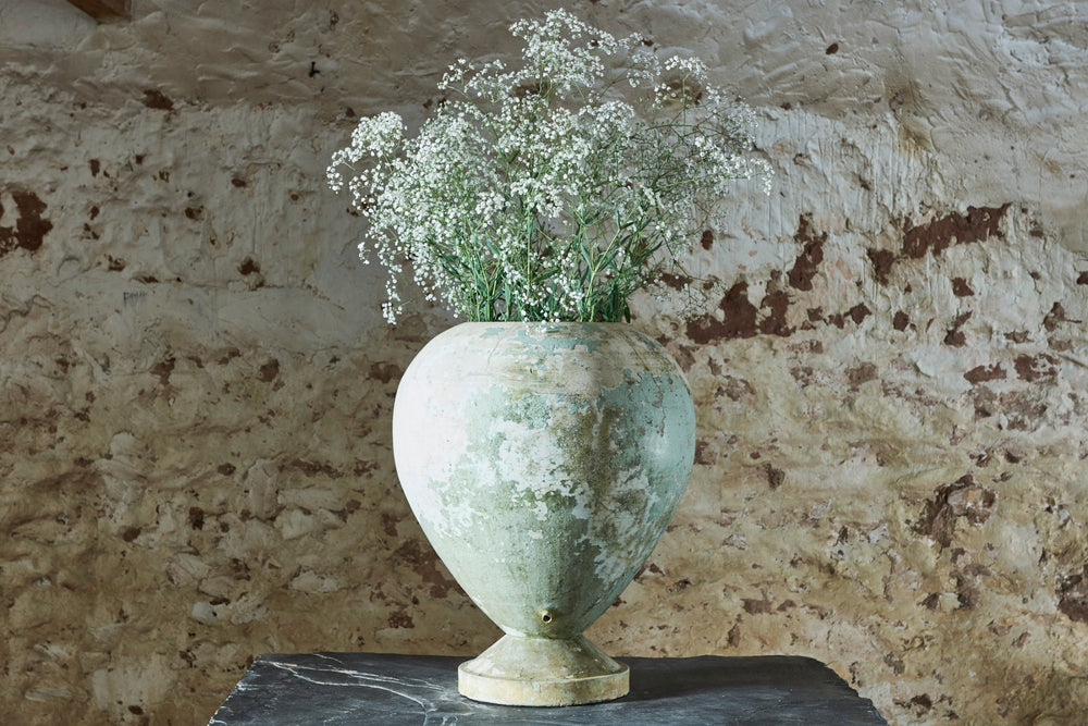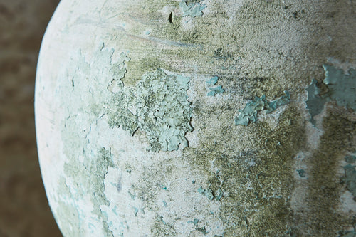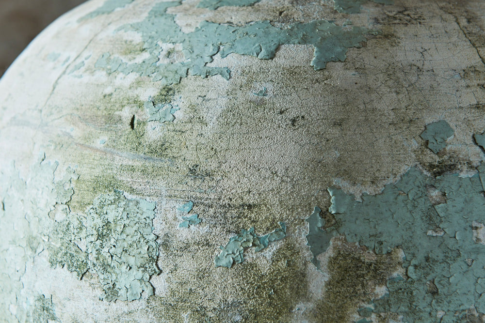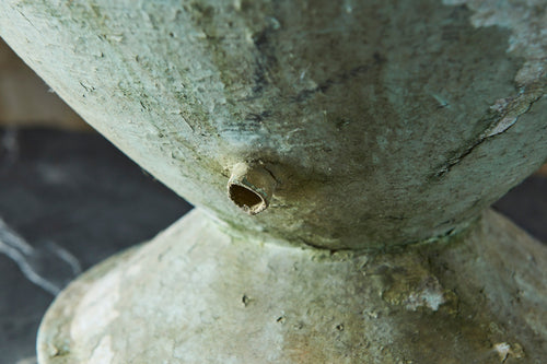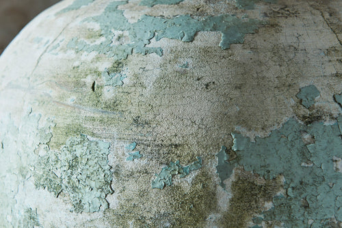 We call this the Globe planter as the patina and shape looks to us like a world map! This contemporary looking piece in pale green and cream looks great on its own or filled with flowers. Moulded from a composite cement and it good vintage condition it is as unique as it beautiful. French 1960's H:62cm Dia 44cm