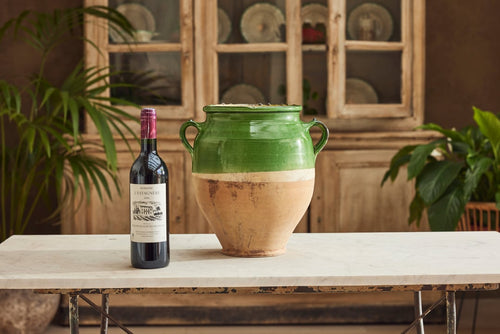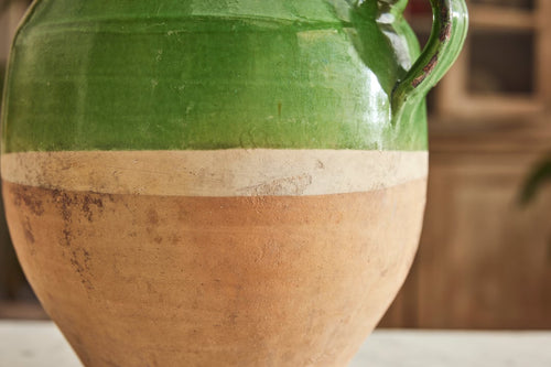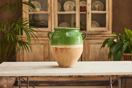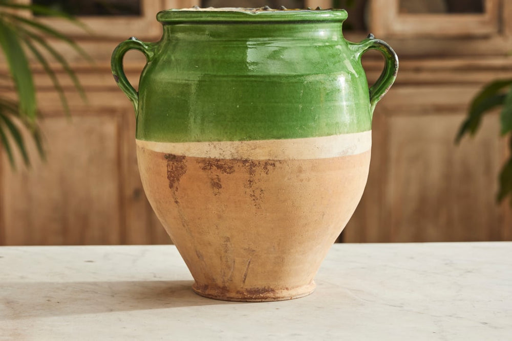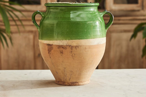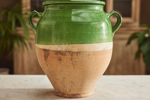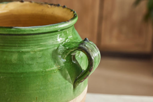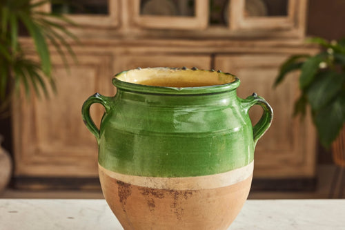 This eye-catching confit pot from the 1900s features a subtle blend of green glazes and immediately draws attention. Originally used in French kitchens to preserve foods and store other essentials, it remains in very good condition. A characterful decorative accent that brings both colour and history to any interior setting.
