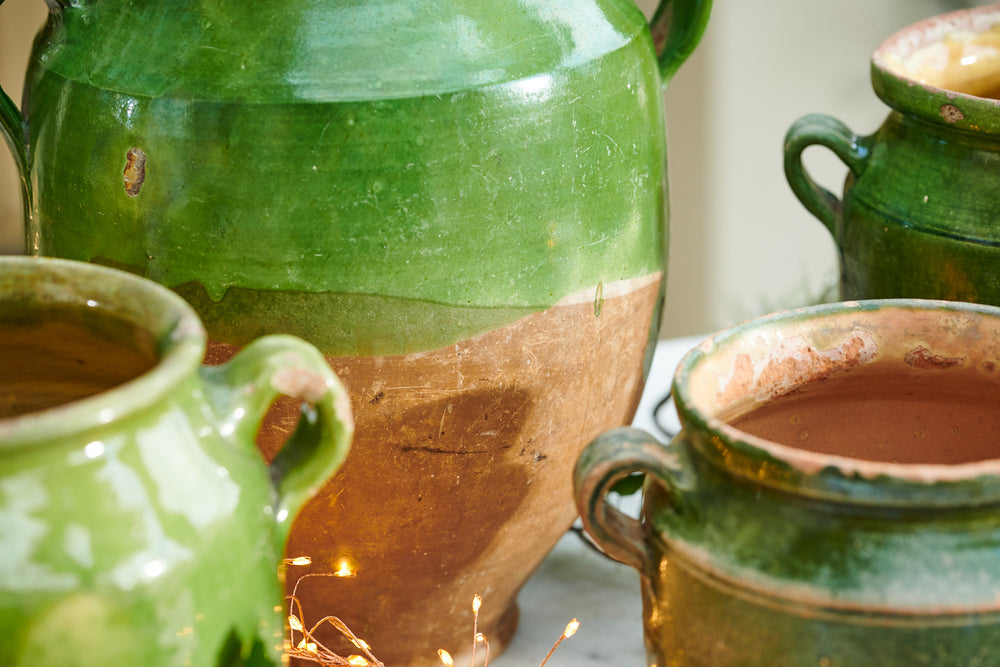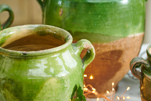 We bought these beautiful confit pots in a market in Bordeaux. "Confit" is French for "to preserve" and little pots like this one were used for preserving food usually in a larder but sometimes buried underground! Confit pots have a very pleasing shape, with two small handles and a plump round body. The green glaze is extremely attractive and in wonderful condition for a domestic item. Prices are from £195.00 per pot and vary depending on size. Please contact us for further details.