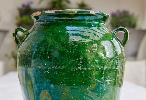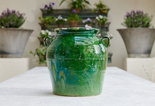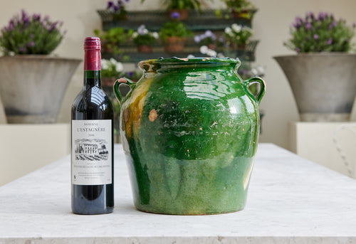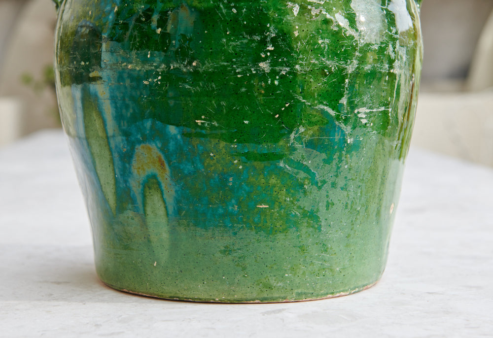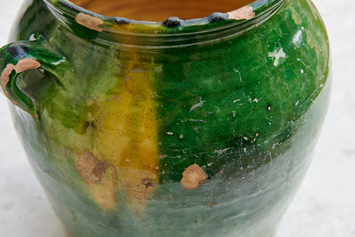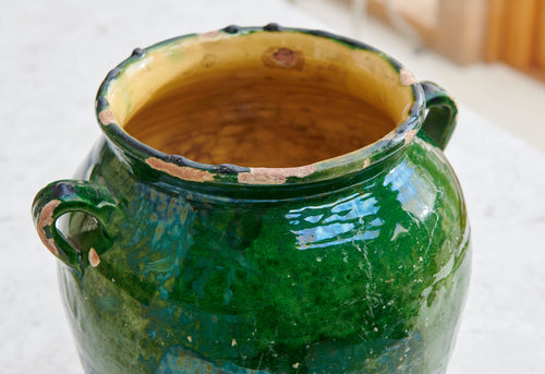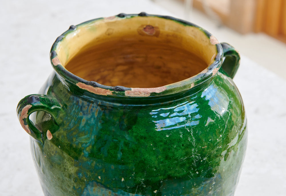 A two-handled 19th-century confit pot with a beautiful iridescent green glaze on the outside and a yellow glaze on the inside. Used in France to preserve food this unusually good looking pot would make a fabulous decorative item.