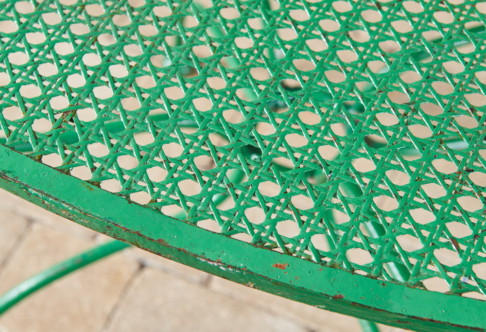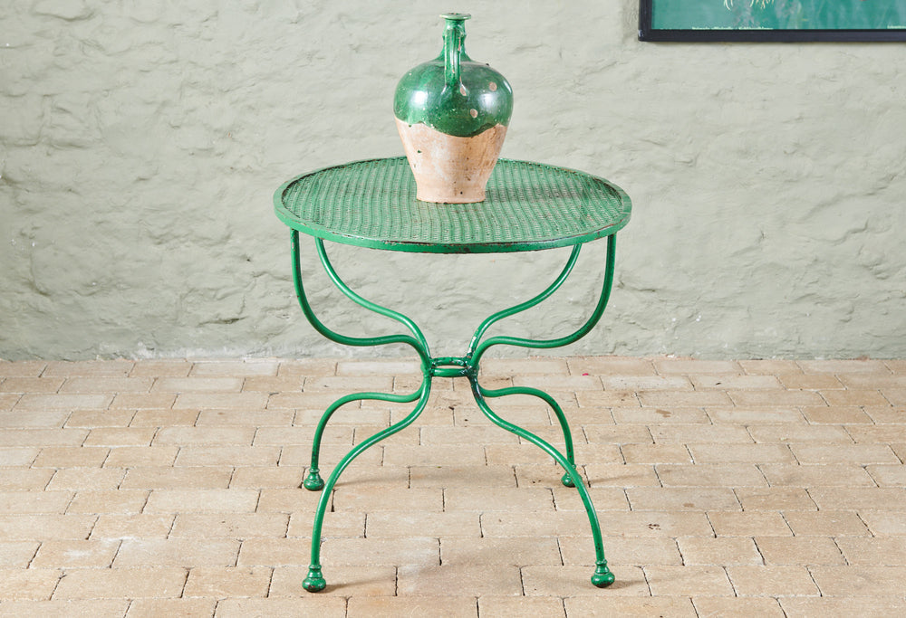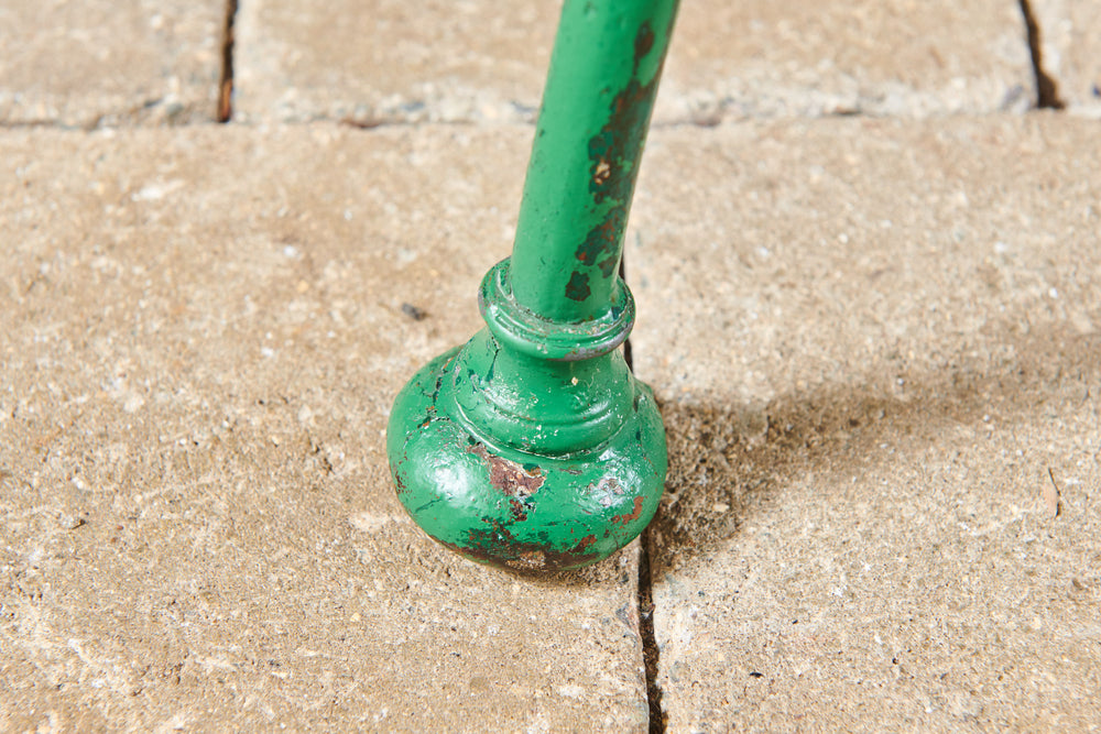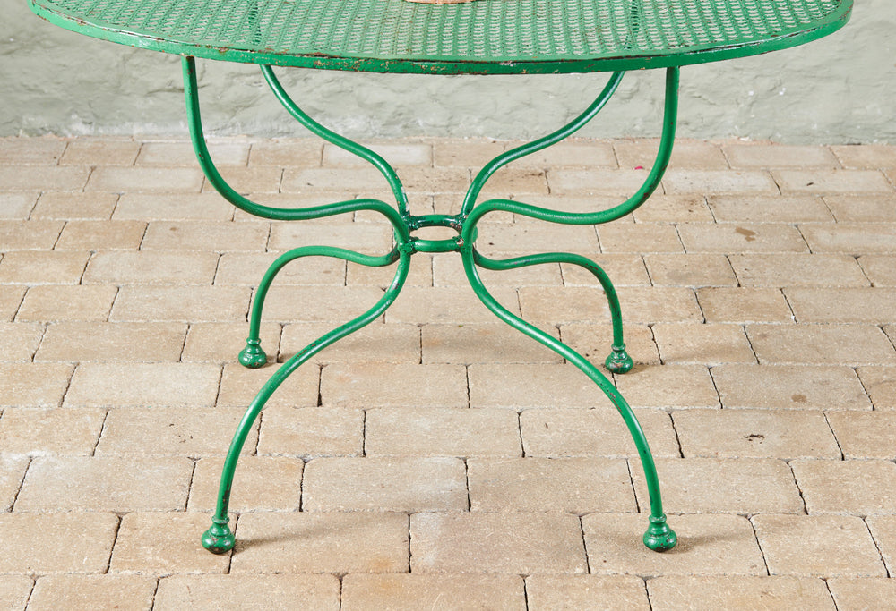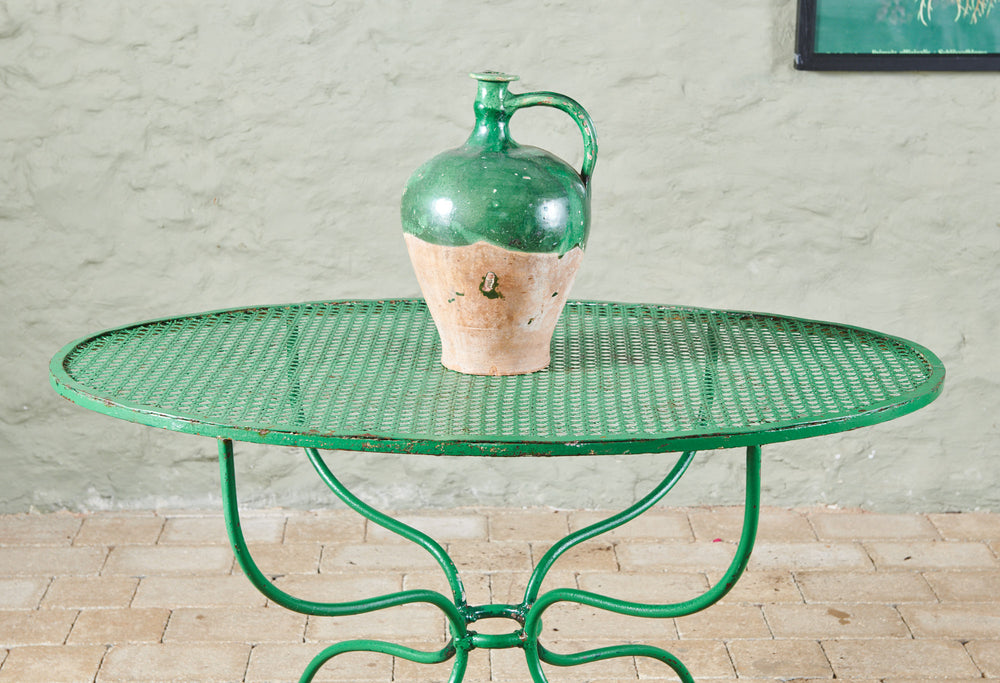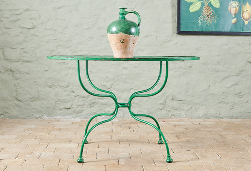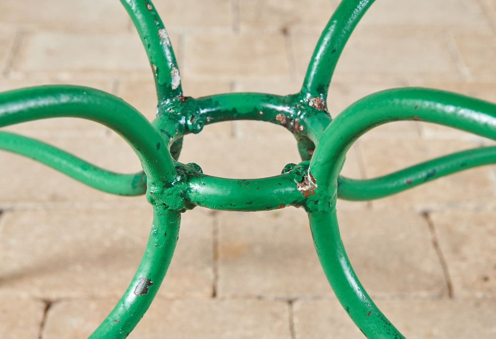 We really love oval tables and this 19th-century one is no exception. In it is original green this hand-forged wrought iron table with a faux bamboo top is in very good condition considering its age and use. It features its original lead feet and would easily seat 4 adults.