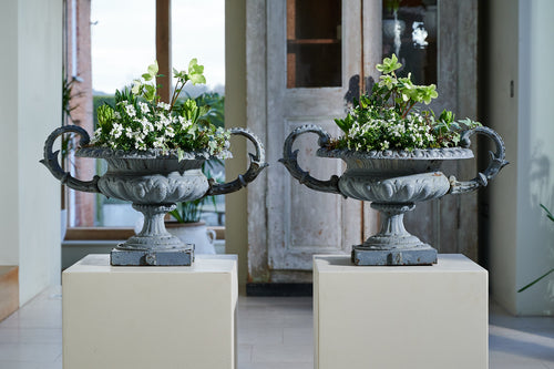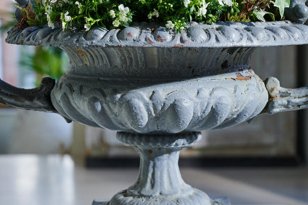 A really attractive pair of cast iron handled urns from the early 20th century in their original grey paint.