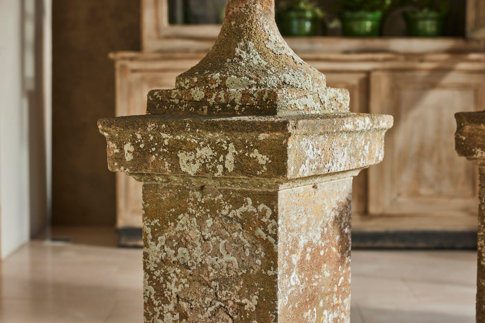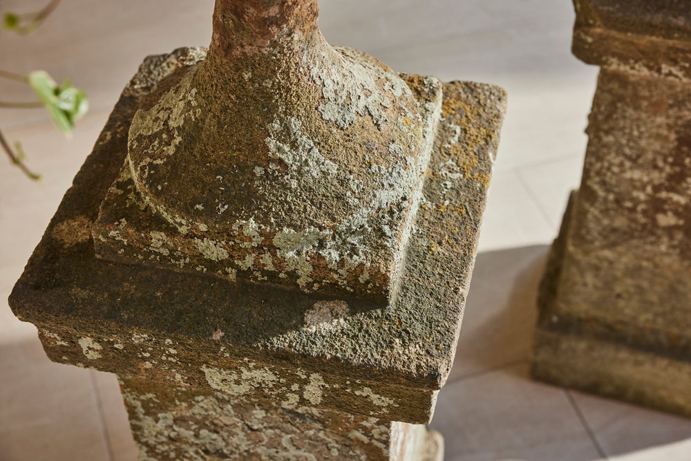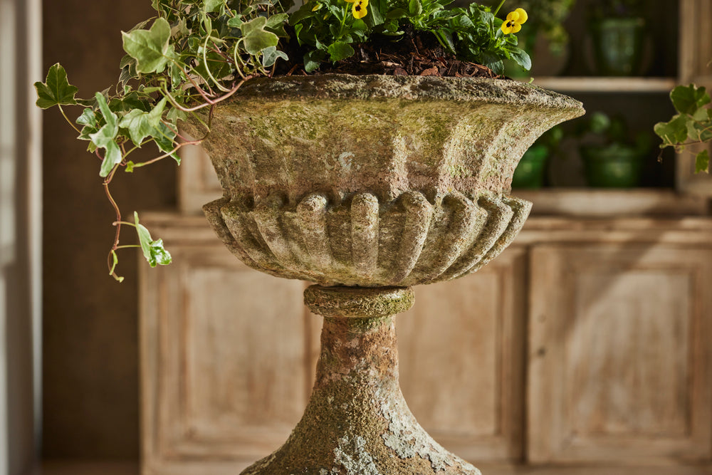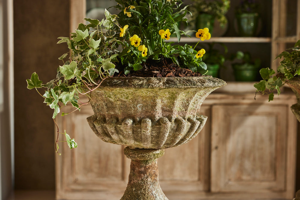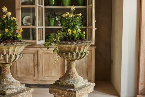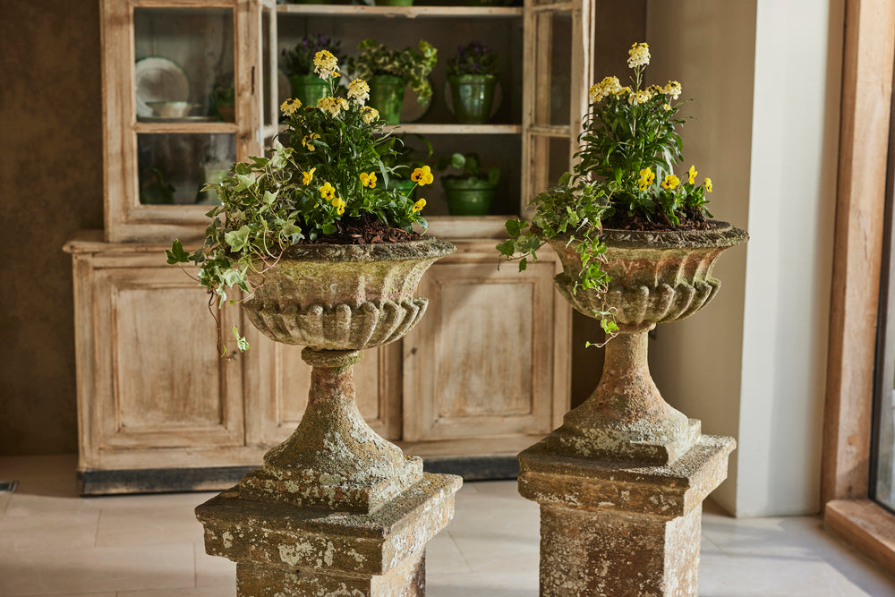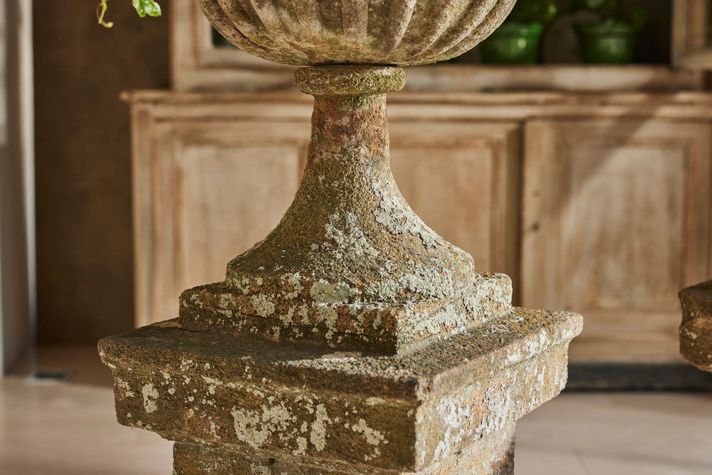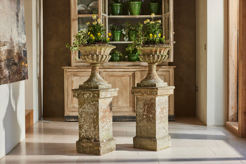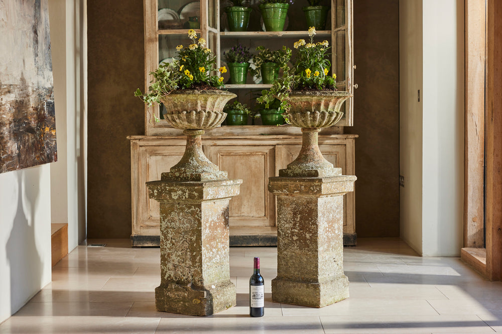 Hamstone, a distinctive honey-colored limestone from Somerset, England, is renowned for its durability and warm hue that weathers beautifully over time. These carved Ham stone garden urns mounted on pedestals would serve as elegant focal points in any traditional setting blending classical design with natural charm.