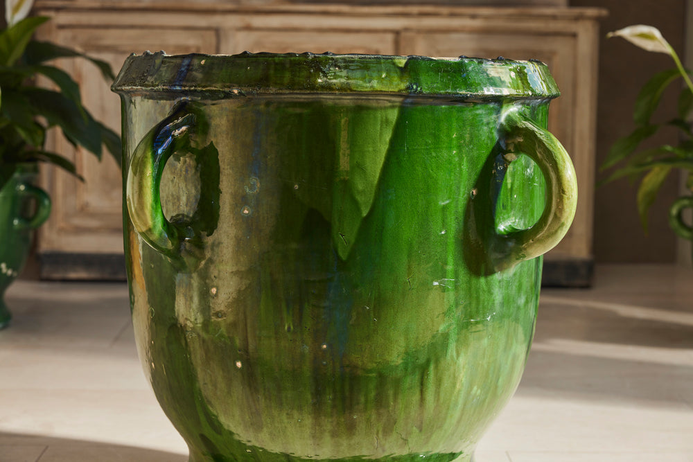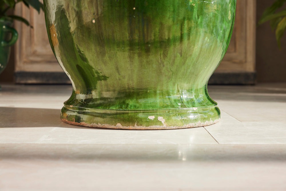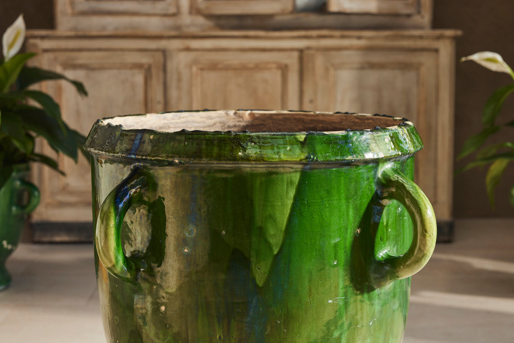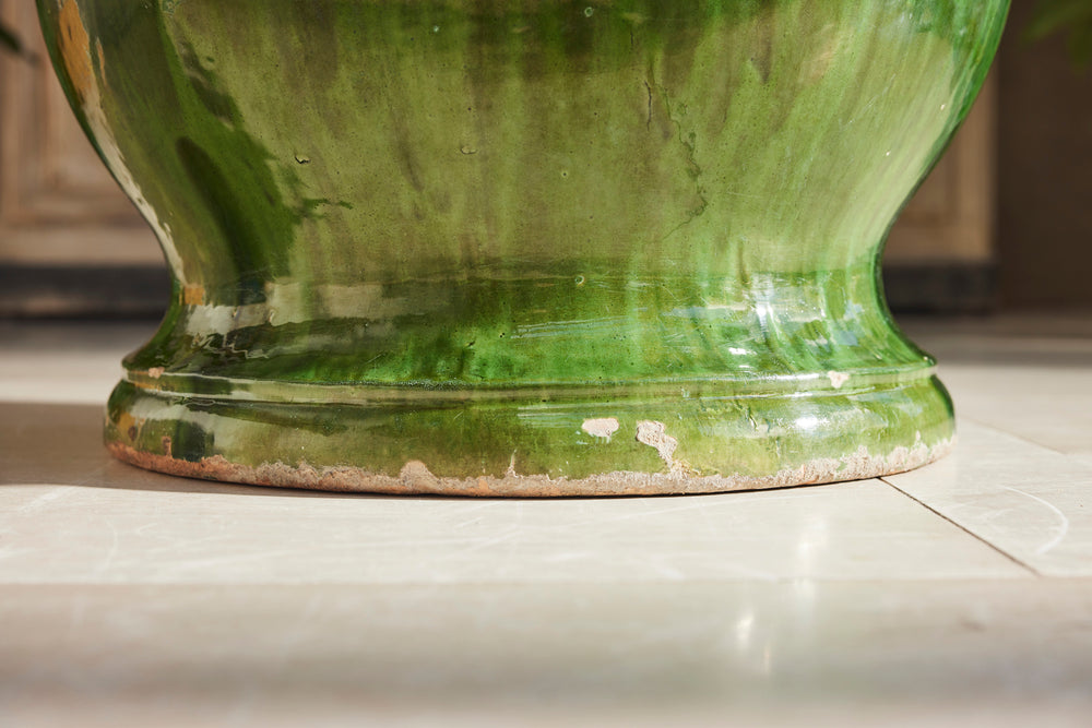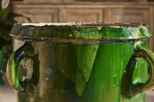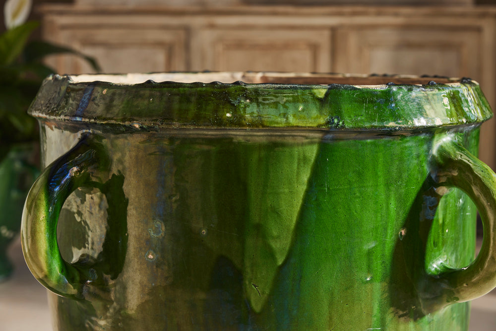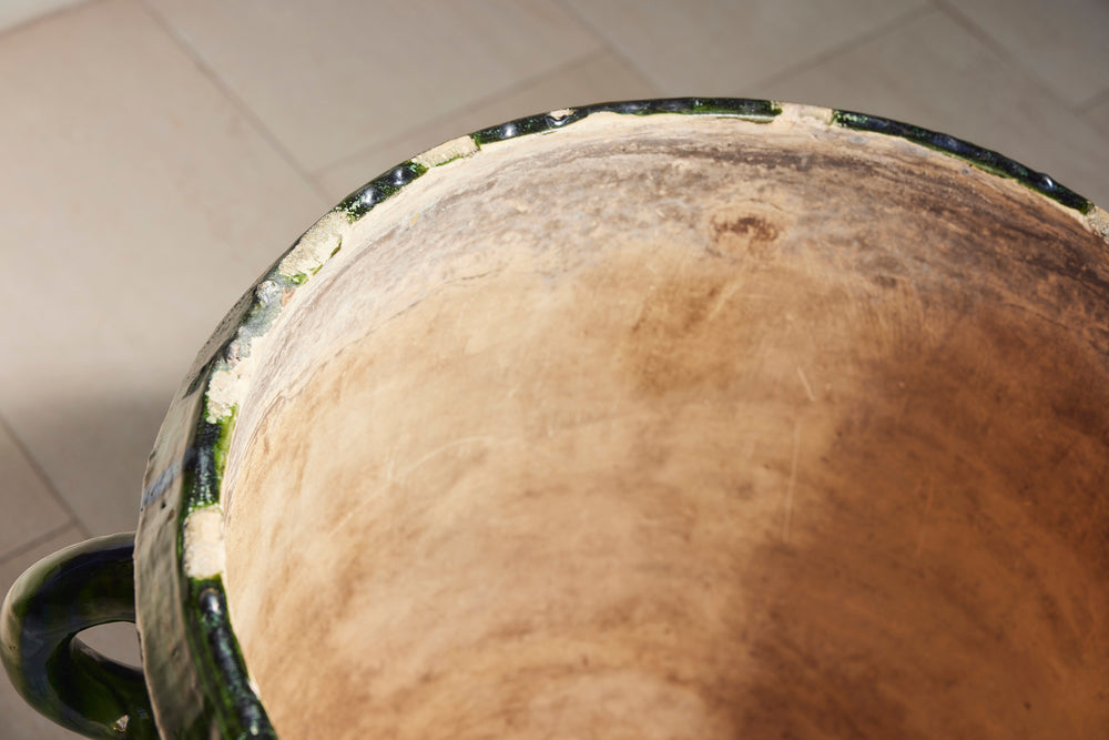 A very large mid-19th-century terracotta urn with a beautiful green glaze, increasingly rare to find—especially in such excellent condition. Handmade in the village of Castelnaudary in the South of France, it was originally used for storing and transporting olive oil or seeds. The large handles would have allowed a rope to be threaded through for easy loading onto ships or wagons. A stunning piece of history that would make a stylish focal point in any home.