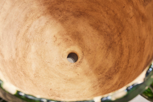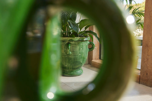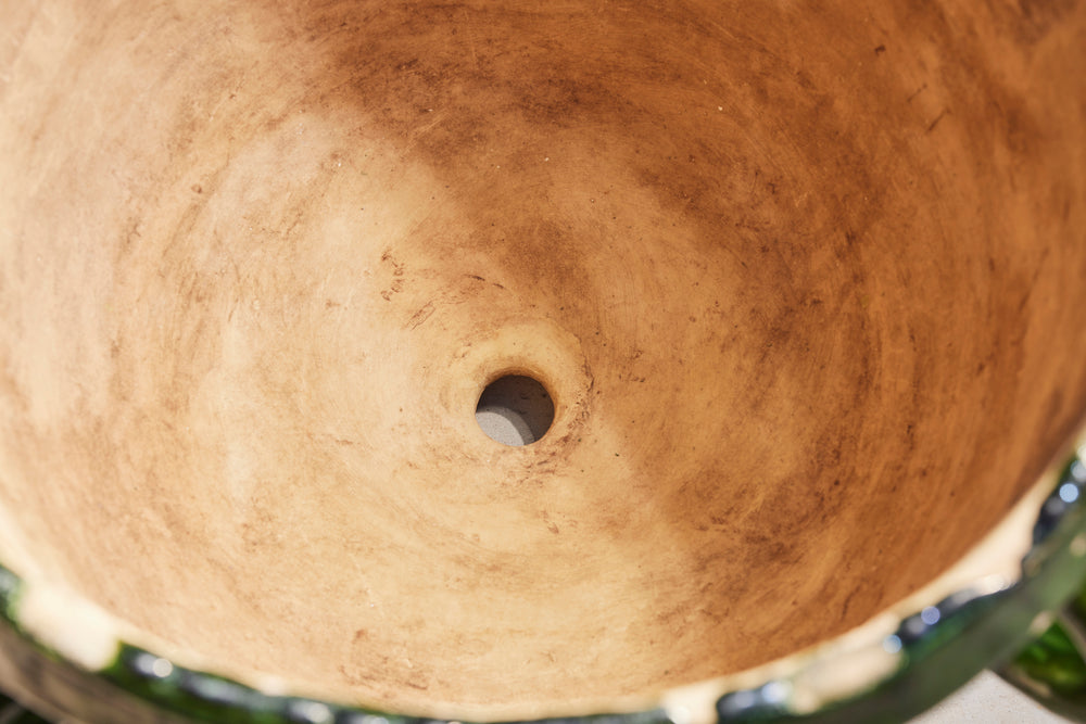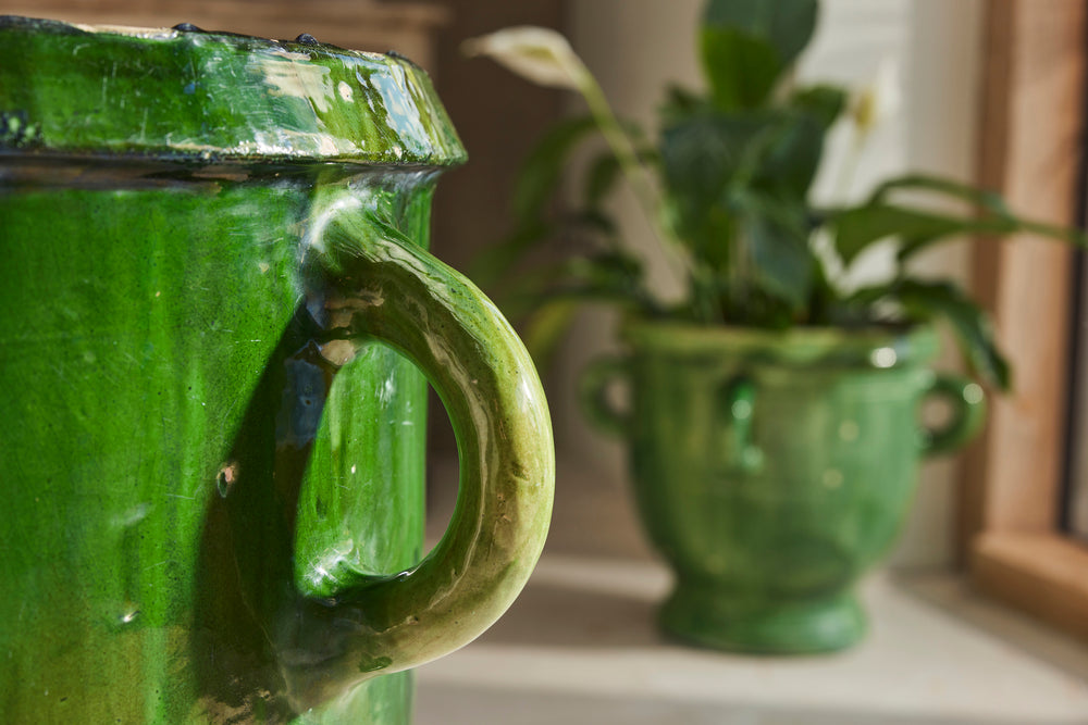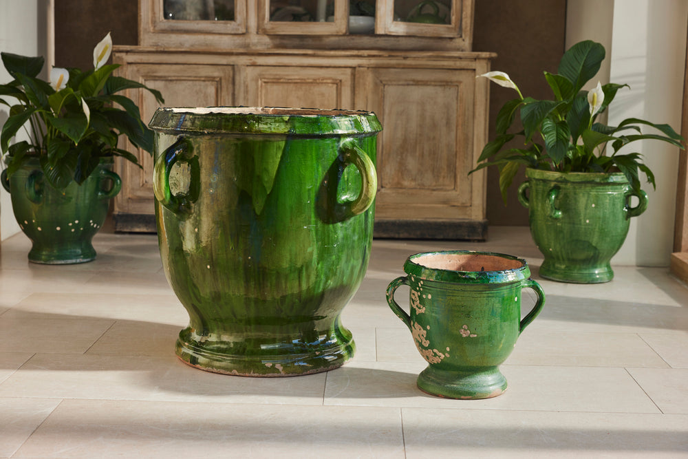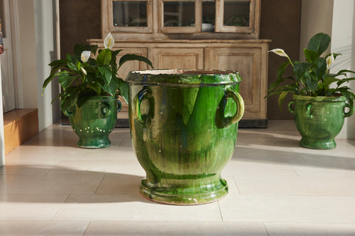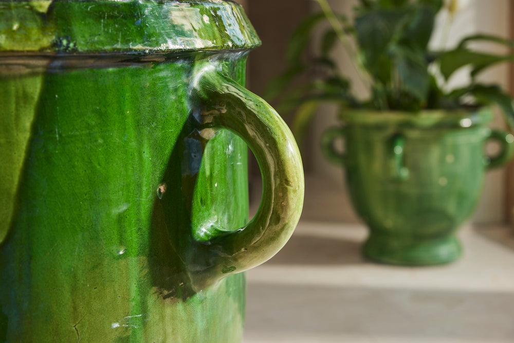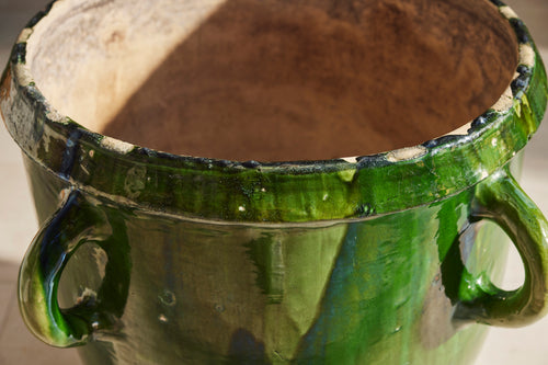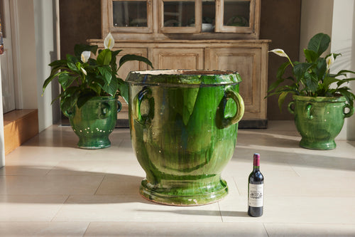A very large mid-19th-century terracotta urn with a beautiful green glaze, increasingly rare to find—especially in such excellent condition. Handmade in the village of Castelnaudary in the South of France, it was originally used for storing and transporting olive oil or seeds. The large handles would have allowed a rope to be threaded through for easy loading onto ships or wagons. A stunning piece of history that would make a stylish focal point in any home.