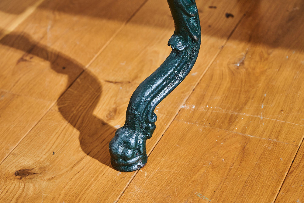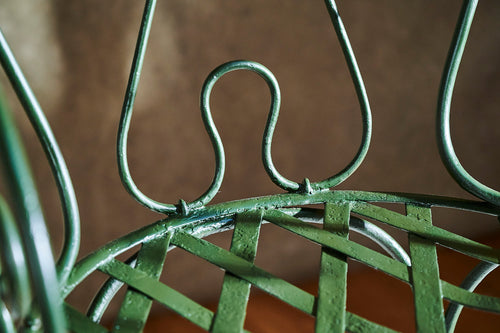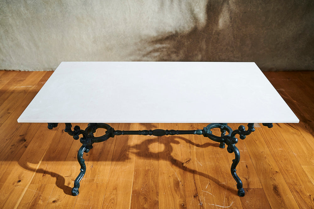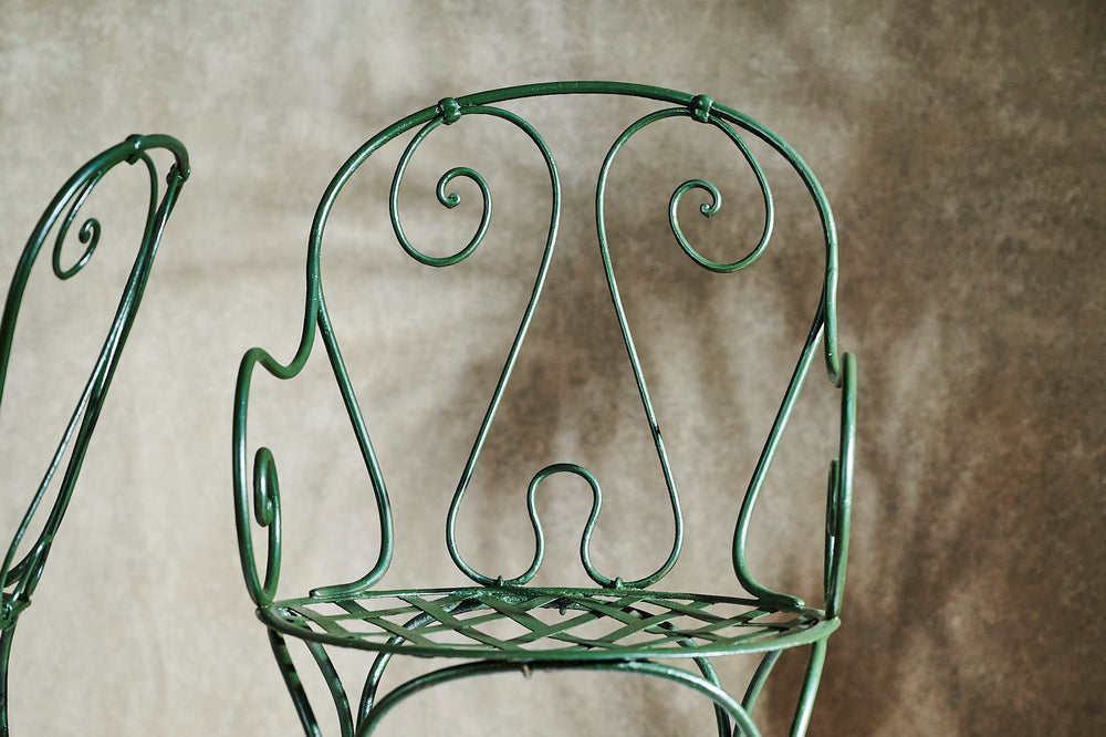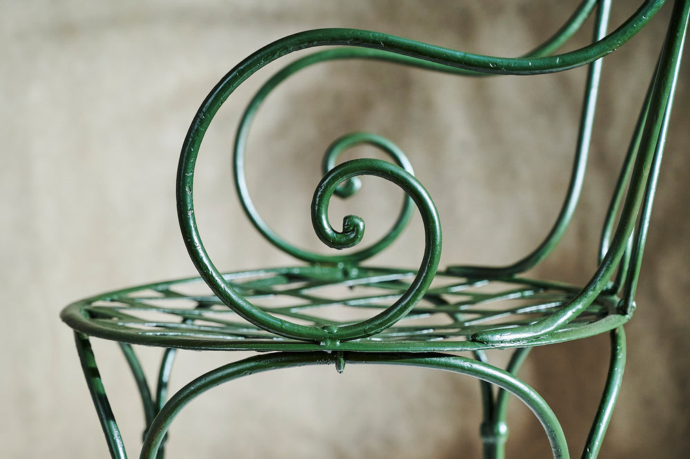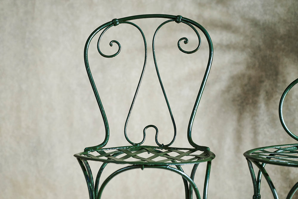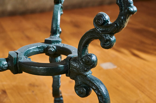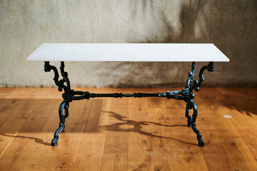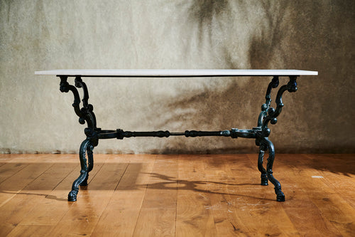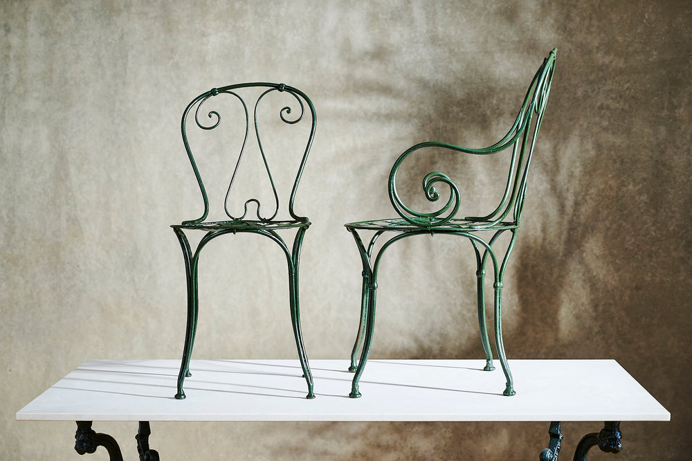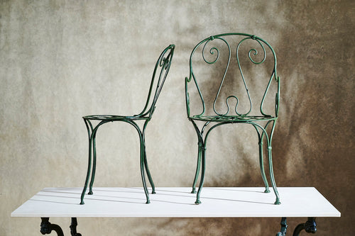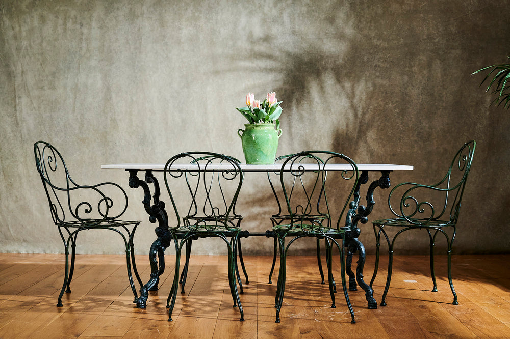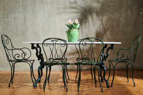 A very attractive early 20th-century garden set featuring a wrought iron table with a marble top and six chairs including two armchairs. We bought the table on a trip to Umbria in central Italy where it had seen better days. Now in very good condition having been fully restored by us including the addition of a new marble top this table would make the ideal outdoor dining with family and friends.
