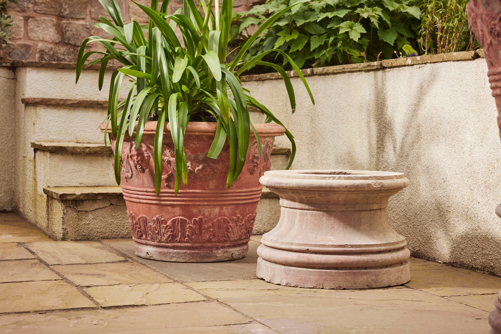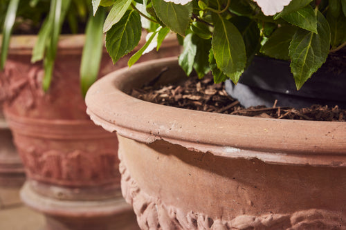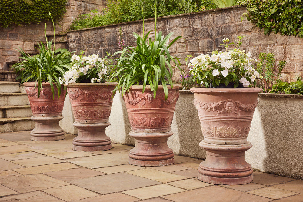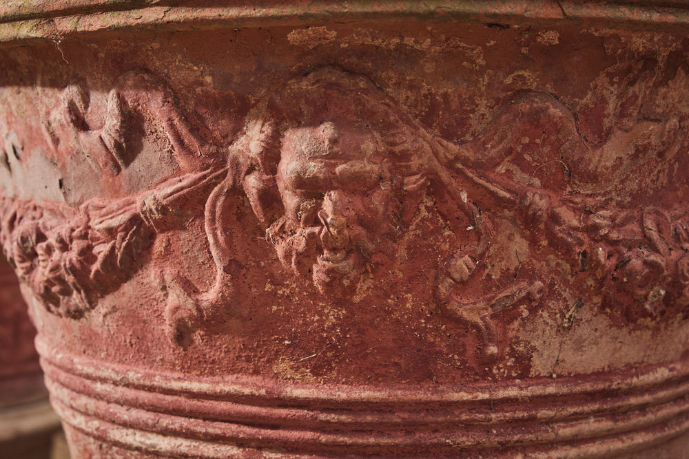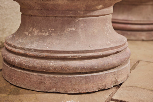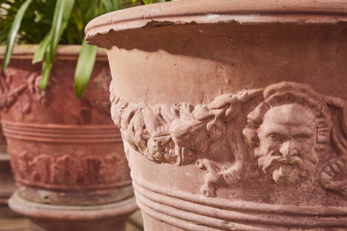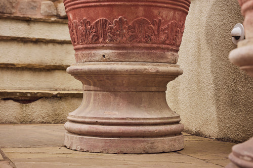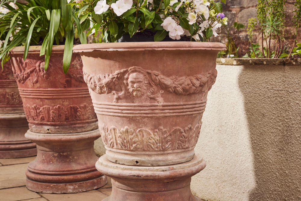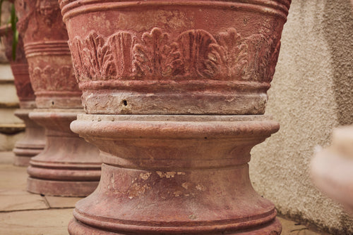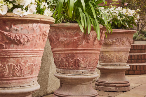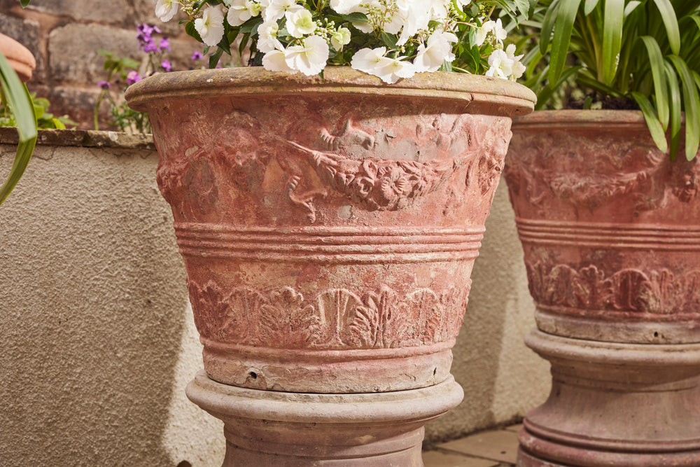 These mid 19th century terracotta planters which each sit on their own separate pedestals are really special and a rare find. They made in Bologna in Northern Italy and are in very good condition. They are very attractive in their own right with the traditional deep red terracotta, featuring garlands, leaves and motifs on the body. We imagine them looking fantastic lining the edge of a patio or pathway flowing with seasonal flowers and plants.